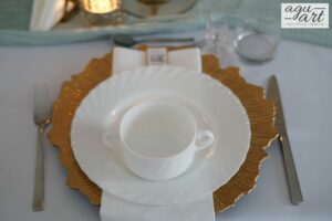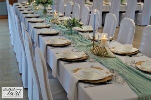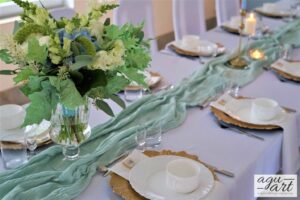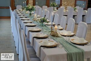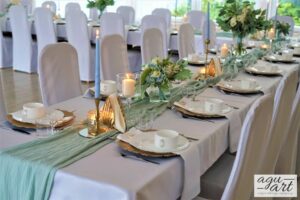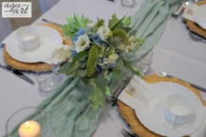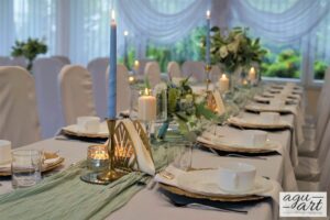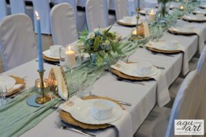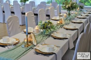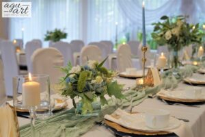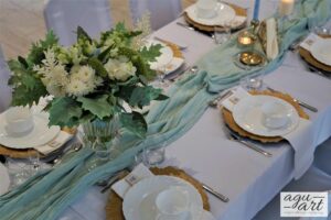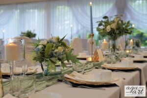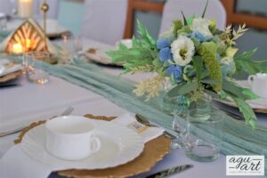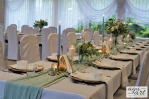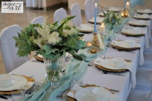 Dekoracja na chrzest- Miętą i błękitem pisane to dekoracja okazjonalna przygotowana przez nas na Chrzest Święty Norberta. Coraz częściej nasze imprezy rodzinne nabierają rozmachu. Chcemy, by te najważniejsze chwile w życiu naszym i naszych pociech były świętowane w gronie całej rodziny. Uroczystość Chrztu świętego była przewidziana na 40 osób, dlatego nasi klienci zdecydowali się na zorganizowanie przyjęcia w restauracji na Kaszubach. Kolorem przewodnim stała się mięta i błękit. Kolory przewodnie przejawiały się zarówno w lejącym się przez cały stół materiale oraz kwiatach świeczkach czy balonach zawieszonych na złotym ringu. Cała uroczystość miała mieć klasę i styl, by podnieść range wydarzenia. Piękne kwiaty sprawiały, że cała dekoracja zachwycała swoją malowniczością. Pastele, złote dodatki i światła świec ocieplały klimat i nadawały wnętrzu wrażenia przytulności.