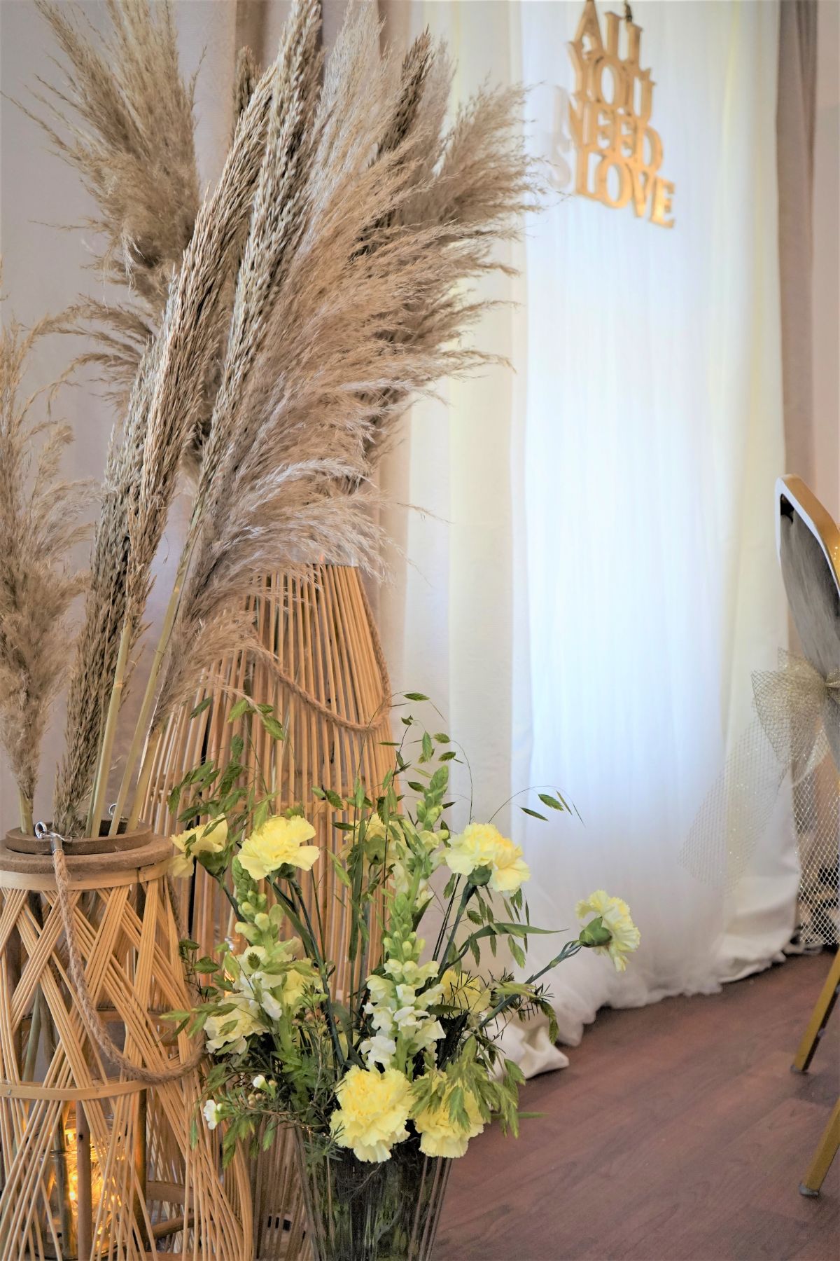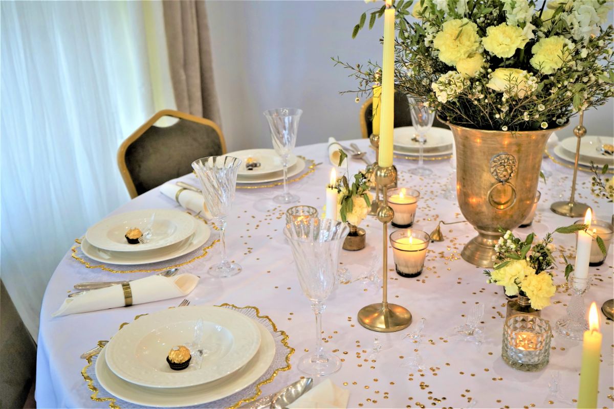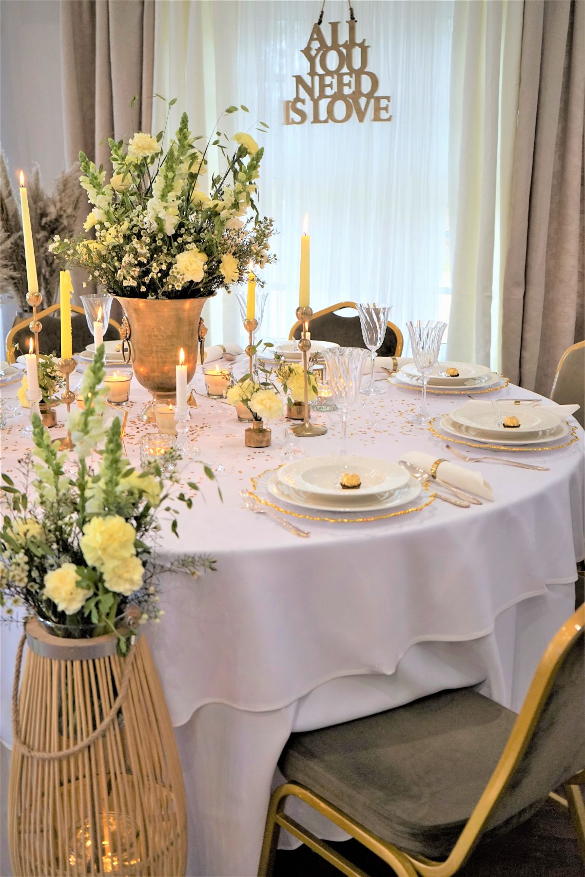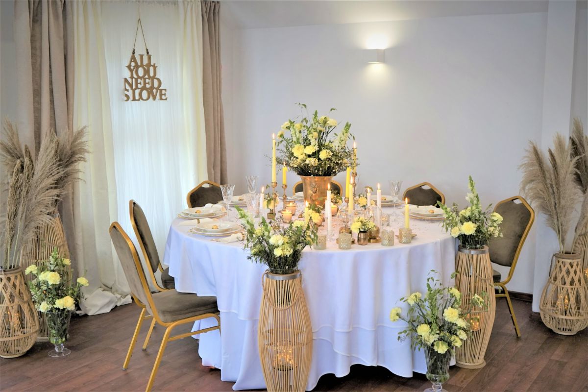 W Restauracji Nad Jeziorem Jeleń stworzyliśmy dekorację w kolorze cytrynowym. Inspirację kolorystyczną dała nam rozkrojona cytryna która była niezwykle świeża i orzeźwiająca jak nasza dekoracja. Cytrynowy kolor kwiatów oraz wszystkich dodatków, działał na klientów i ich gości jak letnie opadające promienie słoneczne. Dekoracja wprowadzała wszystkich w sielski, słoneczny nastrój. Złote dodatki nadawały elegancji i podniosłości chwili. Trawy Pampasowe oraz bambusowe lampiony dodaliśmy jako przełamanie stylu glamour.