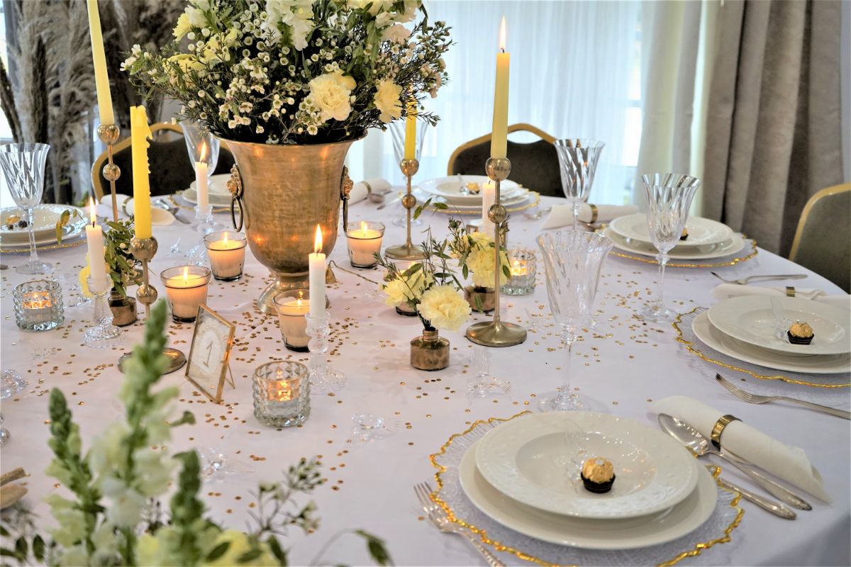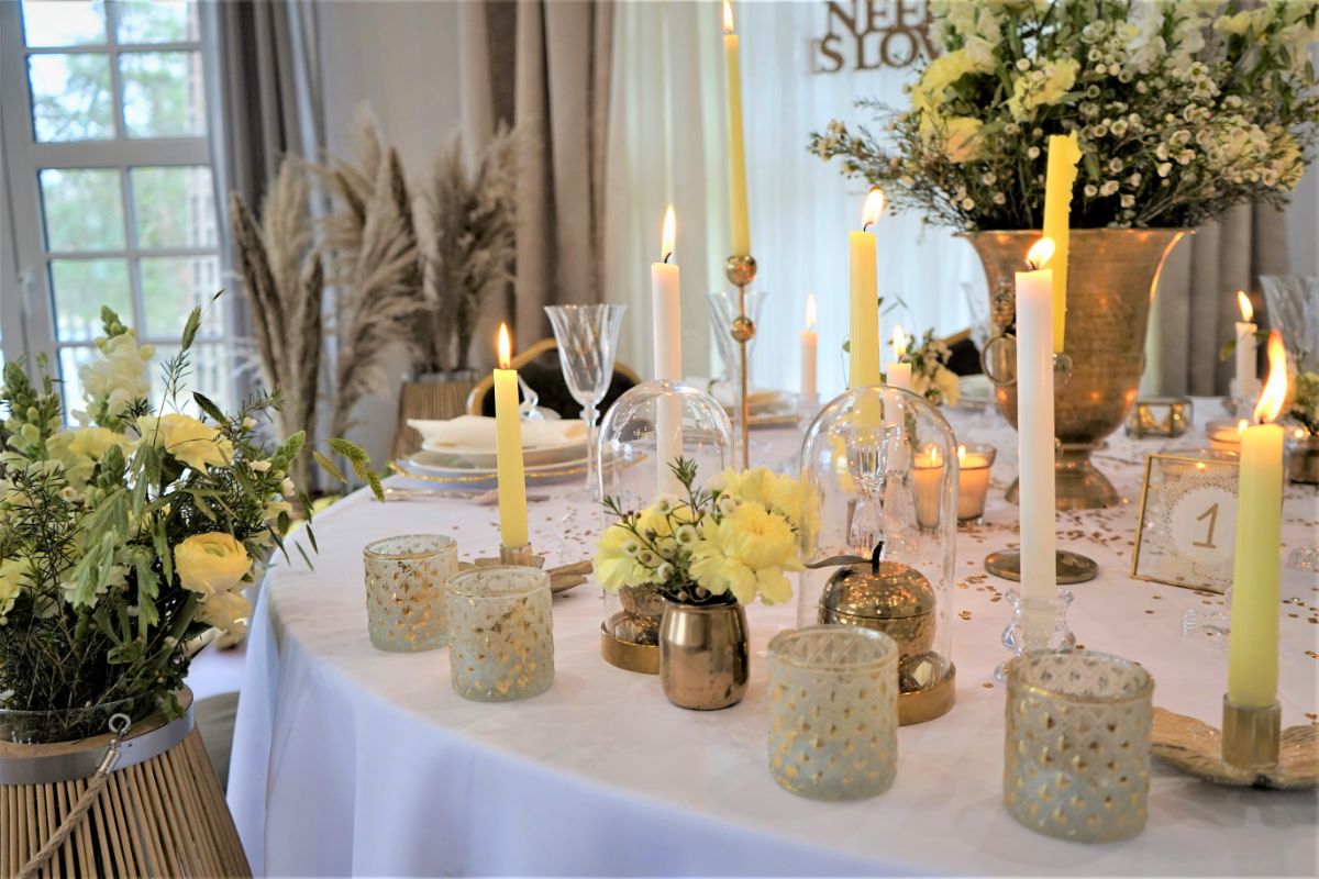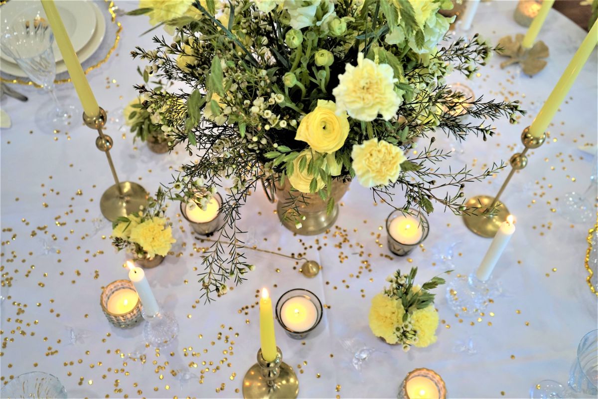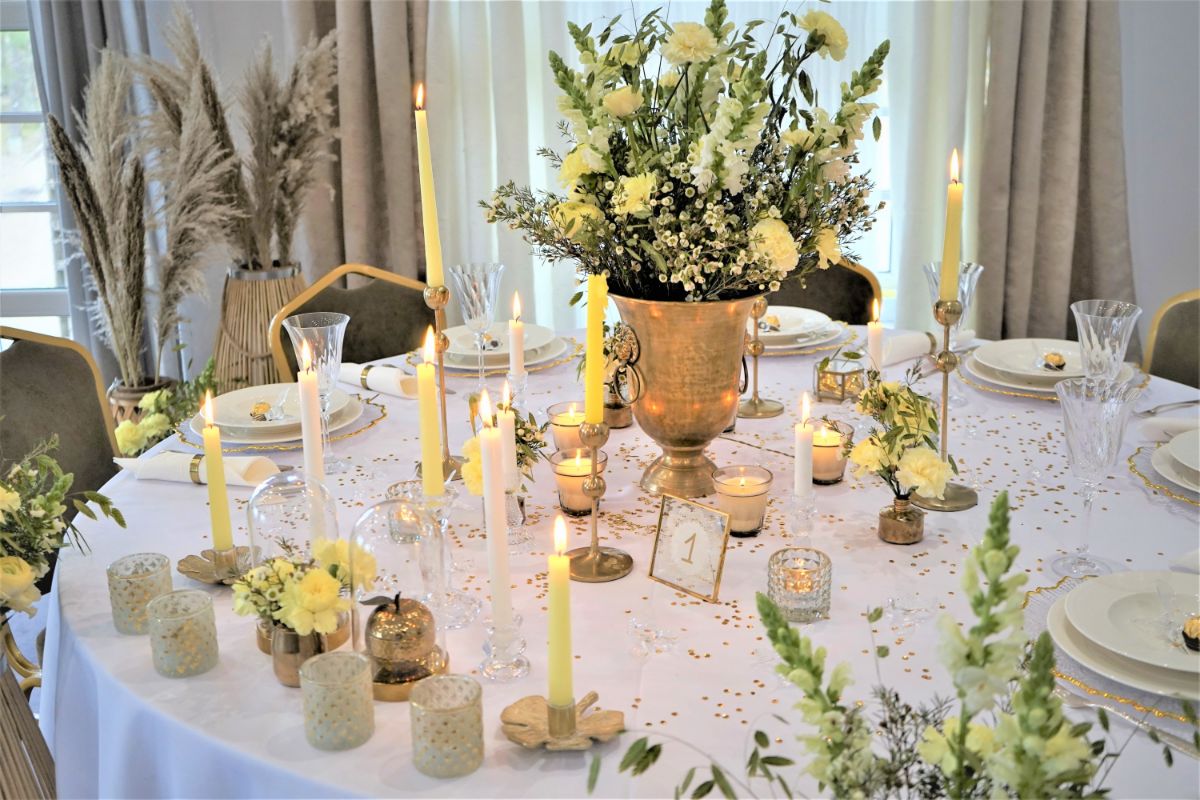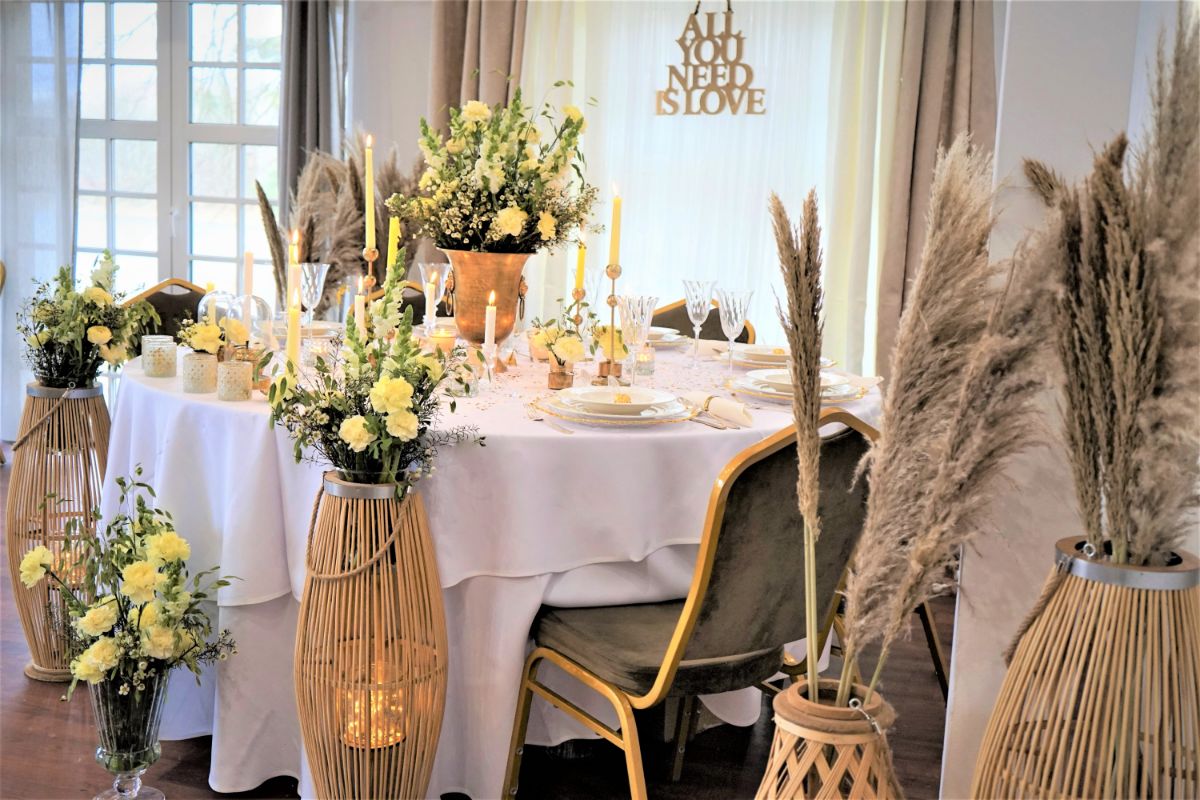 W Restauracji Nad Jeziorem Jeleń stworzyliśmy dekorację w kolorze cytrynowym. Inspirację kolorystyczną dała nam rozkrojona cytryna która była niezwykle świeża i orzeźwiająca jak nasza dekoracja. Cytrynowy kolor kwiatów oraz wszystkich dodatków, działał na klientów i ich gości jak letnie opadające promienie słoneczne. Dekoracja wprowadzała wszystkich w sielski, słoneczny nastrój. Złote dodatki nadawały elegancji i podniosłości chwili. Trawy Pampasowe oraz bambusowe lampiony dodaliśmy jako przełamanie stylu glamour.