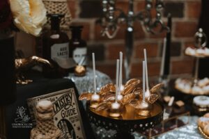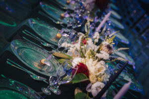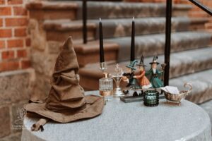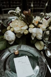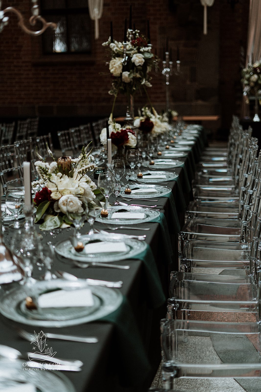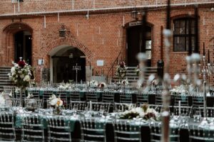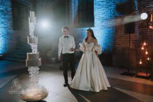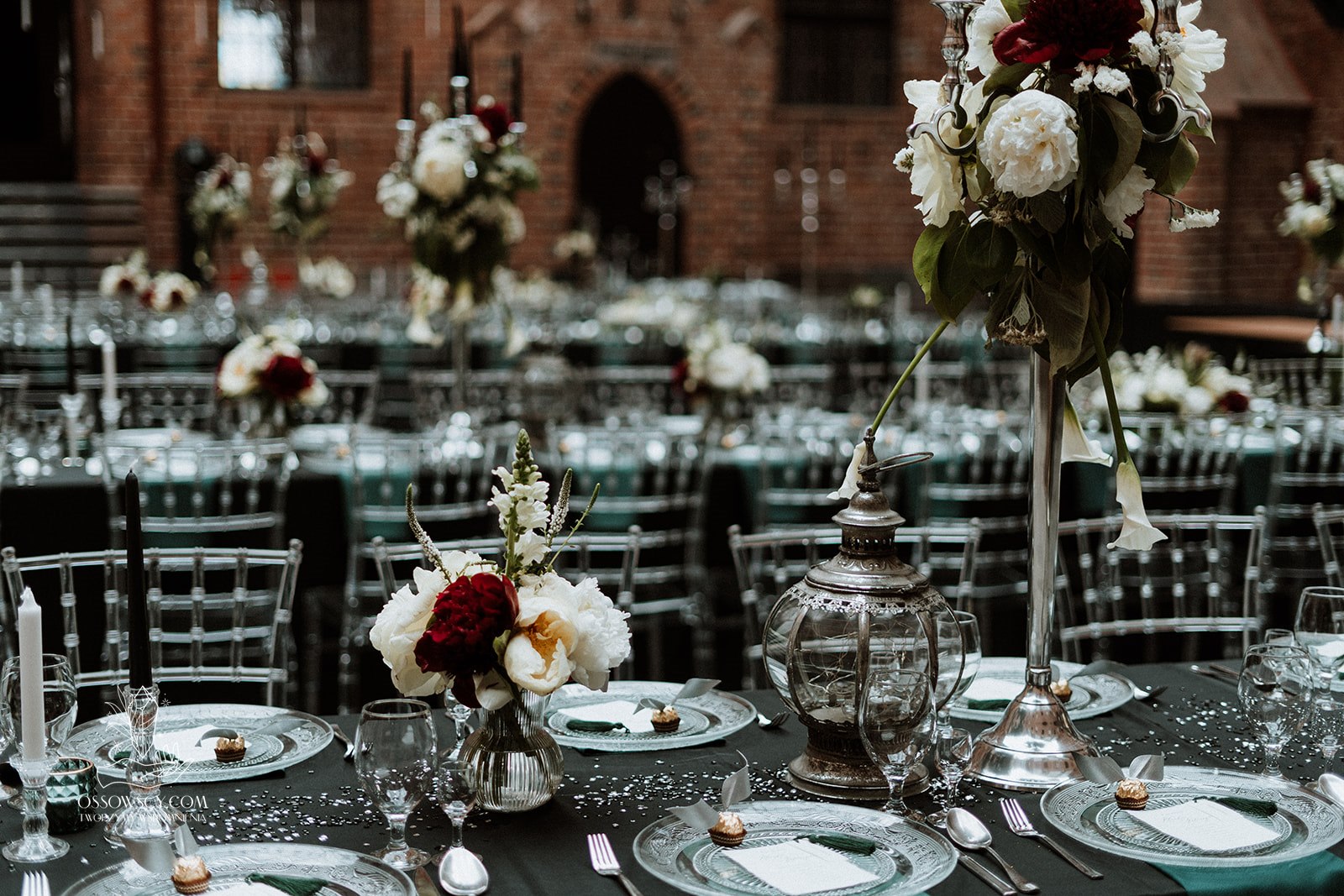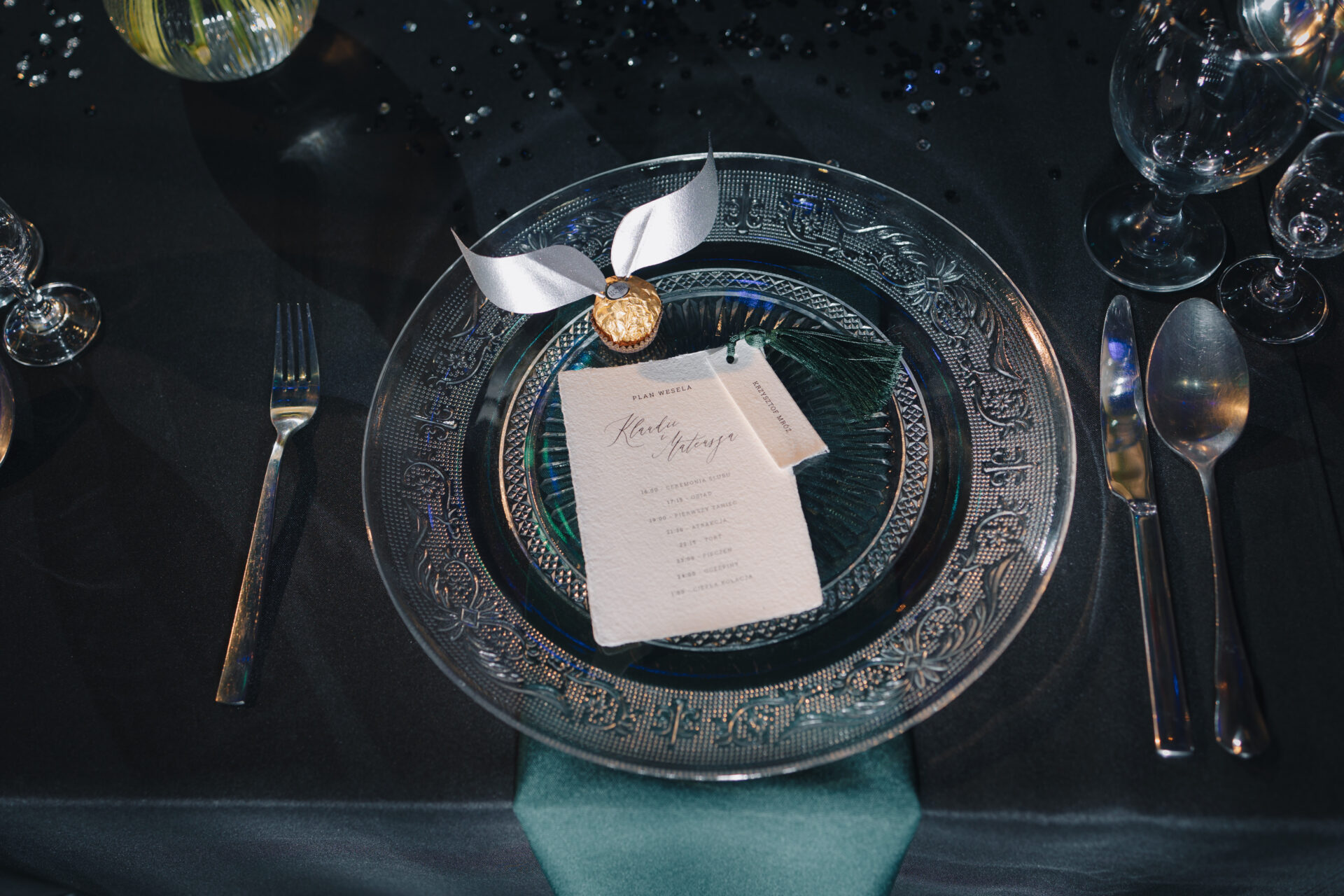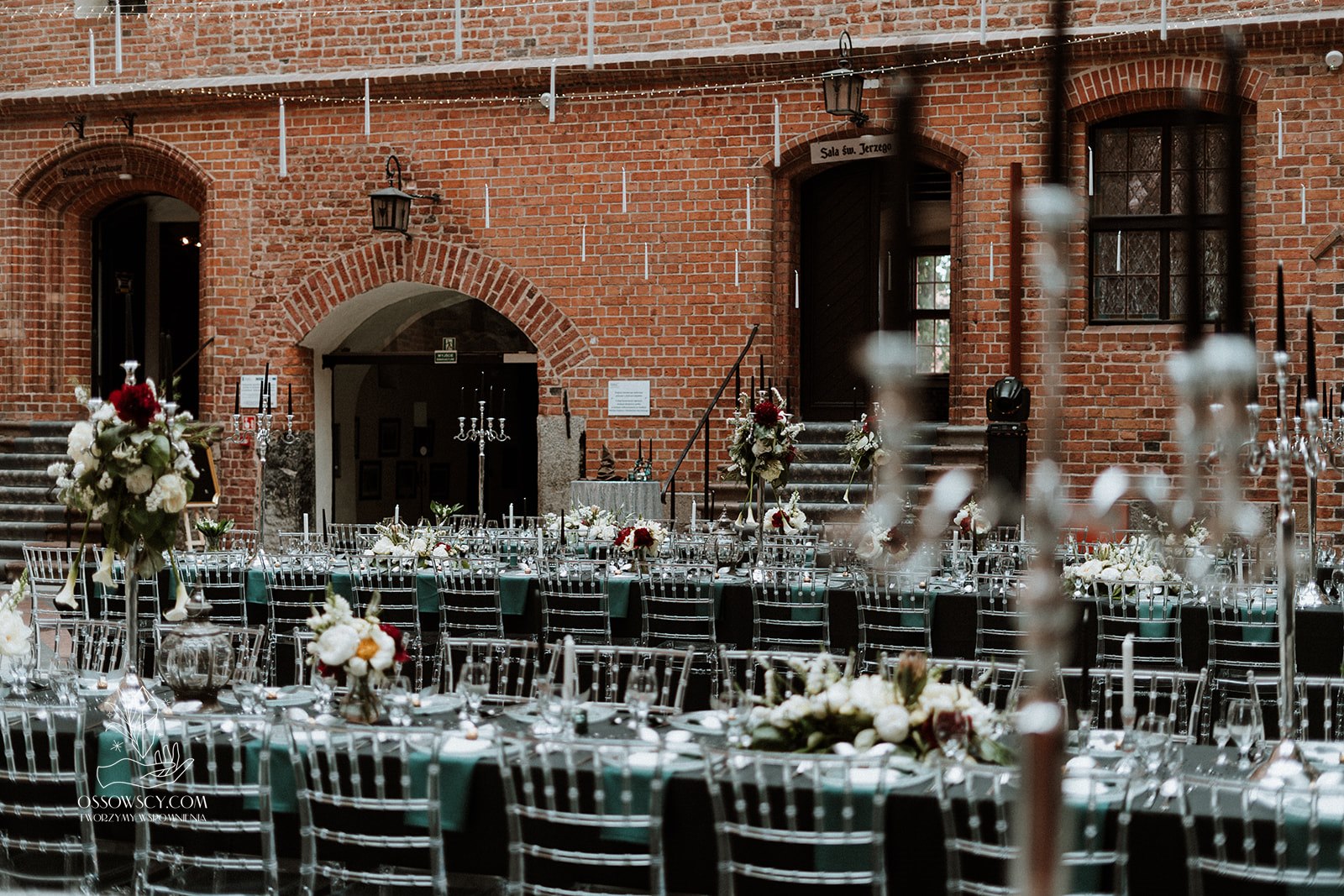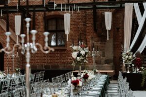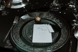 Dekoracja ślubna- Magią pisane to projekt scenografii ślubnej, którą przygotowaliśmy dla Klaudii i Mateusza na dziedzińcu zamku w Gniewie. Cała aranżacja ślubna utrzymana w czerni, srebrze, zieleni z wyraźnym akcentem kryształu. Inspiracja do dekoracji ślubnej- Magią pisane były książki Harrego Pottera, którego szczerymi fanami byli nasi klienci. Motyw przewodni Harrego Pottera na weselu był idealnym wyborem, chociażby ze względu na przestrzeń Zamku w Gniewie, która jest iście magiczna. Zdecydowanie to wesele jest jednym z tych luksusowych. Stoły ustawione na wzór stołów w Wielkiej sali w Hogwarcie. Nad stołami lewitujące świece. Czarne obrusy, butelko-zielone serwety, kryształowe pod-talerze, transparentne krzesła chiavari oraz wysokie srebrne kandelabry z czarnymi świecami. Do tego należy wspomnieć piękną papeterię wykonaną na papierze czerpanym. Na uwagę zasługują również kompozycje florystyczne na stołach w dwóch poziomach tworząc piękny trójwymiar przestrzeni. Dobrane oświetlenie architektoniczne wprawia w magiczny nastrój. Do tego wszystkiego idealnie dobrany charakter słodkiego stołu przygotowanego przez Cukiernię Wenę. Bukiet ślubny z kally i konwalii przyciągał uwagę i dodawał jeszcze większej elegancji i luksusu całości. Ślub Klaudi i Mateusza na zamku to luksusowa uroczystość, delikatnie przepełniona magią i baśnią.