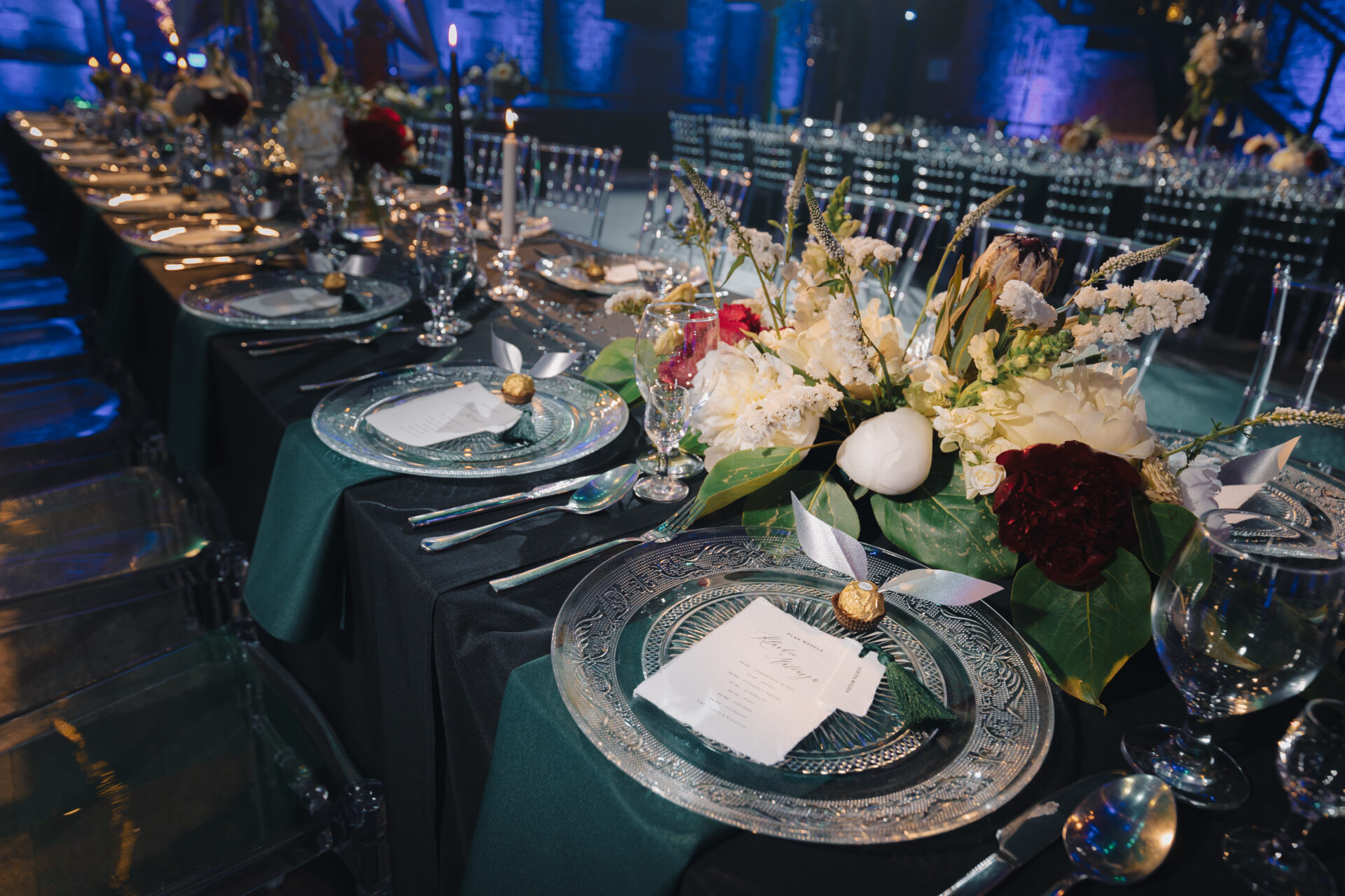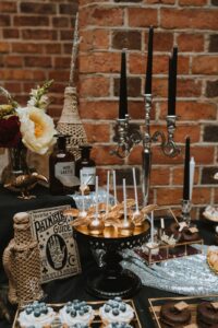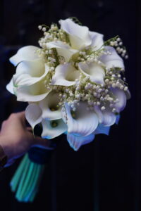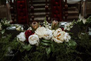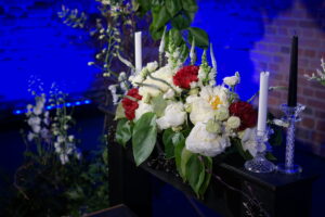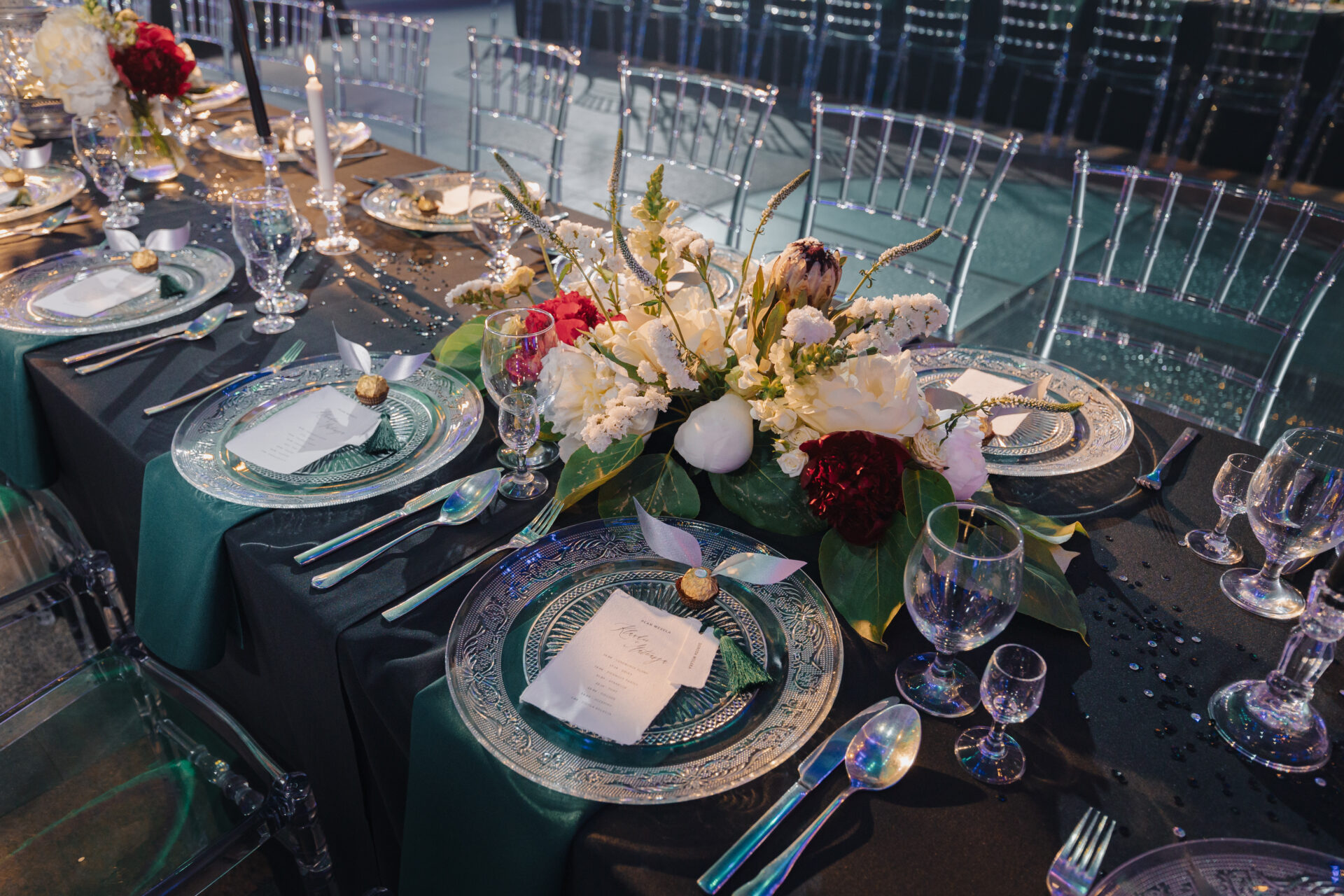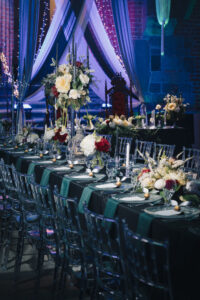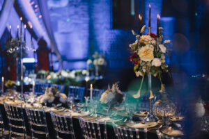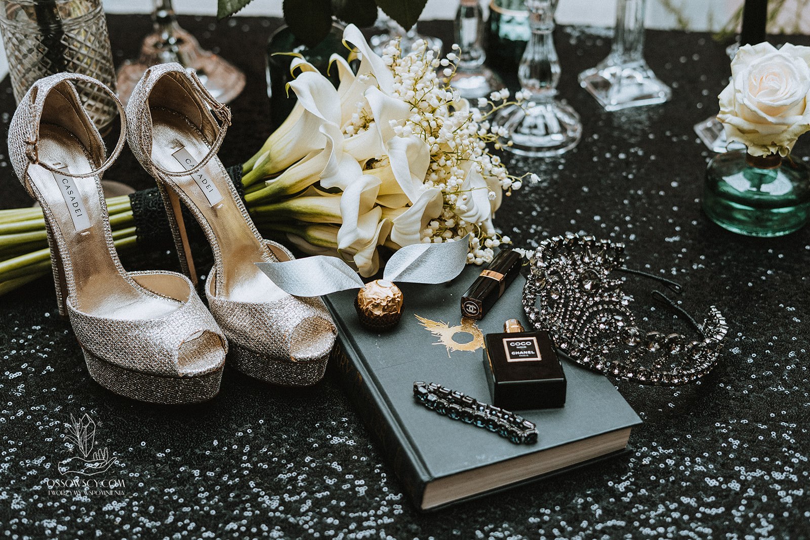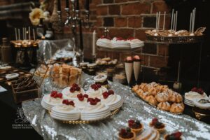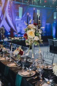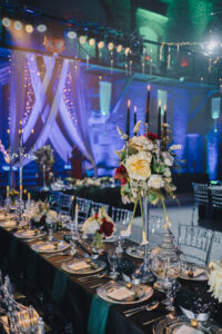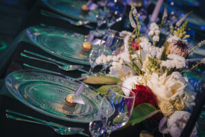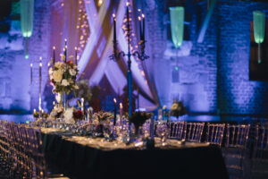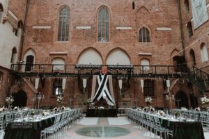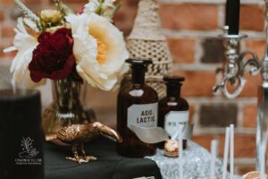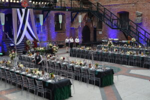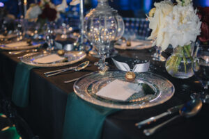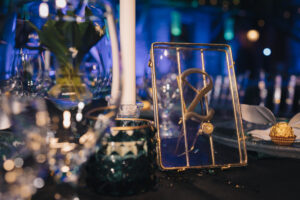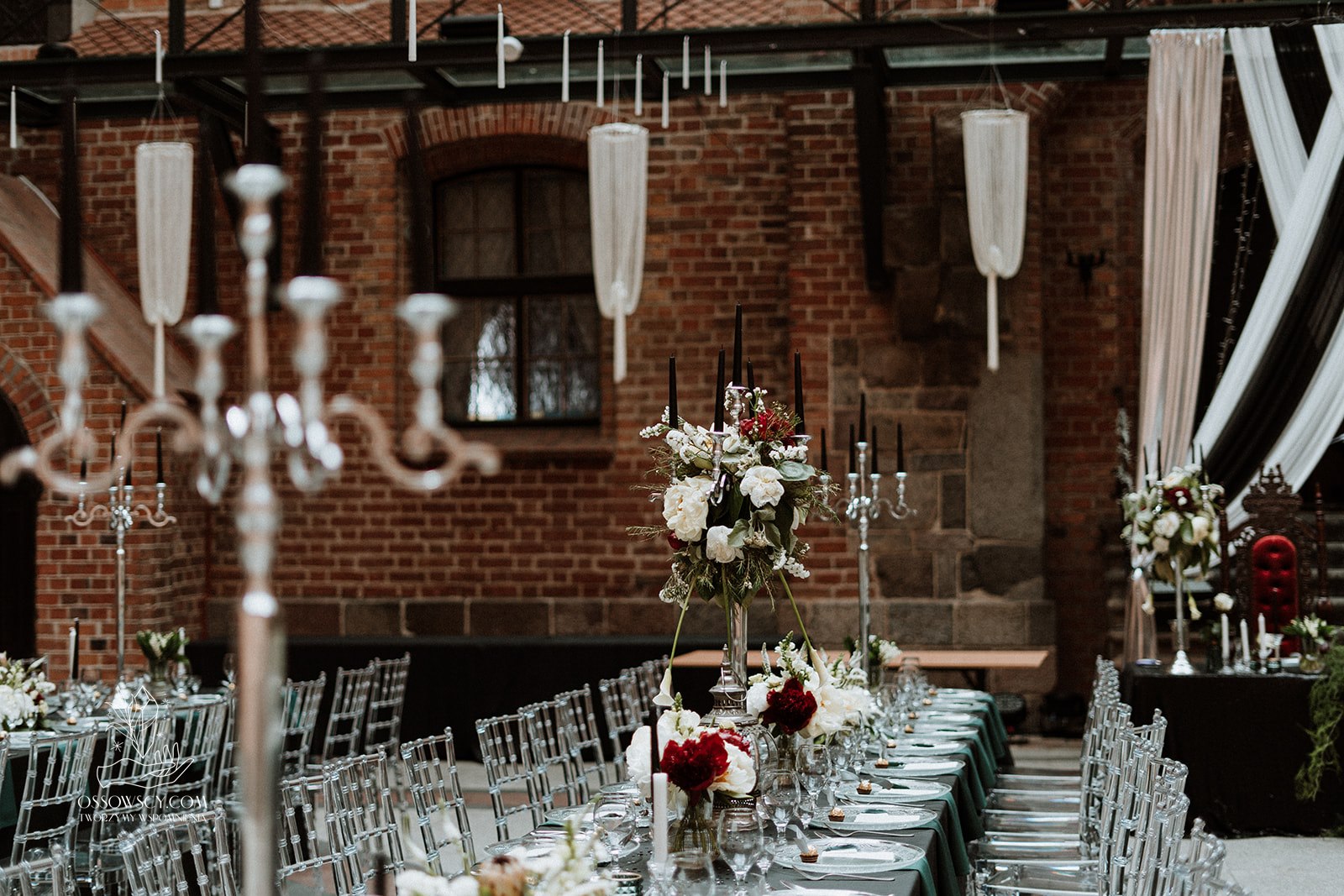 Dekoracja ślubna- Magią pisane to projekt scenografii ślubnej, którą przygotowaliśmy dla Klaudii i Mateusza na dziedzińcu zamku w Gniewie. Cała aranżacja ślubna utrzymana w czerni, srebrze, zieleni z wyraźnym akcentem kryształu. Inspiracja do dekoracji ślubnej- Magią pisane były książki Harrego Pottera, którego szczerymi fanami byli nasi klienci. Motyw przewodni Harrego Pottera na weselu był idealnym wyborem, chociażby ze względu na przestrzeń Zamku w Gniewie, która jest iście magiczna. Zdecydowanie to wesele jest jednym z tych luksusowych. Stoły ustawione na wzór stołów w Wielkiej sali w Hogwarcie. Nad stołami lewitujące świece. Czarne obrusy, butelko-zielone serwety, kryształowe pod-talerze, transparentne krzesła chiavari oraz wysokie srebrne kandelabry z czarnymi świecami. Do tego należy wspomnieć piękną papeterię wykonaną na papierze czerpanym. Na uwagę zasługują również kompozycje florystyczne na stołach w dwóch poziomach tworząc piękny trójwymiar przestrzeni. Dobrane oświetlenie architektoniczne wprawia w magiczny nastrój. Do tego wszystkiego idealnie dobrany charakter słodkiego stołu przygotowanego przez Cukiernię Wenę. Bukiet ślubny z kally i konwalii przyciągał uwagę i dodawał jeszcze większej elegancji i luksusu całości. Ślub Klaudi i Mateusza na zamku to luksusowa uroczystość, delikatnie przepełniona magią i baśnią.