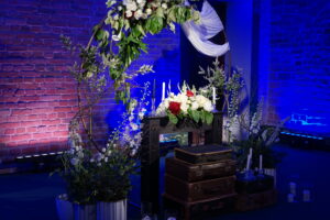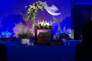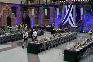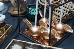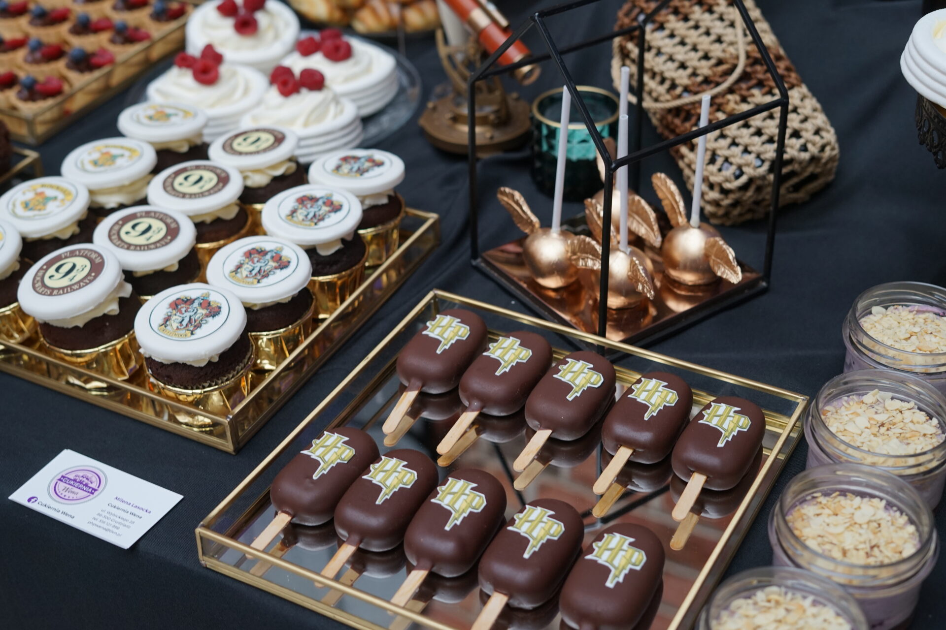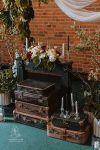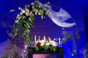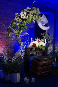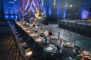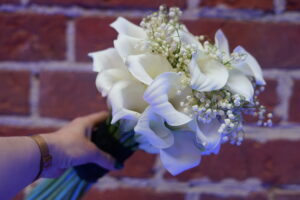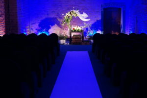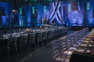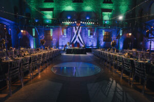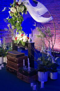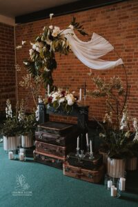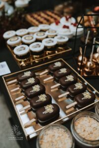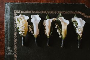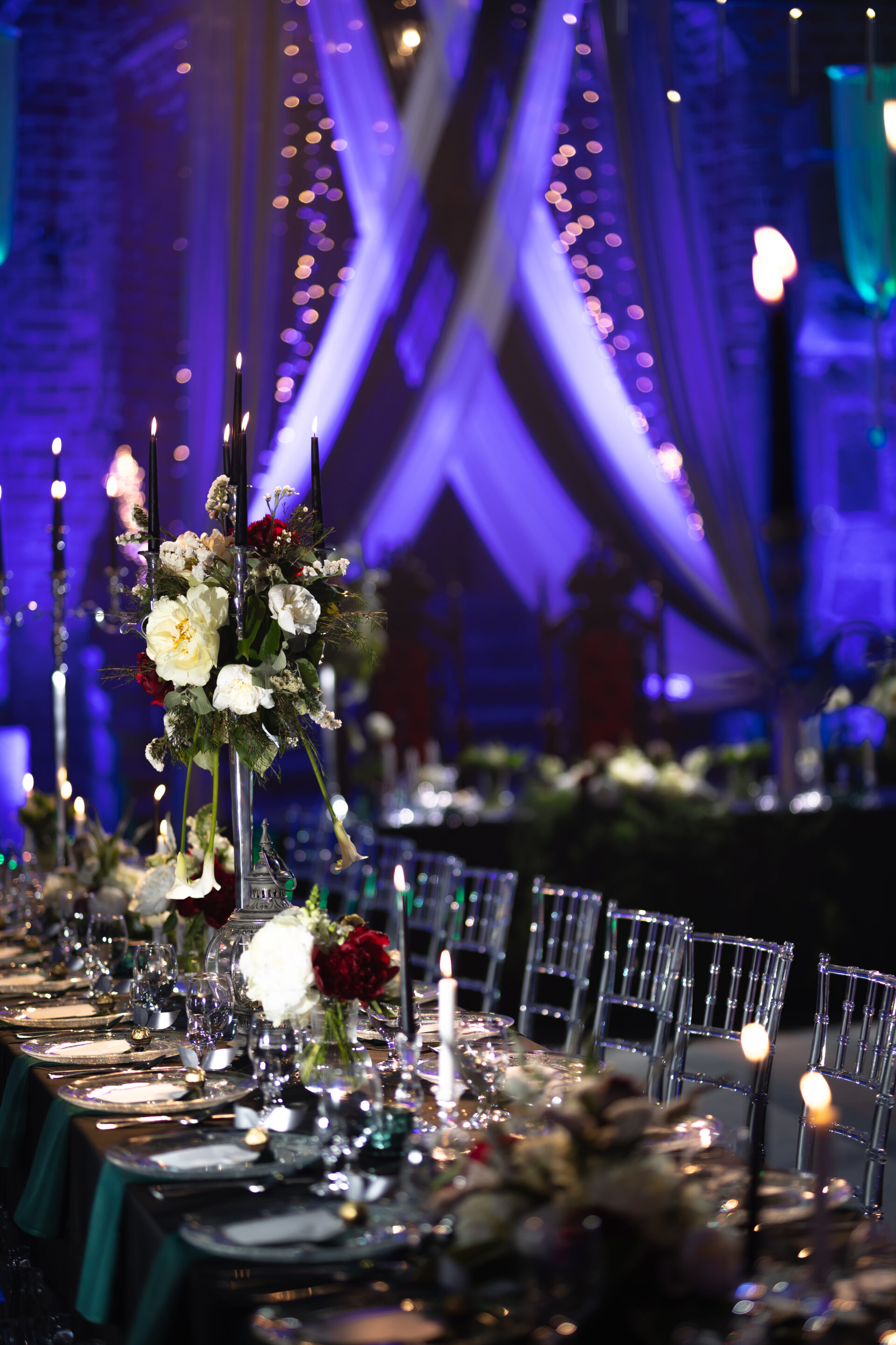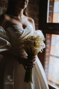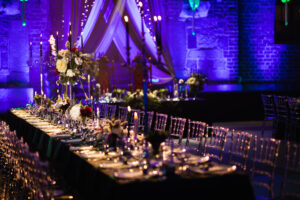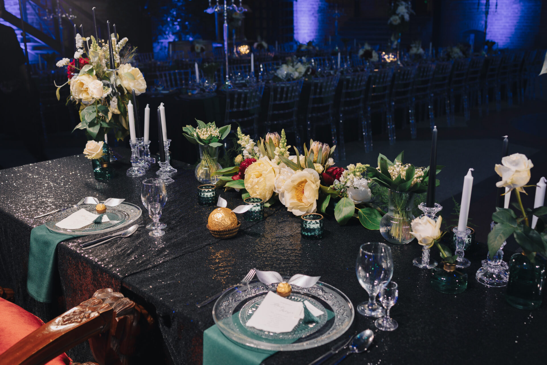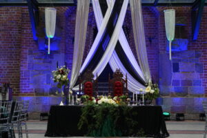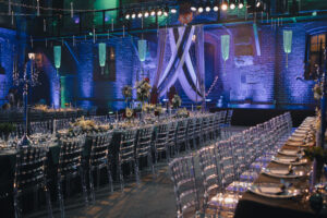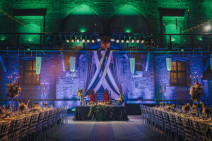 Dekoracja ślubna- Magią pisane to projekt scenografii ślubnej, którą przygotowaliśmy dla Klaudii i Mateusza na dziedzińcu zamku w Gniewie. Cała aranżacja ślubna utrzymana w czerni, srebrze, zieleni z wyraźnym akcentem kryształu. Inspiracja do dekoracji ślubnej- Magią pisane były książki Harrego Pottera, którego szczerymi fanami byli nasi klienci. Motyw przewodni Harrego Pottera na weselu był idealnym wyborem, chociażby ze względu na przestrzeń Zamku w Gniewie, która jest iście magiczna. Zdecydowanie to wesele jest jednym z tych luksusowych. Stoły ustawione na wzór stołów w Wielkiej sali w Hogwarcie. Nad stołami lewitujące świece. Czarne obrusy, butelko-zielone serwety, kryształowe pod-talerze, transparentne krzesła chiavari oraz wysokie srebrne kandelabry z czarnymi świecami. Do tego należy wspomnieć piękną papeterię wykonaną na papierze czerpanym. Na uwagę zasługują również kompozycje florystyczne na stołach w dwóch poziomach tworząc piękny trójwymiar przestrzeni. Dobrane oświetlenie architektoniczne wprawia w magiczny nastrój. Do tego wszystkiego idealnie dobrany charakter słodkiego stołu przygotowanego przez Cukiernię Wenę. Bukiet ślubny z kally i konwalii przyciągał uwagę i dodawał jeszcze większej elegancji i luksusu całości. Ślub Klaudi i Mateusza na zamku to luksusowa uroczystość, delikatnie przepełniona magią i baśnią.