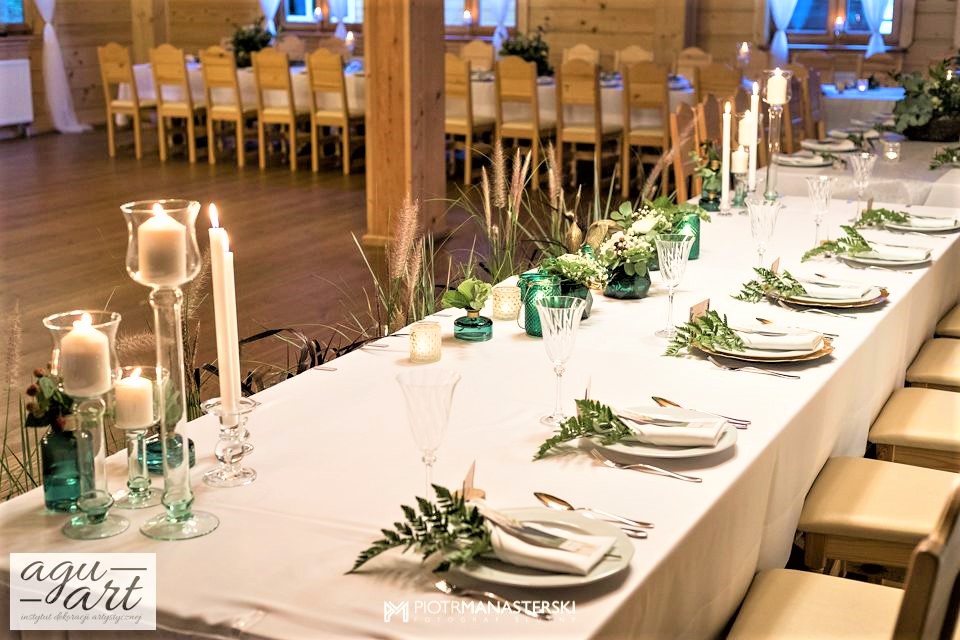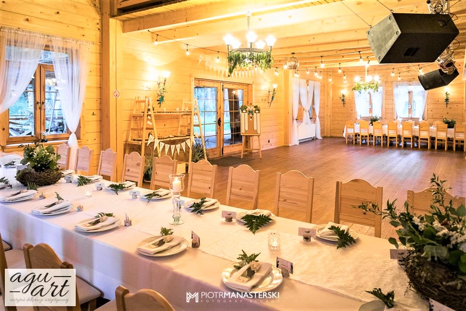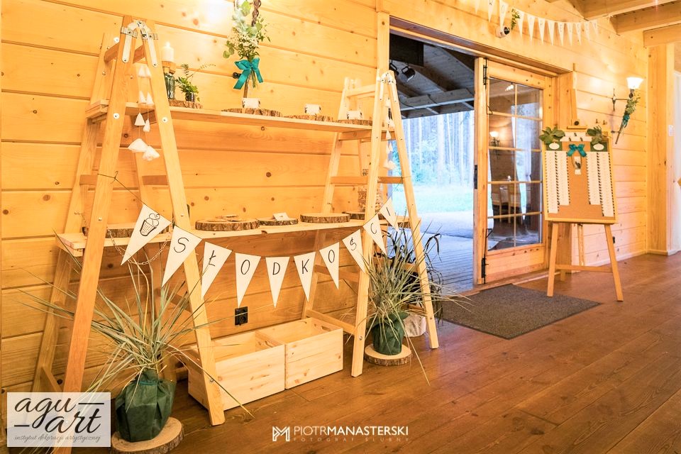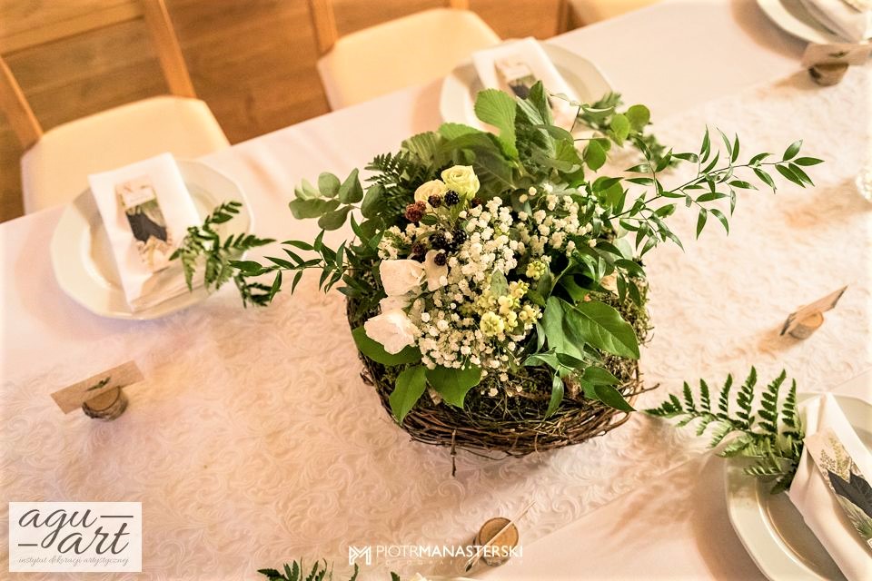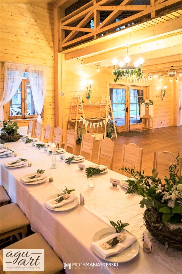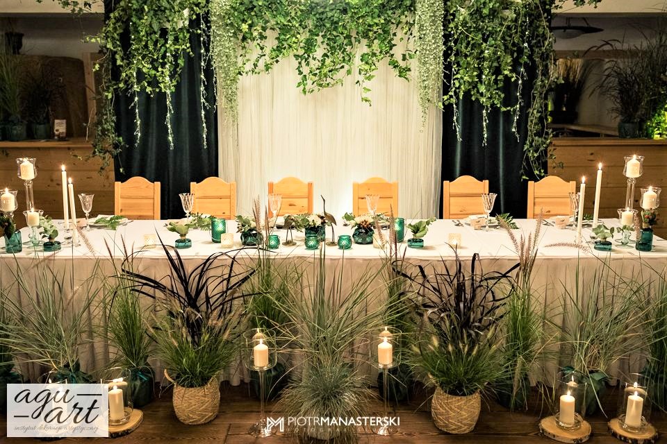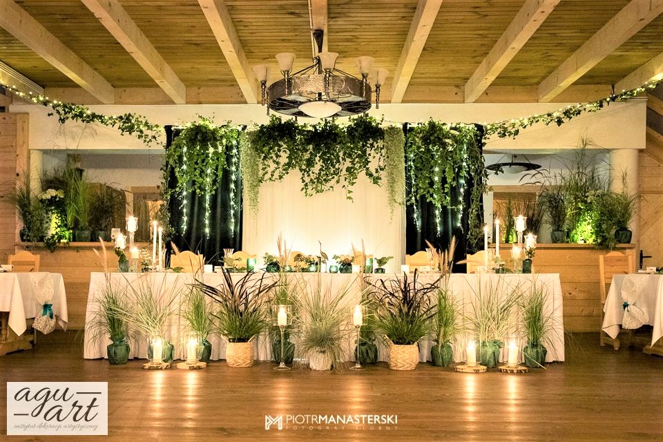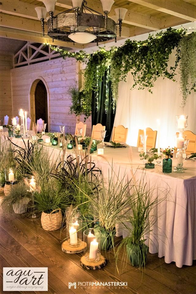 Niezwykła pod względem doboru roślin. Trawy, bluszcze, dzikie czereśnie, jeżyny oraz elegancka eustoma i zwiewna gipsówka wykończona eukaliptusem i paprociami przenoszą nas w iście leśny zakątek. Nasz zamysł to przenieść zewnątrz do wewnątrz. Sala prosta, ale w swej istocie bardzo elegancka i magiczna. Kolory zieleni doskonale podkreślają drewno, którym została wykończona. Wszystkie dodatki dobrane tak, by przypominały gościom, że wesele rozgrywa się w samym środku lasu nad malowniczym jeziorem.