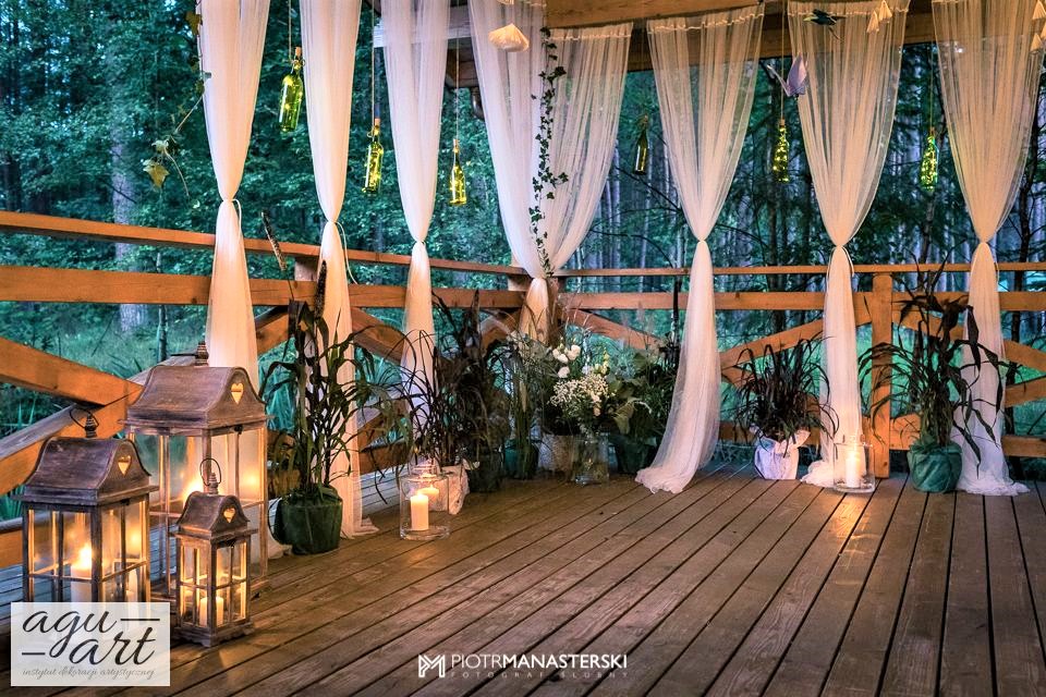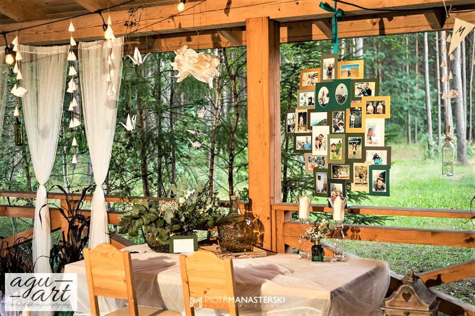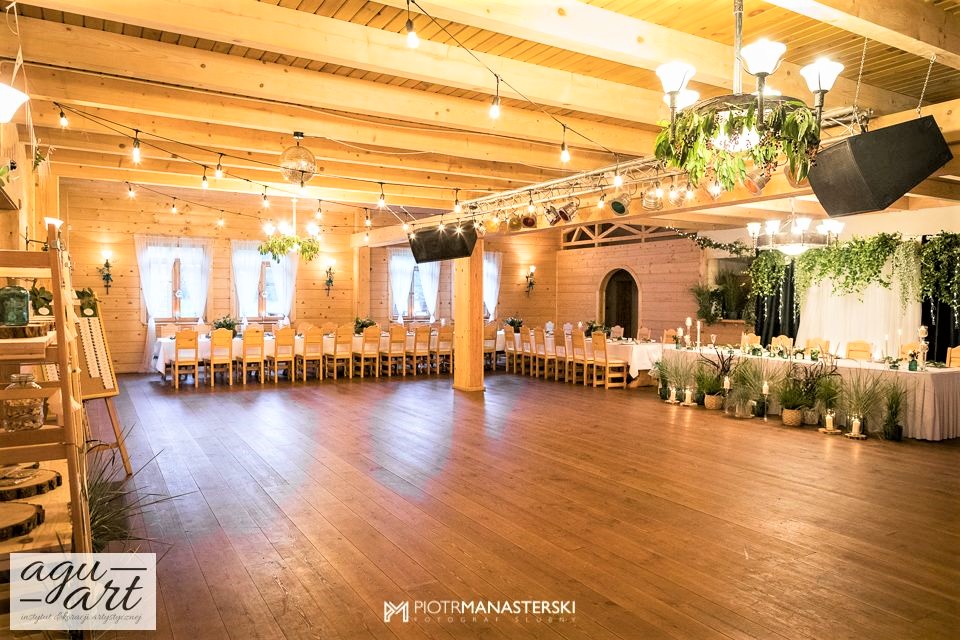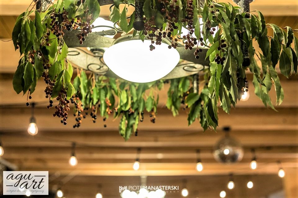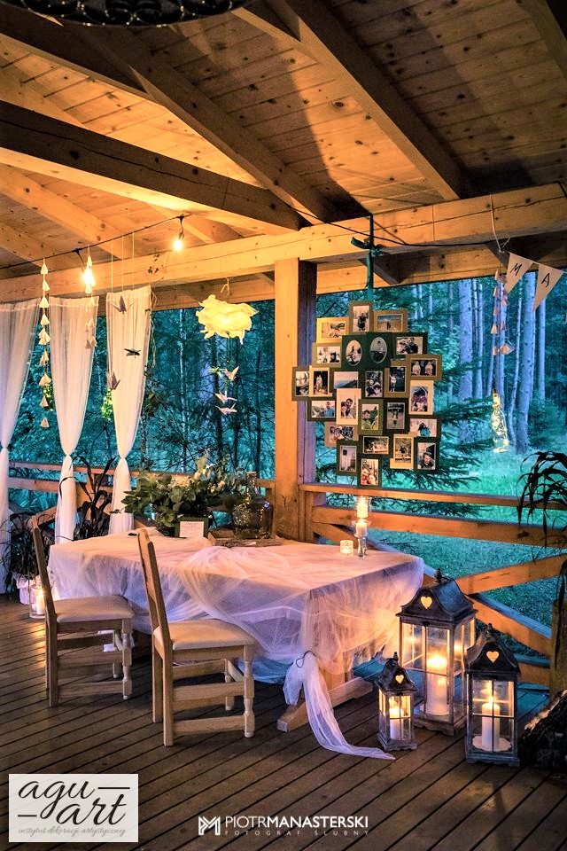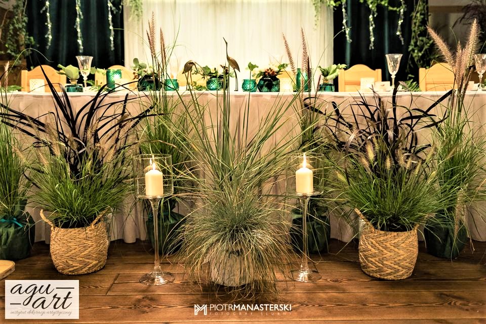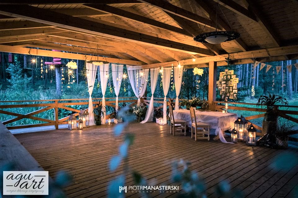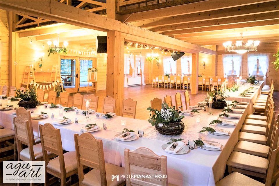 Niezwykła pod względem doboru roślin. Trawy, bluszcze, dzikie czereśnie, jeżyny oraz elegancka eustoma i zwiewna gipsówka wykończona eukaliptusem i paprociami przenoszą nas w iście leśny zakątek. Nasz zamysł to przenieść zewnątrz do wewnątrz. Sala prosta, ale w swej istocie bardzo elegancka i magiczna. Kolory zieleni doskonale podkreślają drewno, którym została wykończona. Wszystkie dodatki dobrane tak, by przypominały gościom, że wesele rozgrywa się w samym środku lasu nad malowniczym jeziorem.