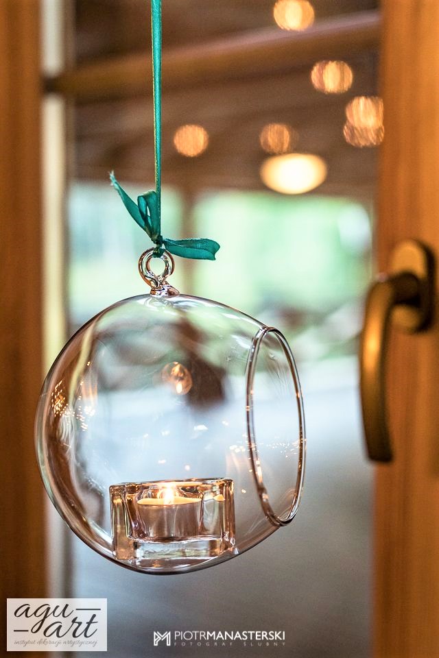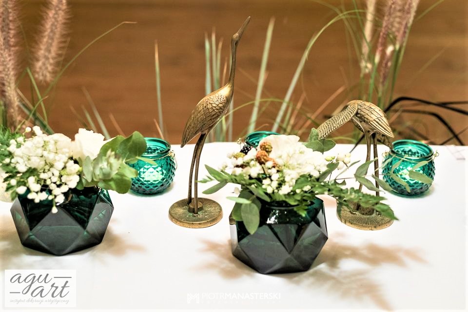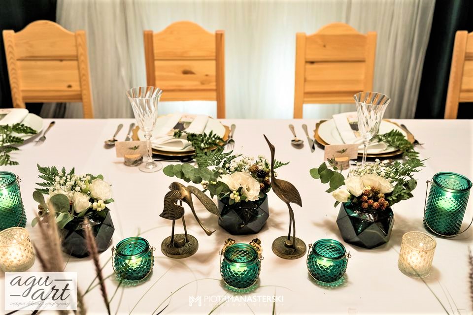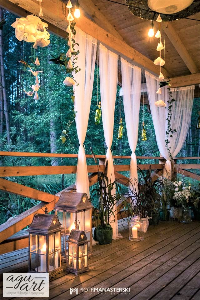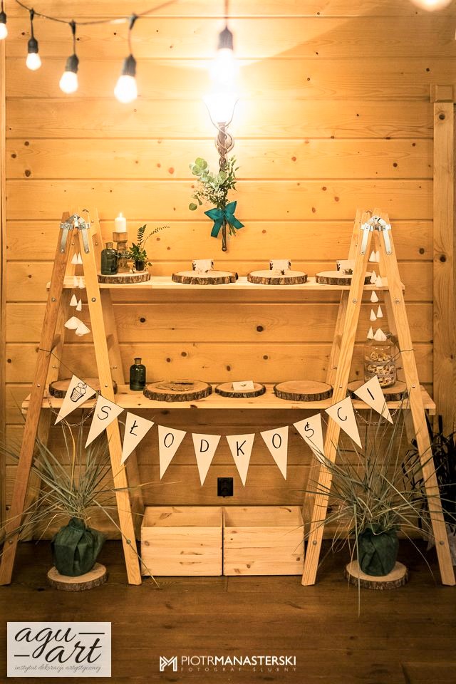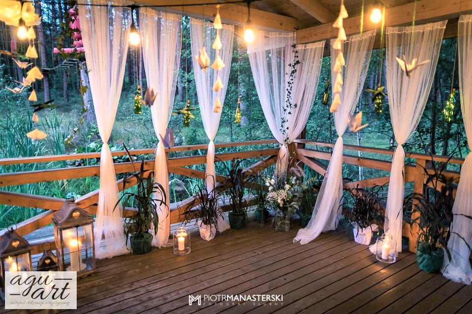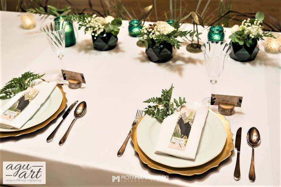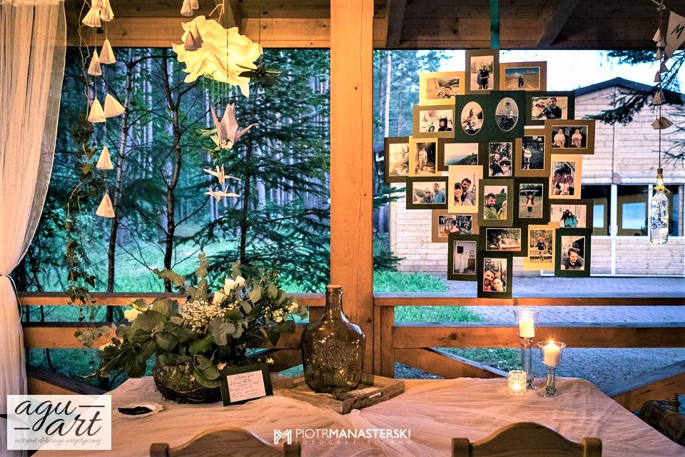 Niezwykła pod względem doboru roślin. Trawy, bluszcze, dzikie czereśnie, jeżyny oraz elegancka eustoma i zwiewna gipsówka wykończona eukaliptusem i paprociami przenoszą nas w iście leśny zakątek. Nasz zamysł to przenieść zewnątrz do wewnątrz. Sala prosta, ale w swej istocie bardzo elegancka i magiczna. Kolory zieleni doskonale podkreślają drewno, którym została wykończona. Wszystkie dodatki dobrane tak, by przypominały gościom, że wesele rozgrywa się w samym środku lasu nad malowniczym jeziorem.