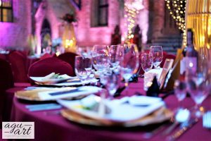 Orientalny Zamek to dekoracja którą stworzyliśmy na dziedzińcu Zamku w Gniewie. Połączyliśmy dwie kultury, polską i tajwańską. W tej historycznej dla Polski przestrzeni wnieśliśmy odrobinę orientu. Na bordowych obrusach ustawiliśmy bambusowe lampiony z Kwiatami na wierzchołku. Złote pod-talerze, winietki w kształcie żurawi origami oraz szklano złote dodatki dodały przytulności i wyjątkowości. Delikatne oświetlenie nad stołami sprawiło, że dekoracja byłą spójna i romantyczna za razem.