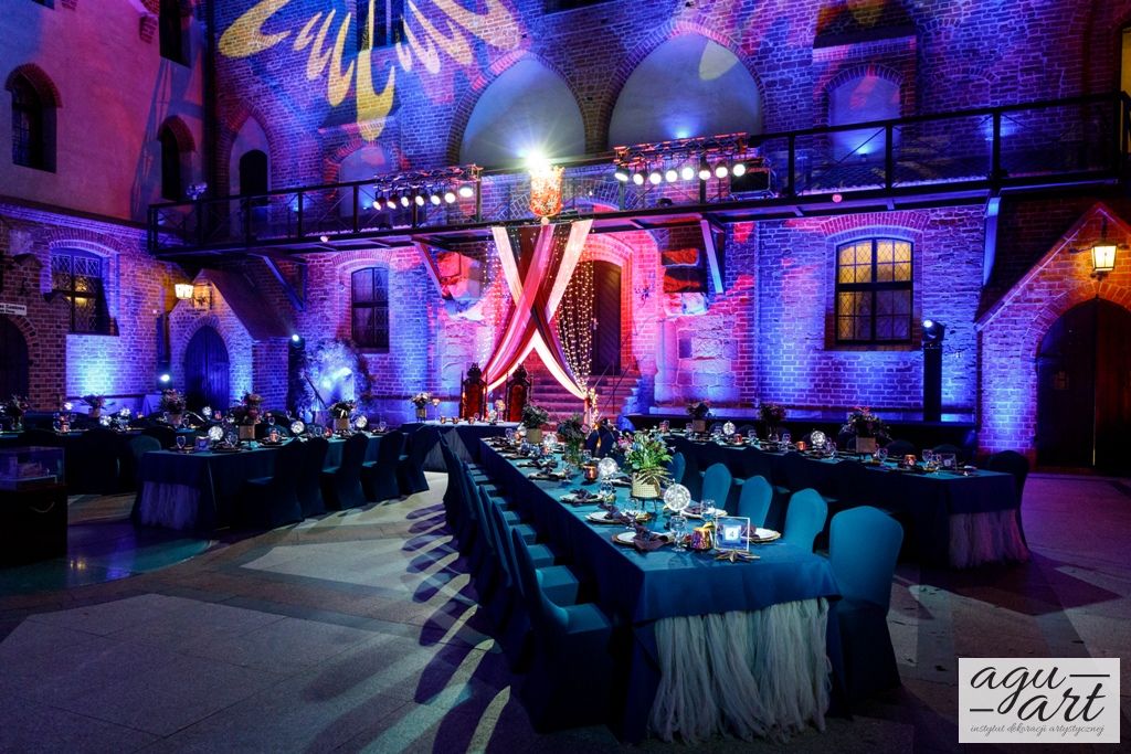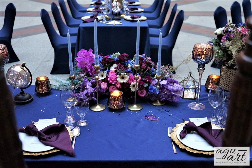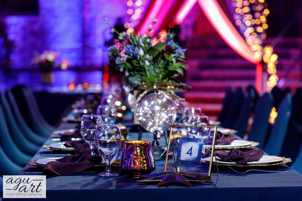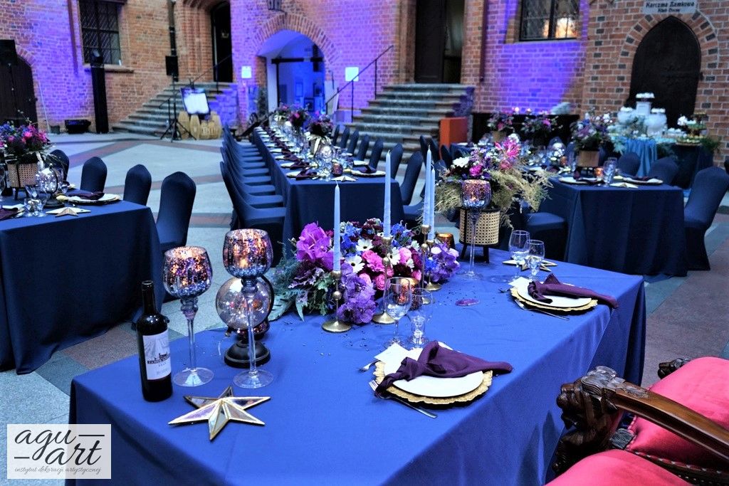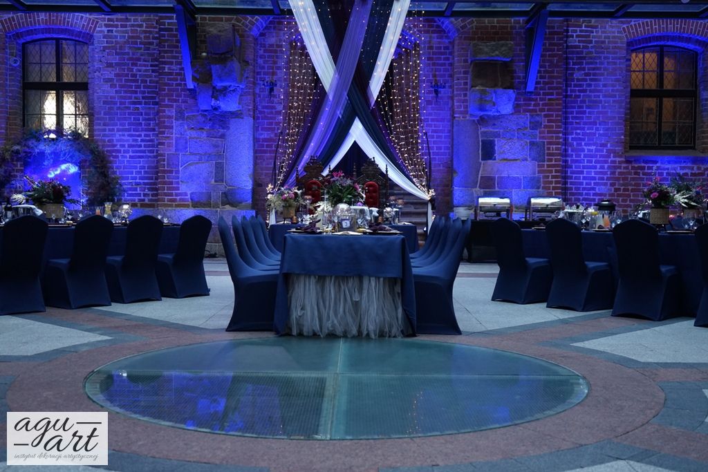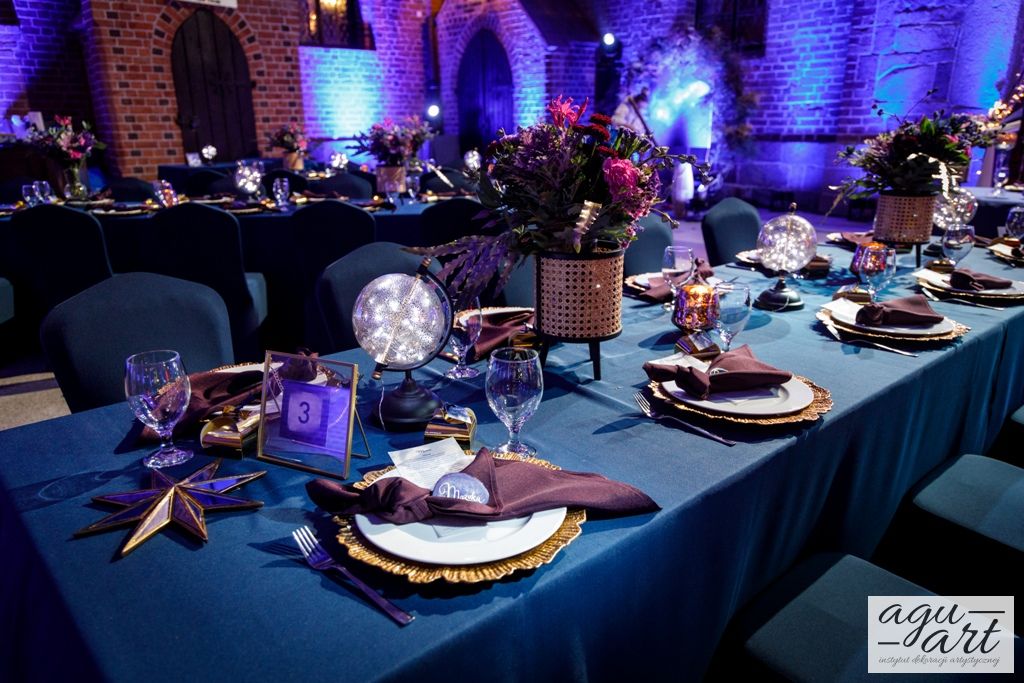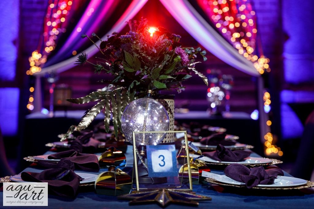 Już samo wnętrze sali na zamku w Gniewie, było bardzo luksusowe, a stworzyliśmy w niej ekskluzywną dekoracje ślubną, przejawiającą się w każdym szczególe projektu. Znak skorpiona, nocne niebo i multiworld, to tematy przewodnie, które bardzo zgrabnie przenikały się tworząc spójną całość dekoracji sali. To międzygalaktyczne wesele na pewno na długo zapisze się w pamięci gości. Granat, czerń, złoto, odcienie od fioletu po fuksję pięknie współgrały ze zdjęciem NASA wydrukowanym na dużej piance fotograficznej, przy którym goście mogli robić sobie zdjęcia. Dodatkową atrakcją był podświetlony ledon "nothing is impossible" przygotowany na specjalne zamówienie, jako hasło przyświecające naszej Parze młodej.