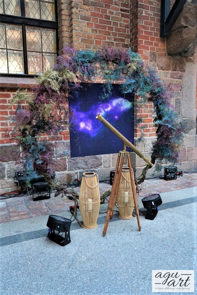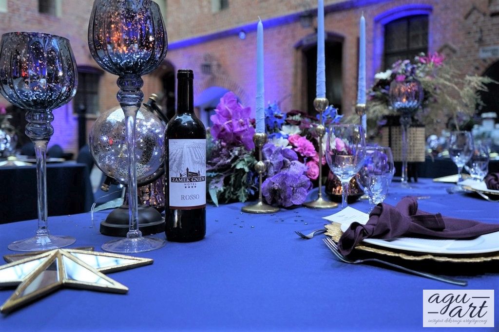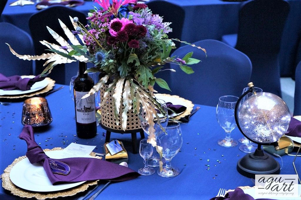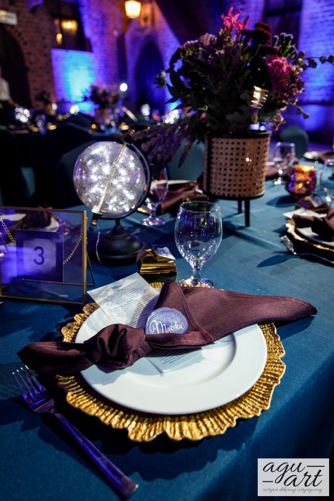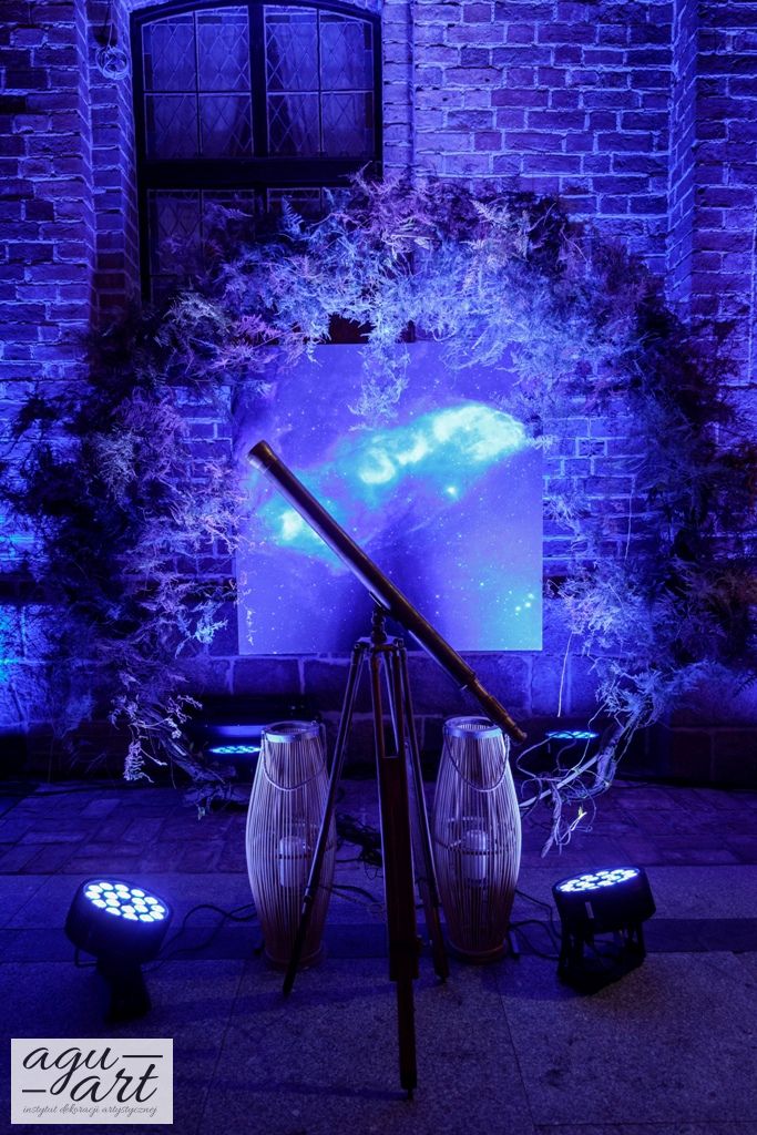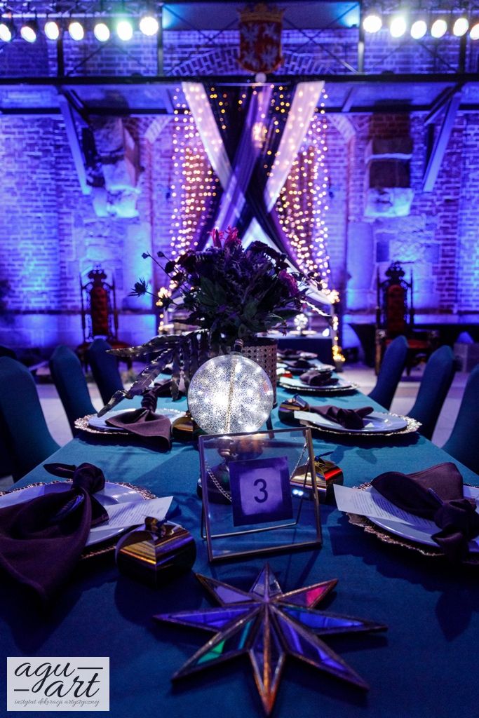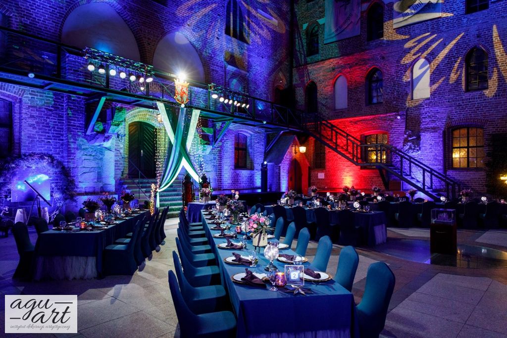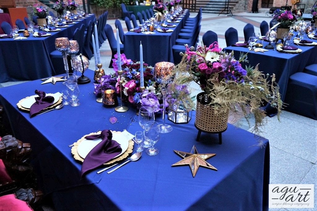Już samo wnętrze sali na zamku w Gniewie, było bardzo luksusowe, a stworzyliśmy w niej ekskluzywną dekoracje ślubną, przejawiającą się w każdym szczególe projektu. Znak skorpiona, nocne niebo i multiworld, to tematy przewodnie, które bardzo zgrabnie przenikały się tworząc spójną całość dekoracji sali. To międzygalaktyczne wesele na pewno na długo zapisze się w pamięci gości. Granat, czerń, złoto, odcienie od fioletu po fuksję pięknie współgrały ze zdjęciem NASA wydrukowanym na dużej piance fotograficznej, przy którym goście mogli robić sobie zdjęcia. Dodatkową atrakcją był podświetlony ledon "nothing is impossible" przygotowany na specjalne zamówienie, jako hasło przyświecające naszej Parze młodej.