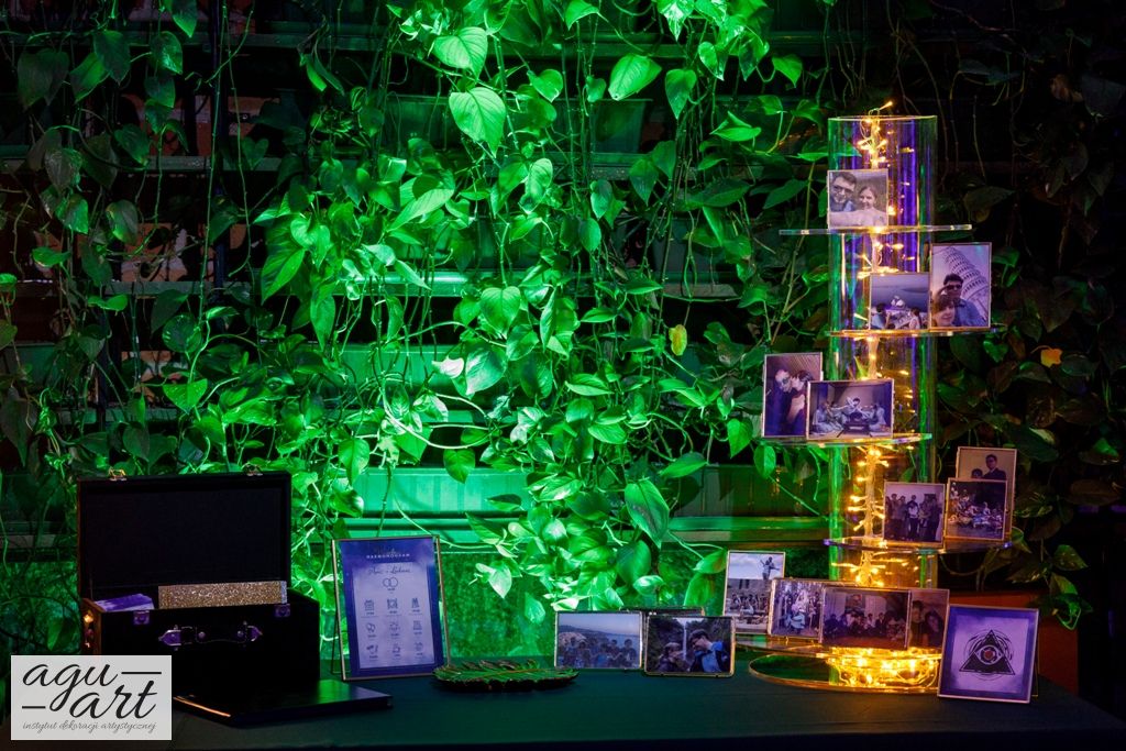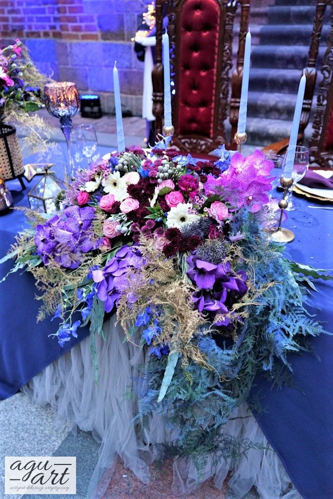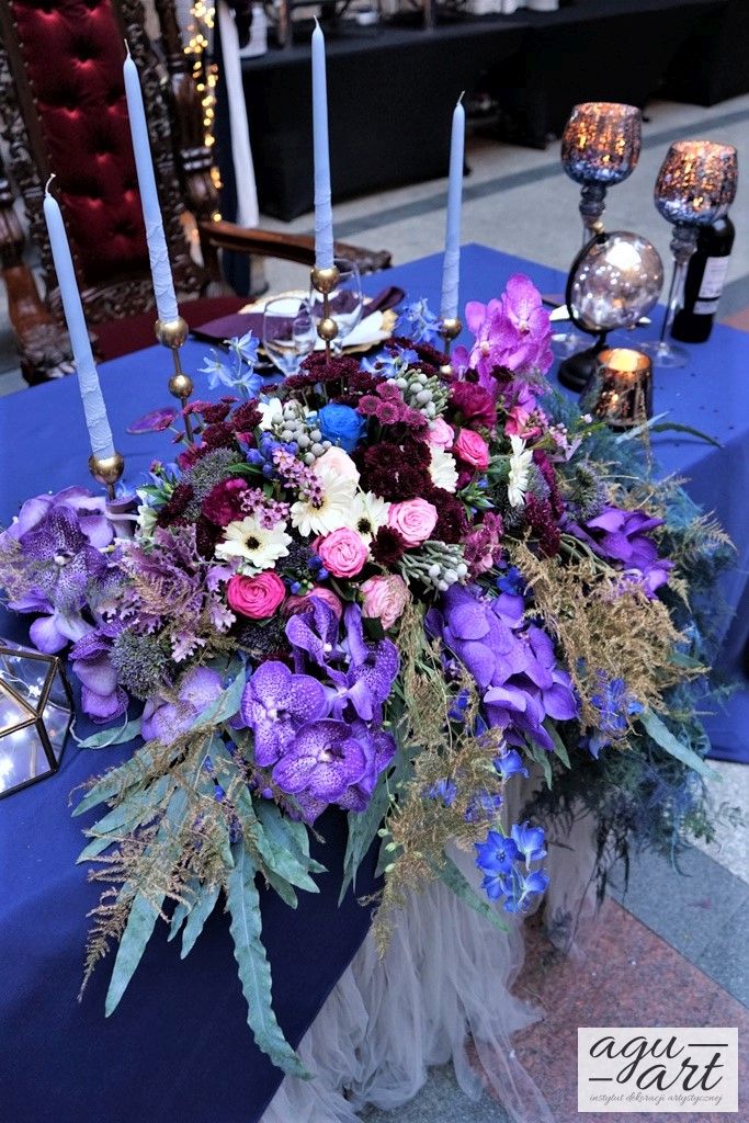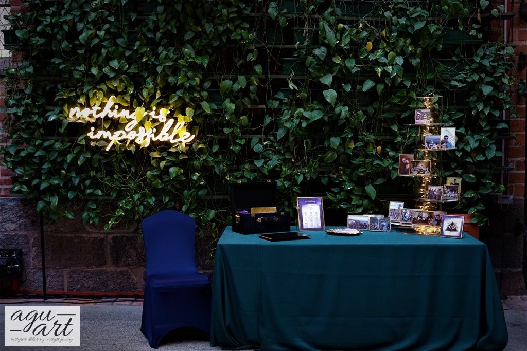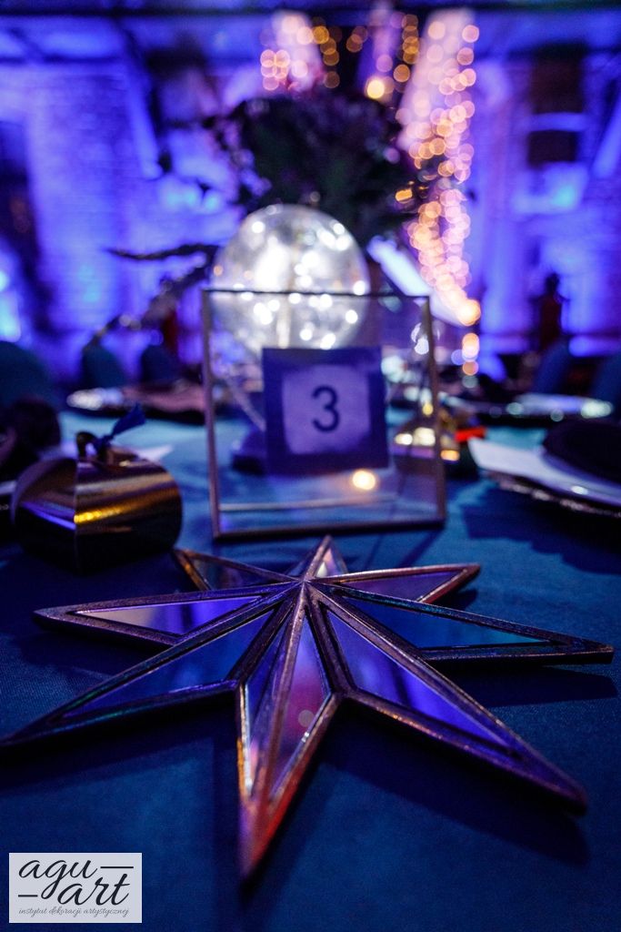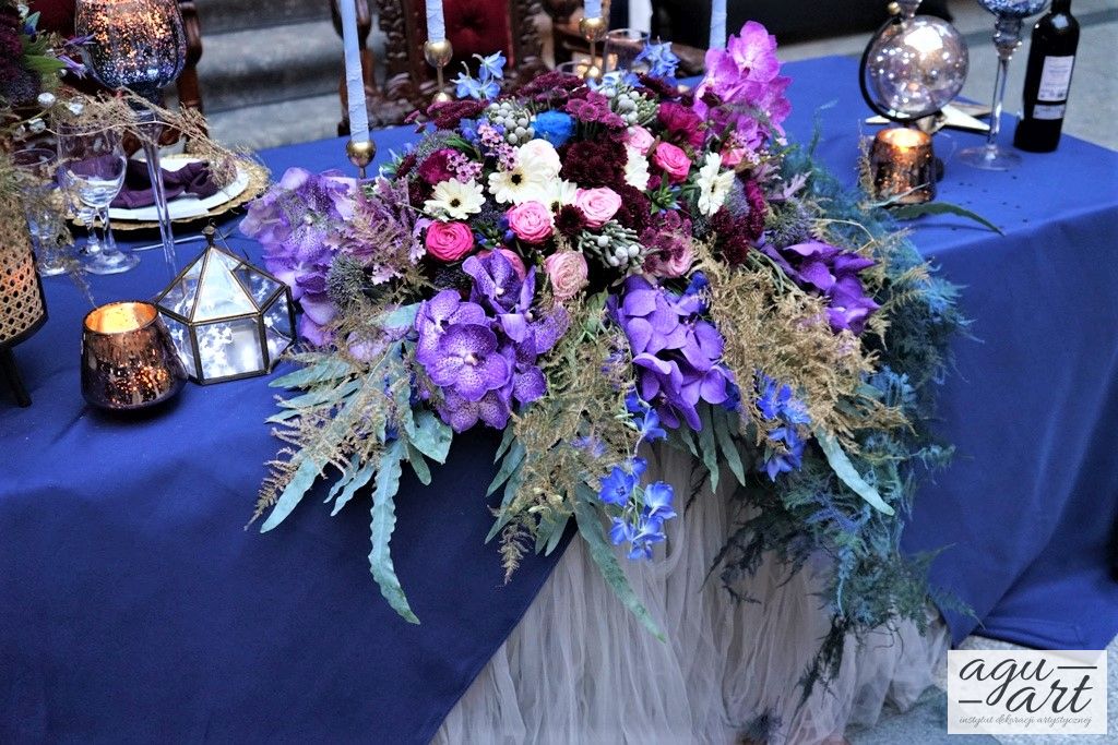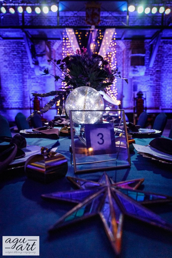 Już samo wnętrze sali na zamku w Gniewie, było bardzo luksusowe, a stworzyliśmy w niej ekskluzywną dekoracje ślubną, przejawiającą się w każdym szczególe projektu. Znak skorpiona, nocne niebo i multiworld, to tematy przewodnie, które bardzo zgrabnie przenikały się tworząc spójną całość dekoracji sali. To międzygalaktyczne wesele na pewno na długo zapisze się w pamięci gości. Granat, czerń, złoto, odcienie od fioletu po fuksję pięknie współgrały ze zdjęciem NASA wydrukowanym na dużej piance fotograficznej, przy którym goście mogli robić sobie zdjęcia. Dodatkową atrakcją był podświetlony ledon "nothing is impossible" przygotowany na specjalne zamówienie, jako hasło przyświecające naszej Parze młodej.