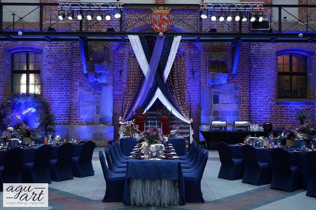 Ekskluzywna dekoracja ślubna sali weselnej z motywem nocnego nieba na Zamku w Gniewie.