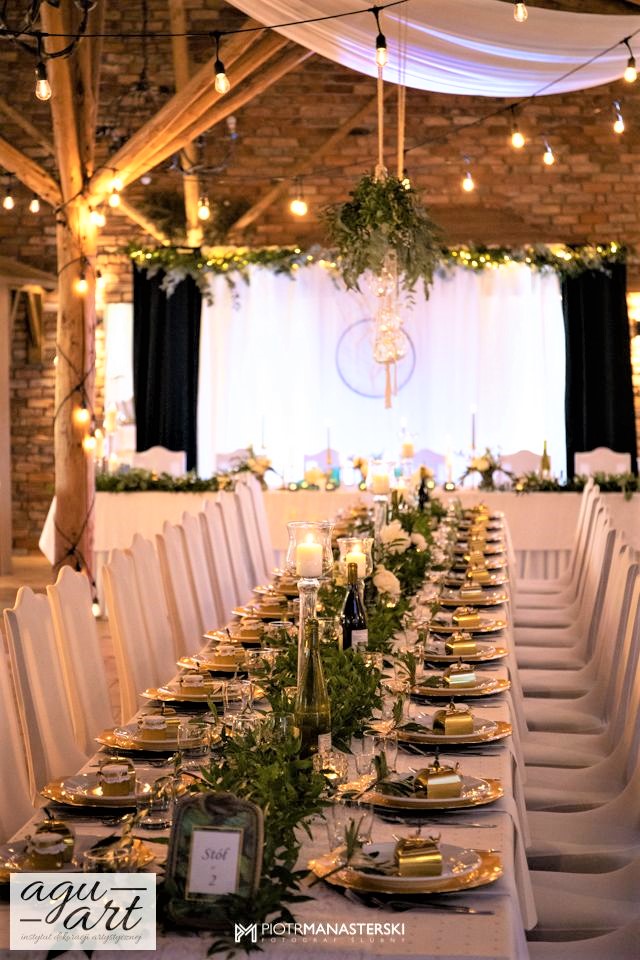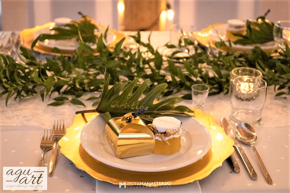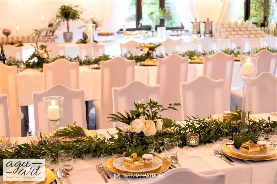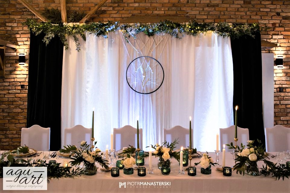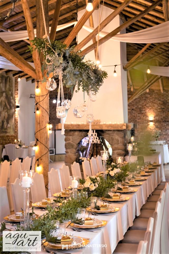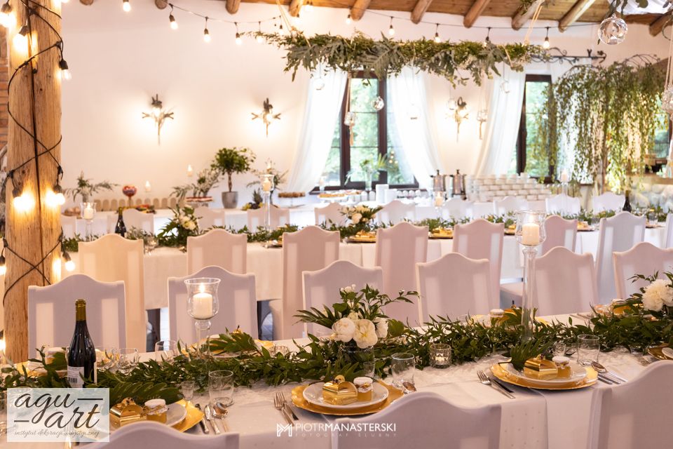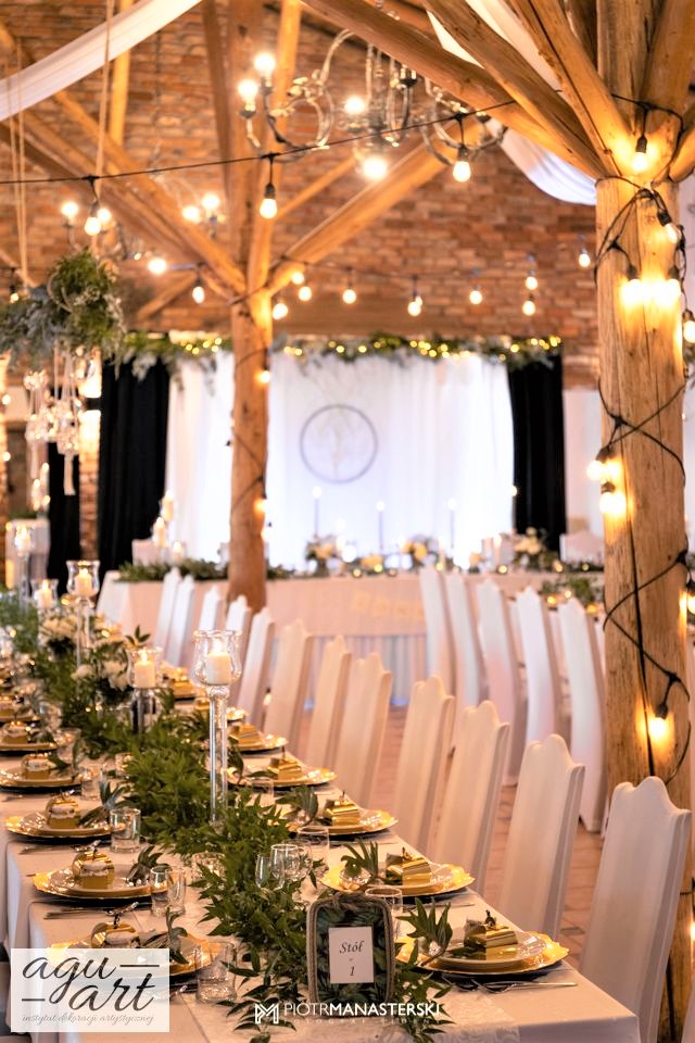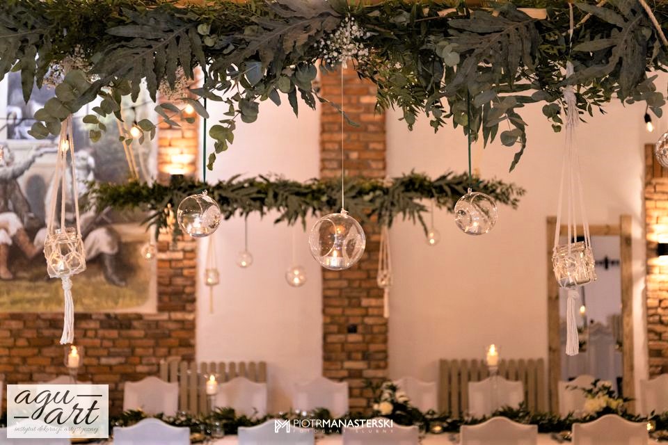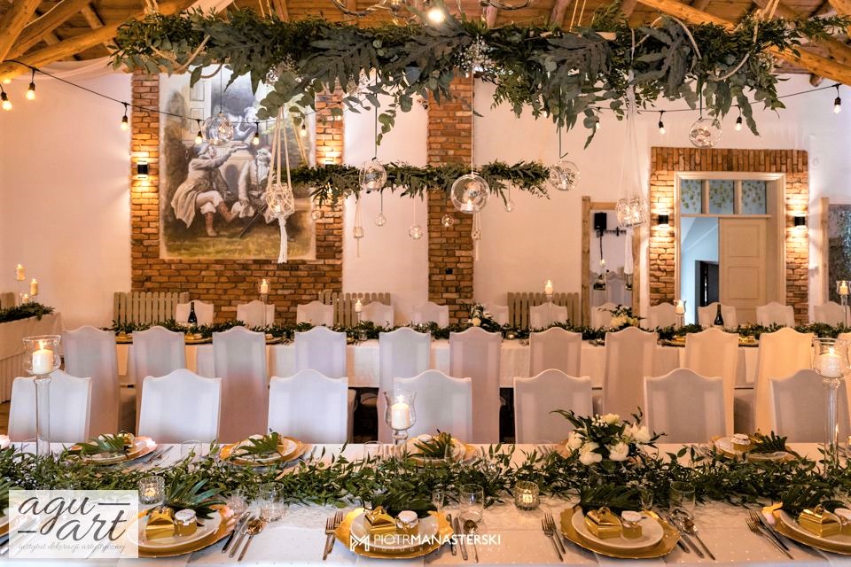 To dekoracja ślubna w stylu rustykalnym. Tym razem pierwsze skrzypce gra Ruskus. Motywem przewodnim dekoracji ślubnej były drzewa. W pięknej przestrzeni Zaścianka w Chwaszczynie stworzyliśmy dekorację pełną romantyzmu. Rustykalny styl wnętrza podkreśliły podwieszone roślinne ławy ze szklanymi kulami, ruskus rozłożony wzdłuż stołów, delikatne bukiety oraz drzewa brzozowe. Złote pod-talerze nadały dekoracji eleganckiego charakteru, a winietka w formie liścia oryginalności. Mocnym elementem dekoracji był stół Pary młodej. Tkaniny w kolorze butelkowej zieleni wykorzystane do dekoracji ściany za Parą Młodą dodały szyku idealnie dopełniając nasz projekt. Ręcznie robione lampiony, makrama wykorzystana do ściany za Parą młodą i żarówkowe girlandy rozwieszone nad stołami dodawały charakteru domowego ogniska, przy którym każdy czuł się wyjątkowo.