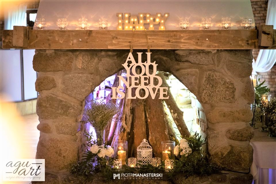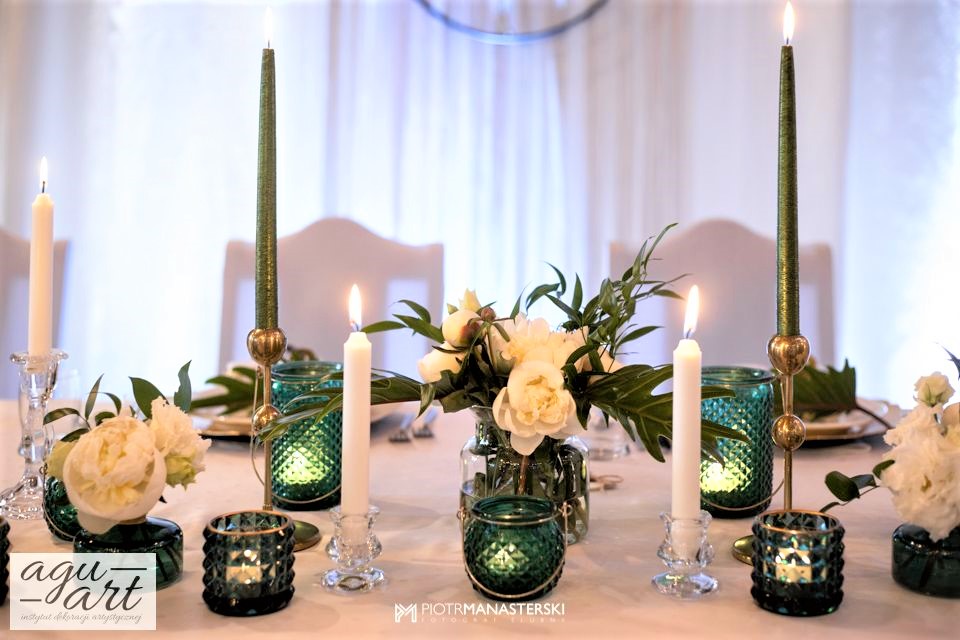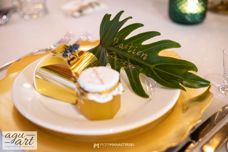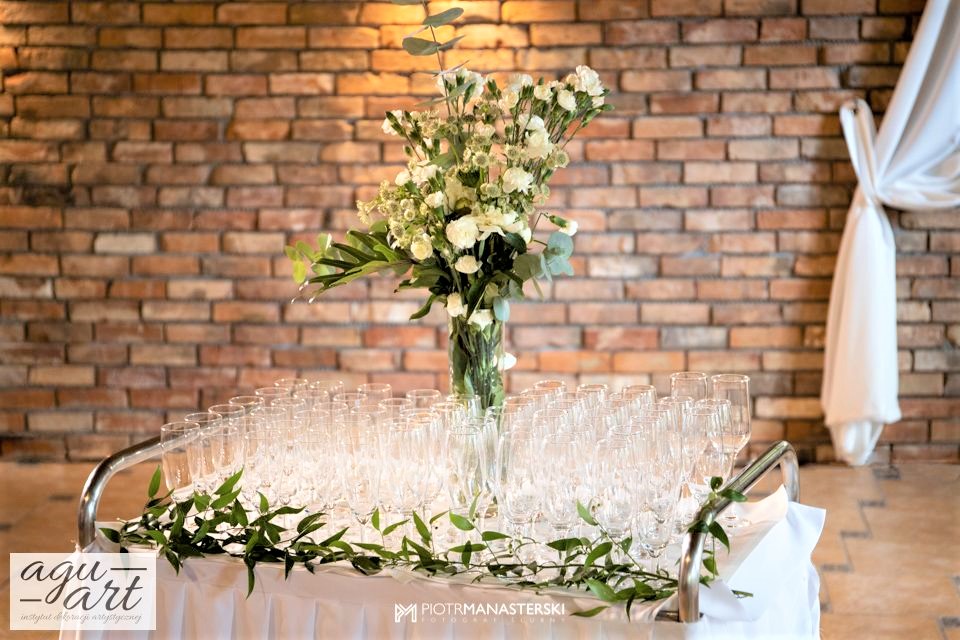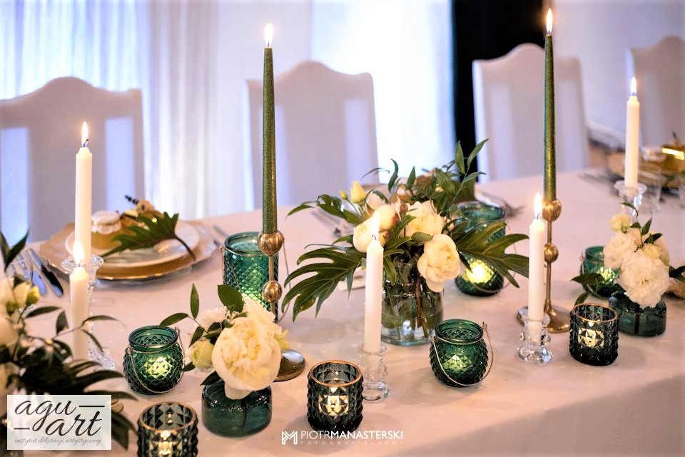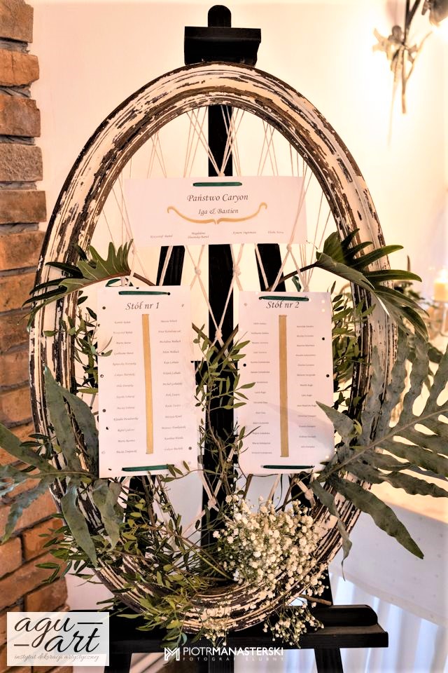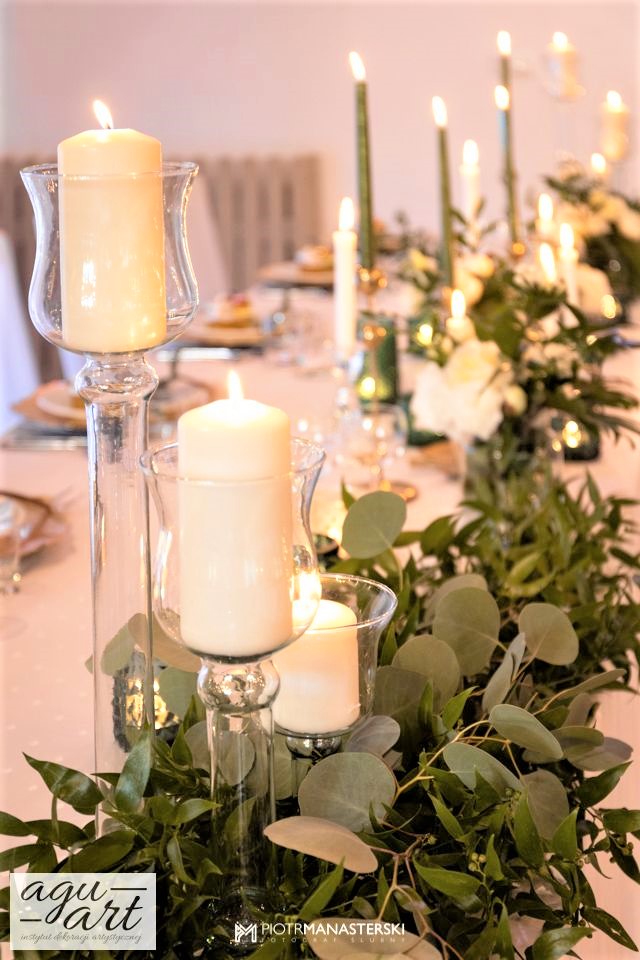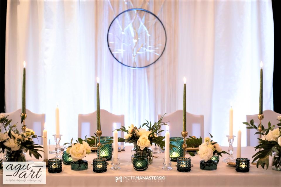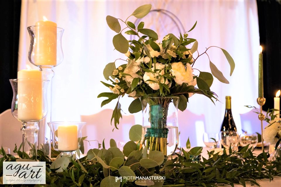 To dekoracja ślubna w stylu rustykalnym. Tym razem pierwsze skrzypce gra Ruskus. Motywem przewodnim dekoracji ślubnej były drzewa. W pięknej przestrzeni Zaścianka w Chwaszczynie stworzyliśmy dekorację pełną romantyzmu. Rustykalny styl wnętrza podkreśliły podwieszone roślinne ławy ze szklanymi kulami, ruskus rozłożony wzdłuż stołów, delikatne bukiety oraz drzewa brzozowe. Złote pod-talerze nadały dekoracji eleganckiego charakteru, a winietka w formie liścia oryginalności. Mocnym elementem dekoracji był stół Pary młodej. Tkaniny w kolorze butelkowej zieleni wykorzystane do dekoracji ściany za Parą Młodą dodały szyku idealnie dopełniając nasz projekt. Ręcznie robione lampiony, makrama wykorzystana do ściany za Parą młodą i żarówkowe girlandy rozwieszone nad stołami dodawały charakteru domowego ogniska, przy którym każdy czuł się wyjątkowo.