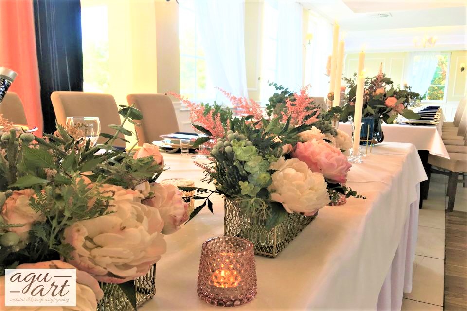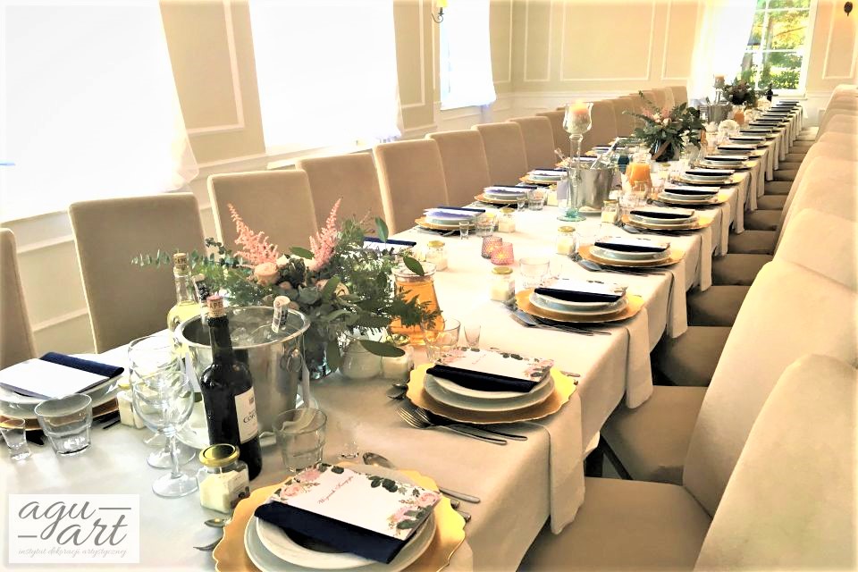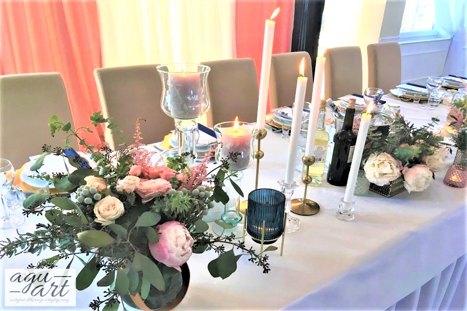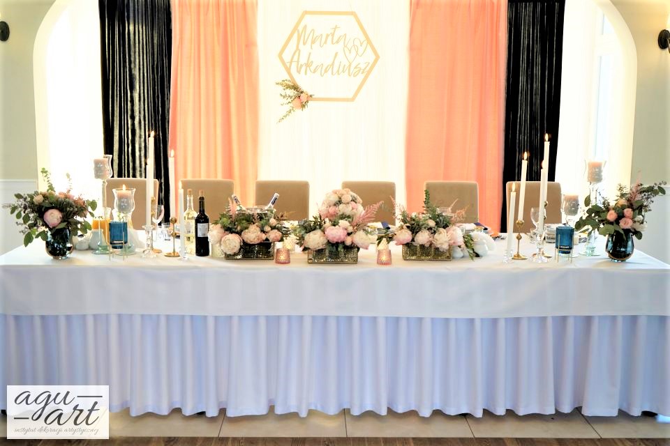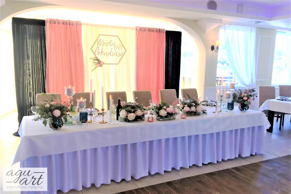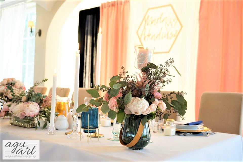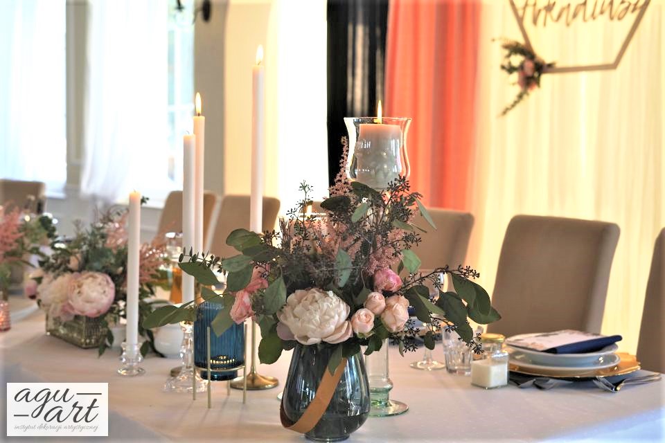 Pudrowy Raj to dekoracja ślubna sali weselnej, którą wykonaliśmy w uroczym i niebywale gustownym Dworku Rajska Góra dla Marty i Arkadiusza. To projekt bardzo romantyczny. Pokazaliśmy w nim jedność pomiędzy kobiecym różem, a męskim granatem. Piękne kompozycje kwiatowe, złożone z róż, sezonowych Piwonii i innych roślin w połączeniu z granatowymi wazonami stworzyły unikalną całość. Kwiatowa papeteria i gustowne dodatki, dyskretnie wprowadzały naszych klientów i ich gości do tajemniczego ogrodu. Złote dodatki w postaci pod-talerzy czy koszyków oraz szklane świeczniki nadawały projektowi elegancji.