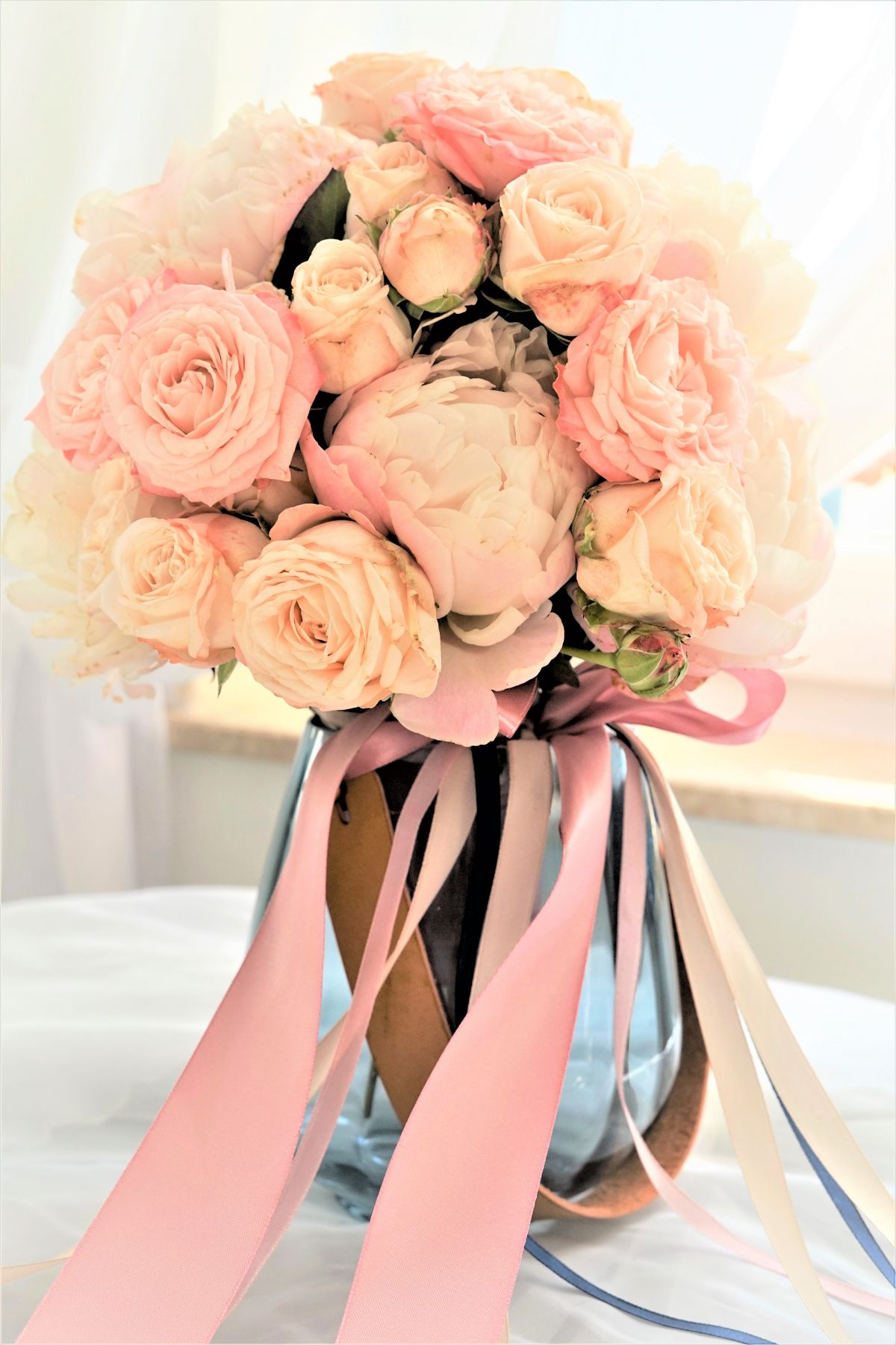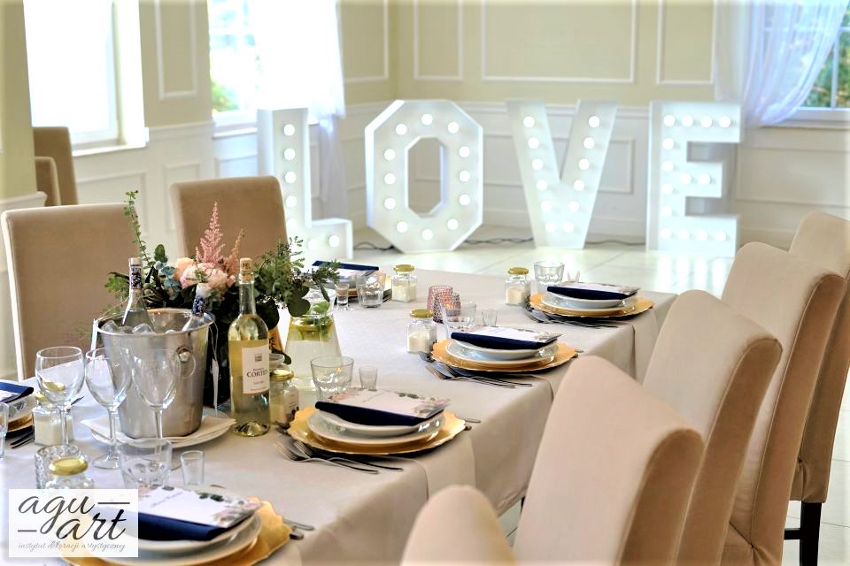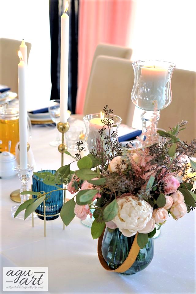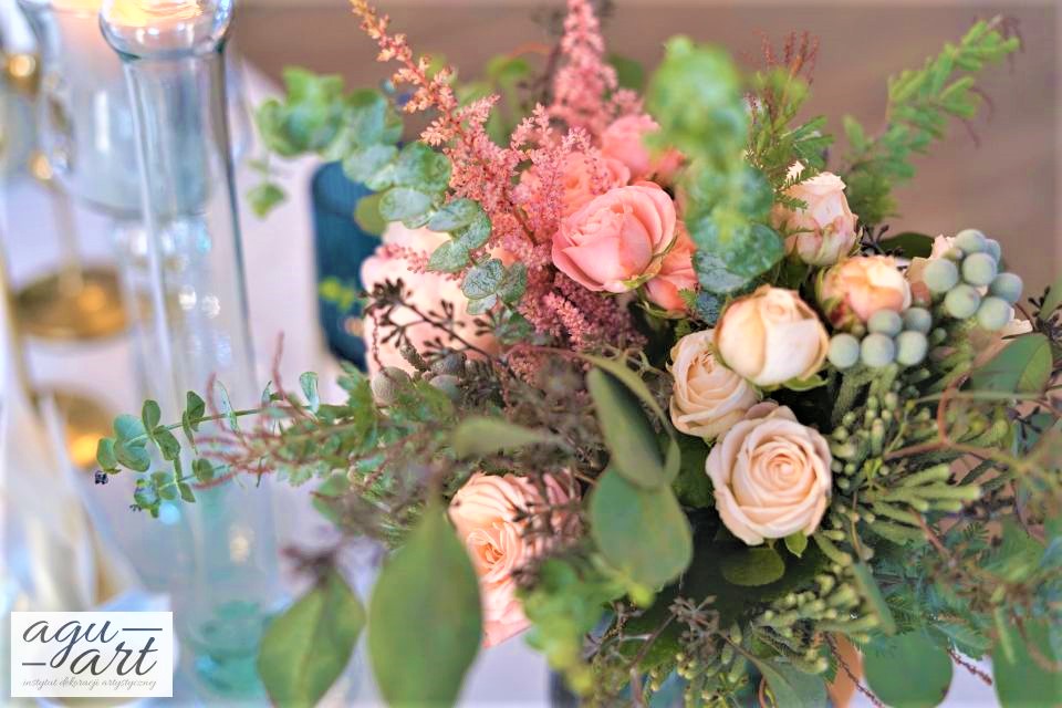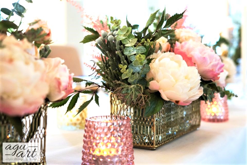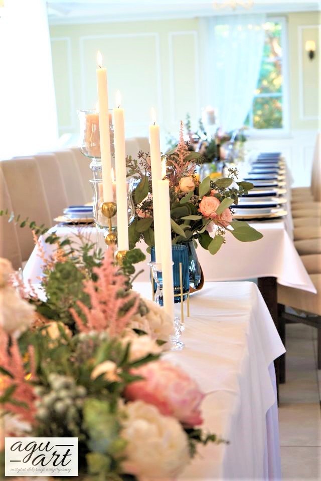 Pudrowy Raj to dekoracja ślubna sali weselnej, którą wykonaliśmy w uroczym i niebywale gustownym Dworku Rajska Góra dla Marty i Arkadiusza. To projekt bardzo romantyczny. Pokazaliśmy w nim jedność pomiędzy kobiecym różem, a męskim granatem. Piękne kompozycje kwiatowe, złożone z róż, sezonowych Piwonii i innych roślin w połączeniu z granatowymi wazonami stworzyły unikalną całość. Kwiatowa papeteria i gustowne dodatki, dyskretnie wprowadzały naszych klientów i ich gości do tajemniczego ogrodu. Złote dodatki w postaci pod-talerzy czy koszyków oraz szklane świeczniki nadawały projektowi elegancji.