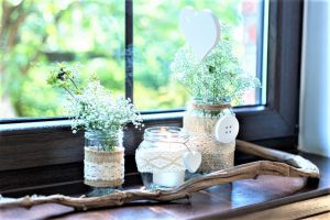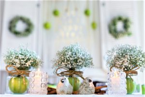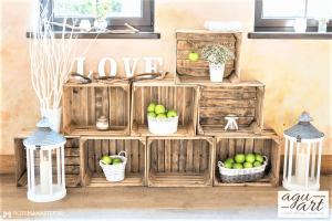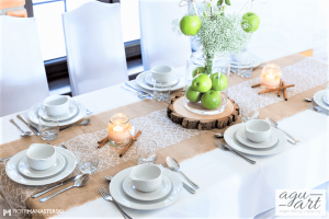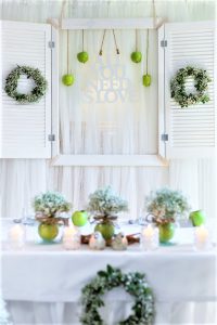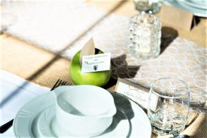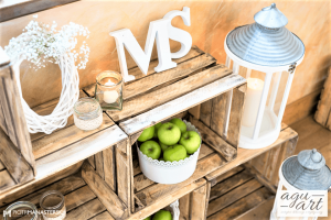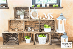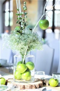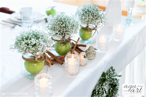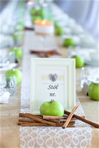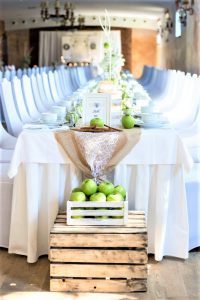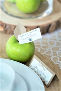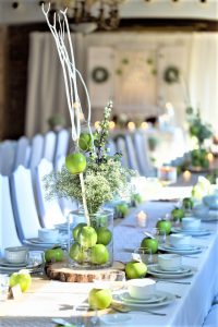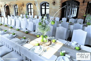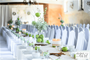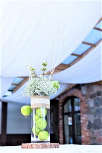 Rajskie ogrody, myślę, że śmiało mogę tak zatytułować ten projekt dekoracji weselnej przygotowanej dla Magdy i Szymona w Dworku na Błotach w Sierakowicach. Juta, koronki, drewno i szkło po raz kolejny spełniły swoją rolę. Świeże, nasycone kolorem jabłka dodały całej aranżacji charakteru i blasku, a podbicie elegancką bielą podkreśliło doniosłość tej uroczystej chwili.