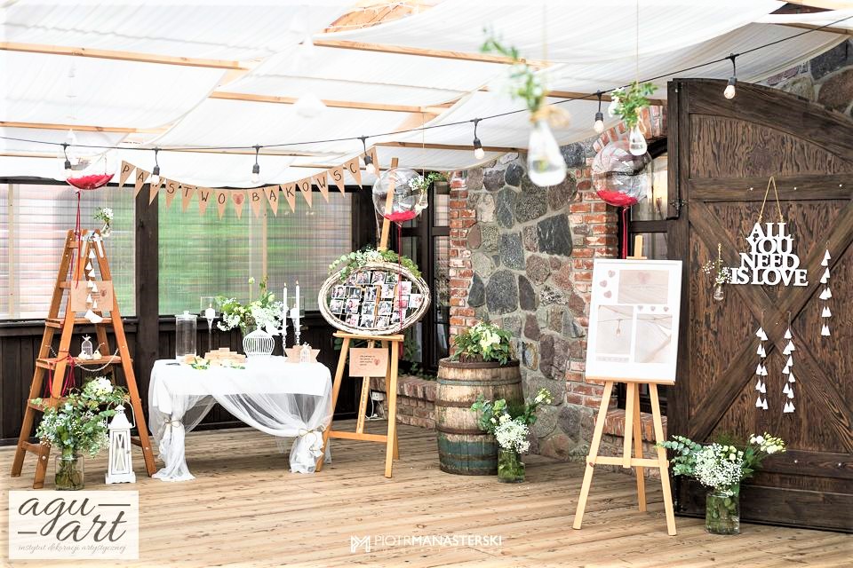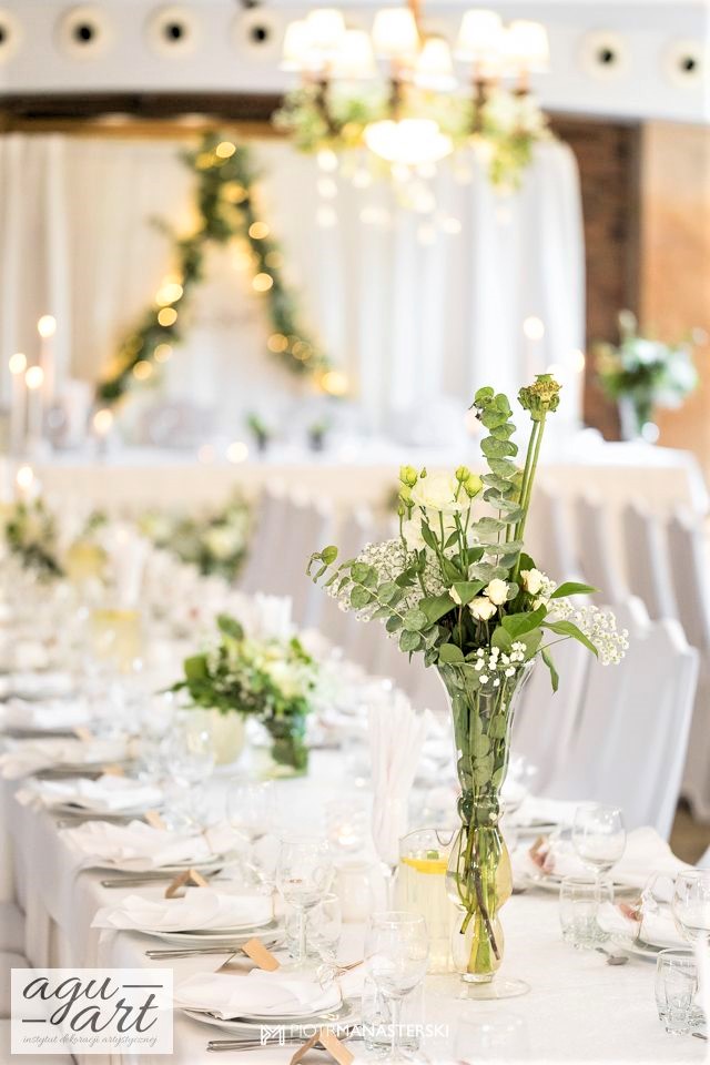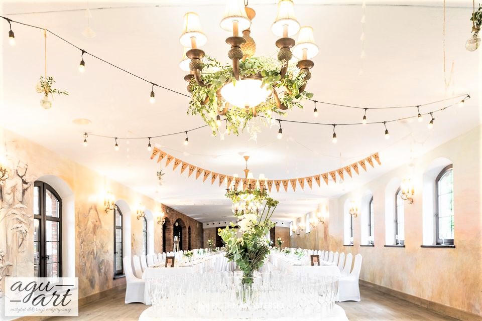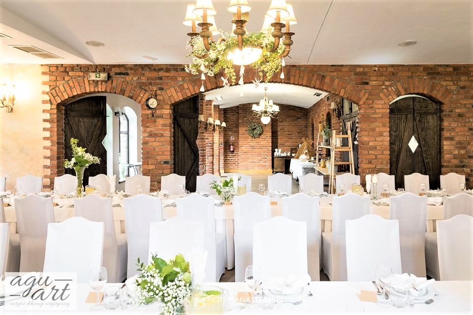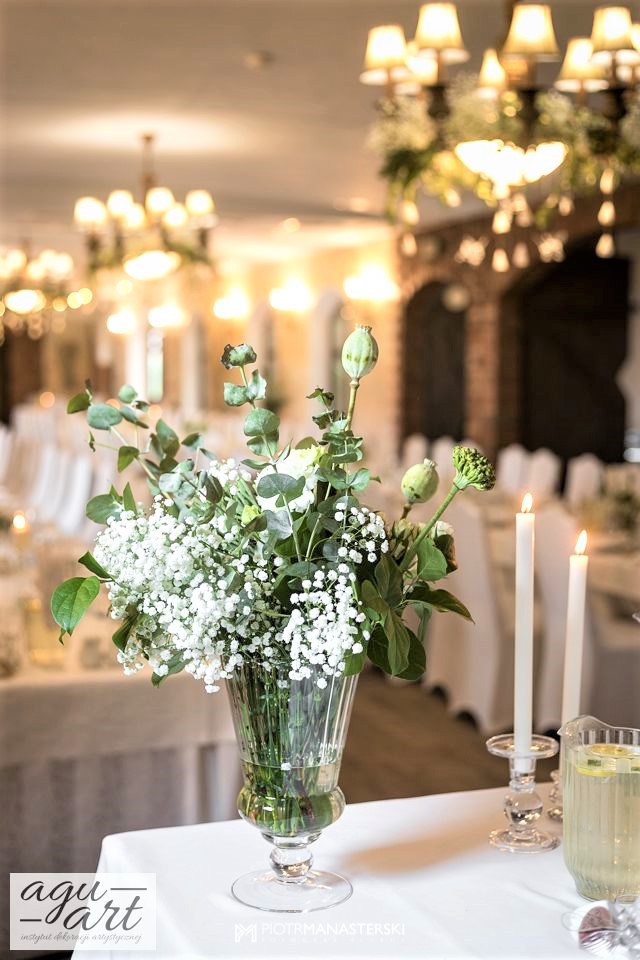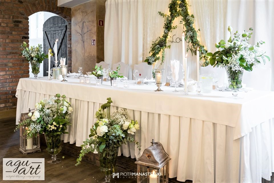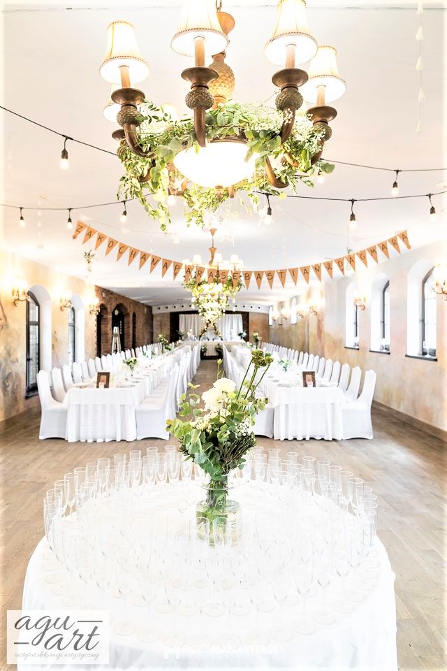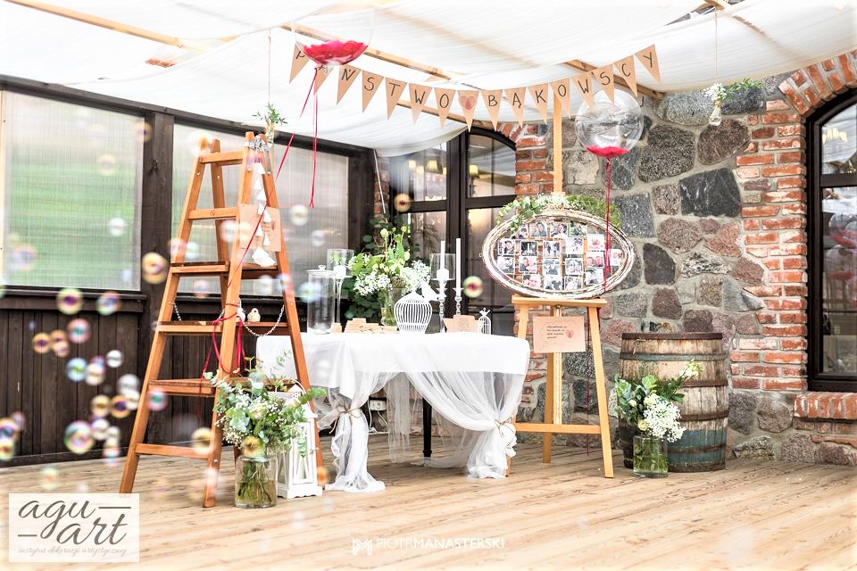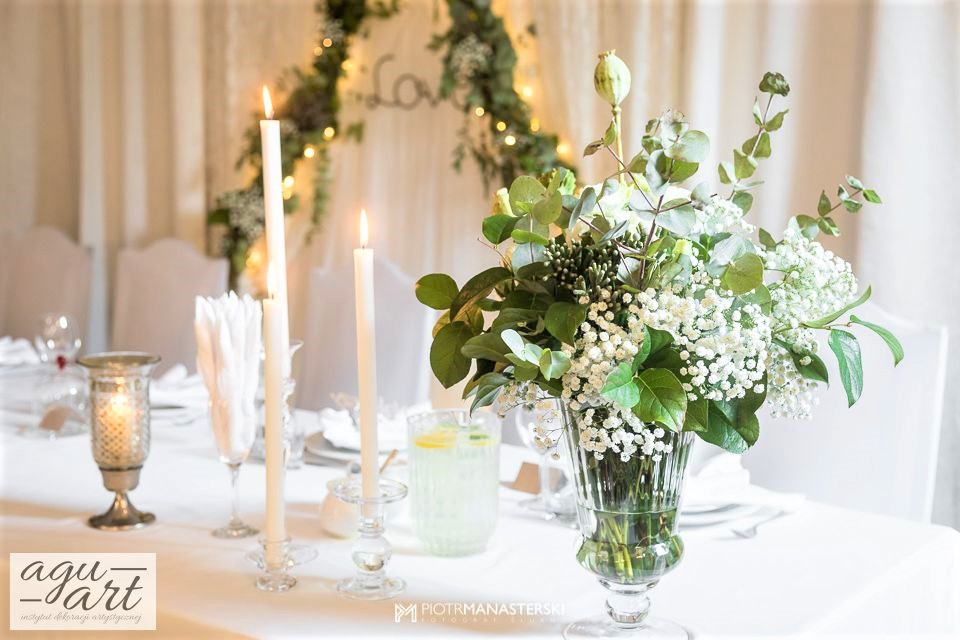 To dekoracja stworzona w Dworku na Błotach w Sierakowicach. Kolory w niej dominujące to biel, zieleń, poświata srebrnego. Dekoracja jest elegancka, zwiewna i nieprzytłaczająca, przeplatana elementami rustykalnymi.
