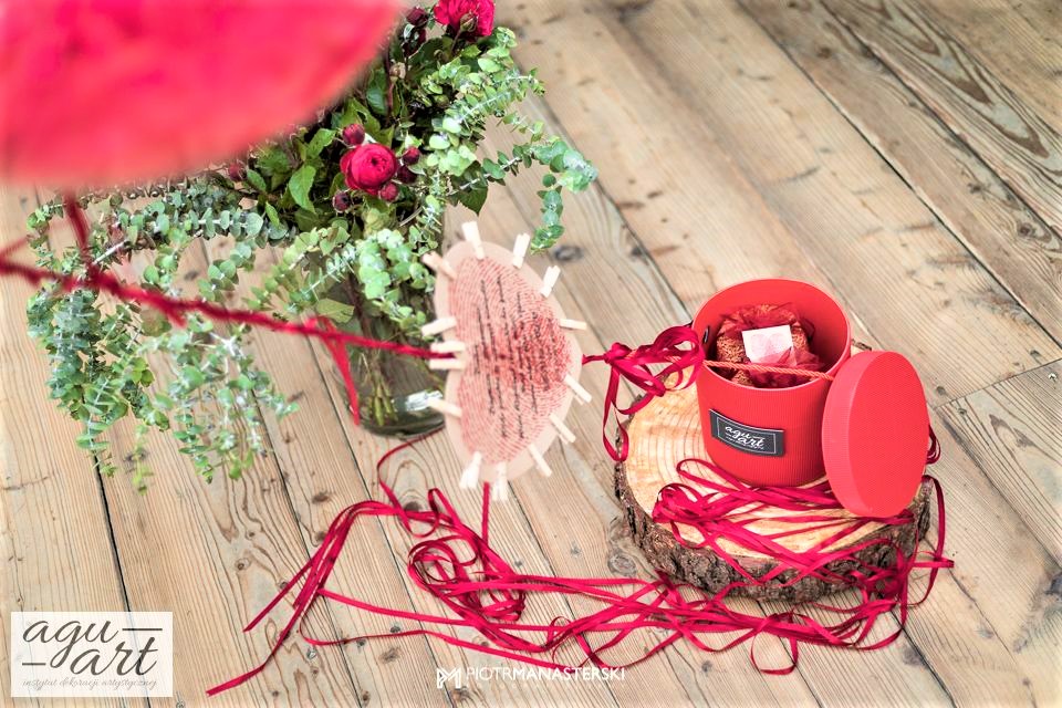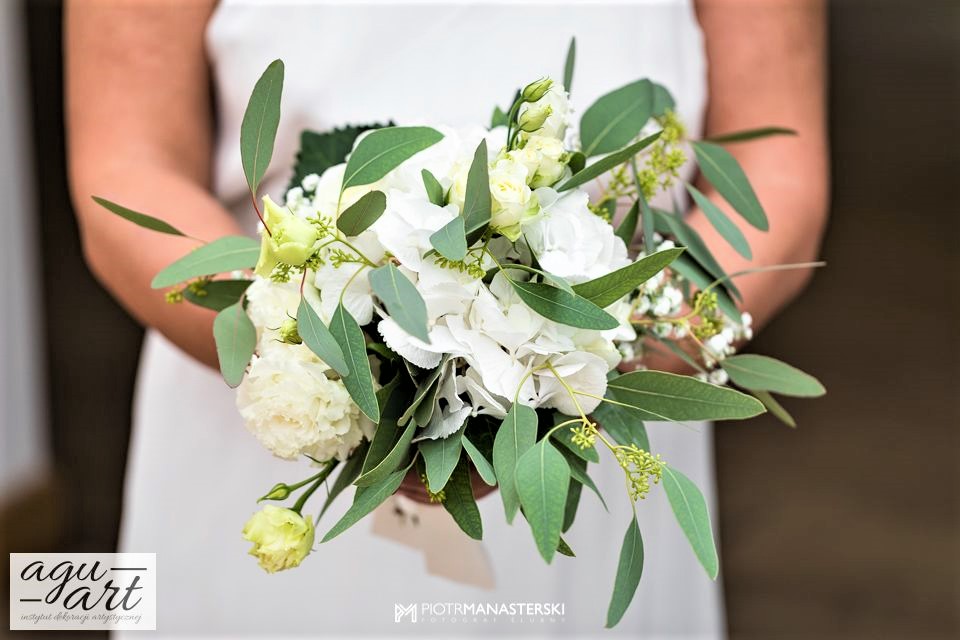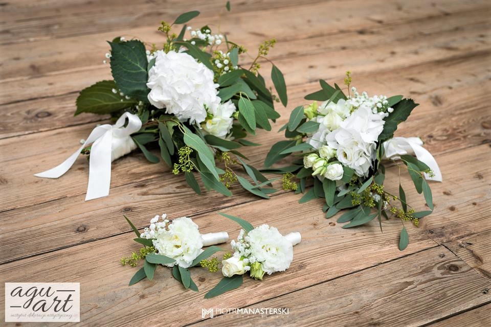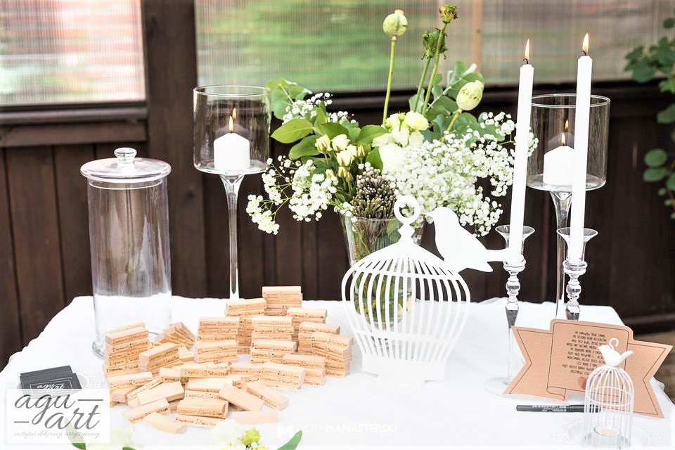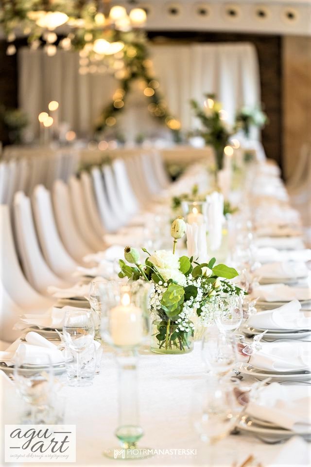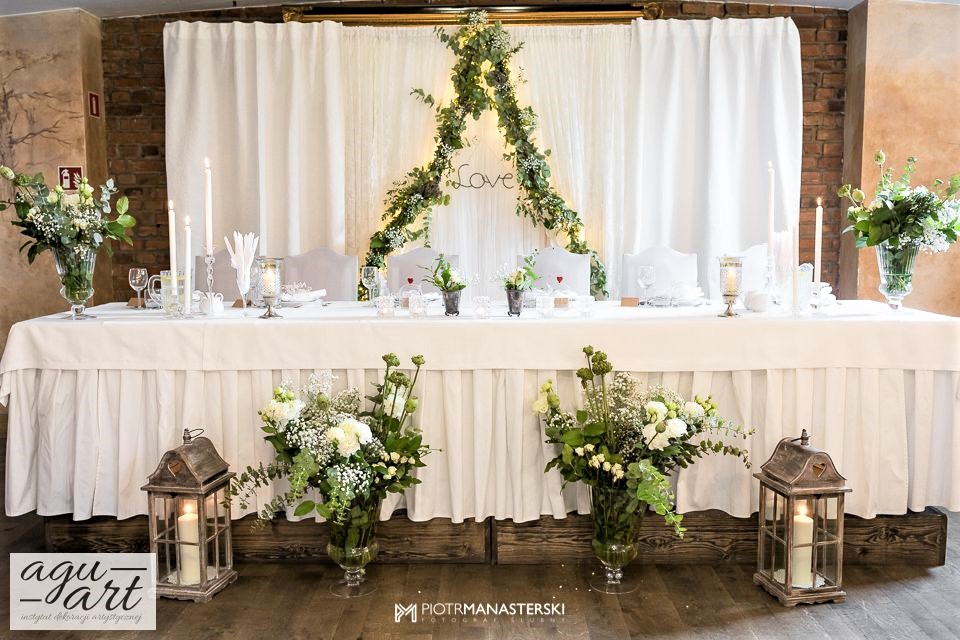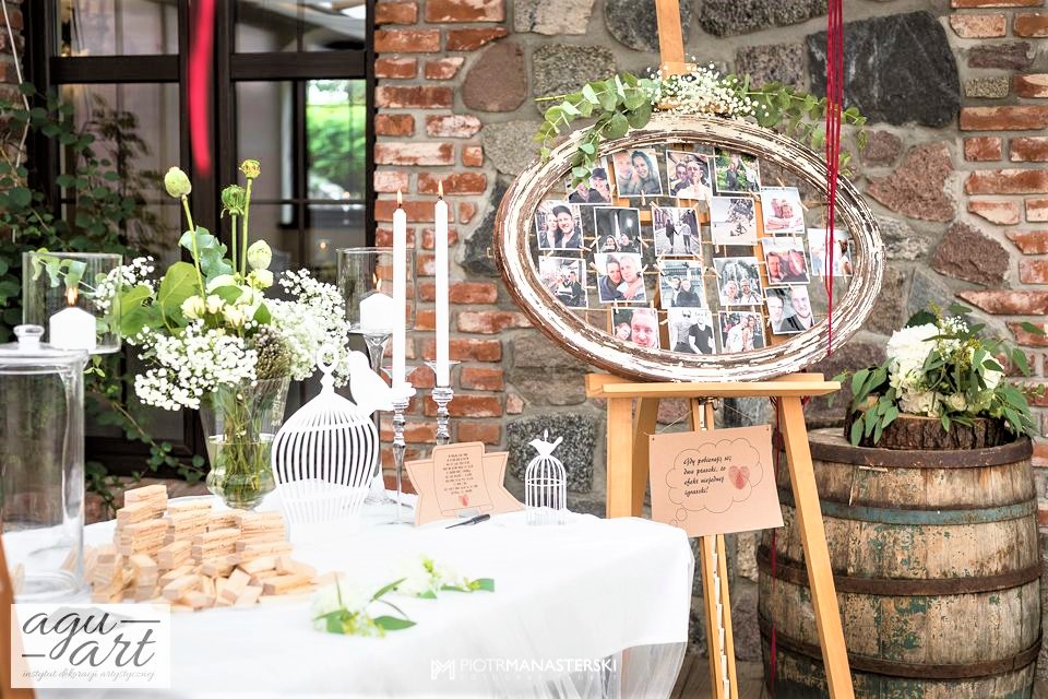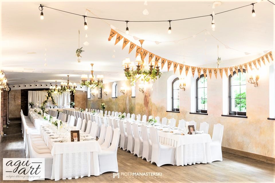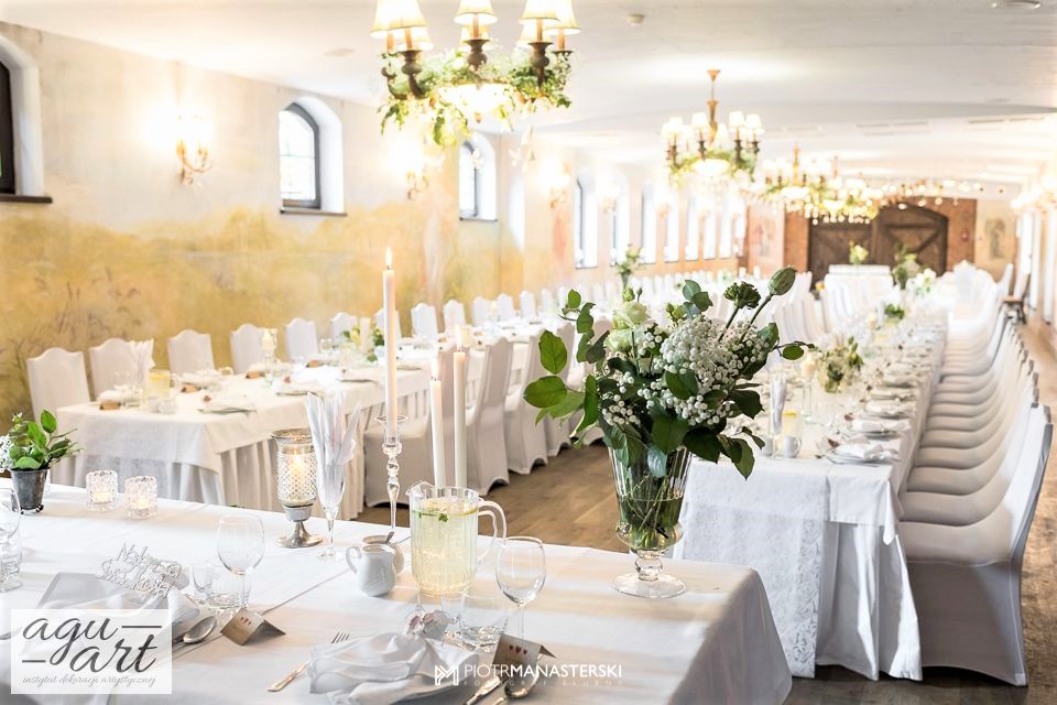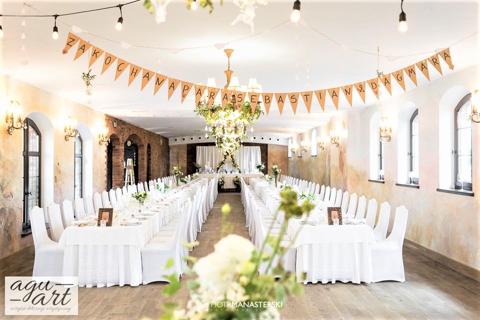 To dekoracja stworzona w Dworku na Błotach w Sierakowicach. Kolory w niej dominujące to biel, zieleń, poświata srebrnego. Dekoracja jest elegancka, zwiewna i nieprzytłaczająca, przeplatana elementami rustykalnymi.