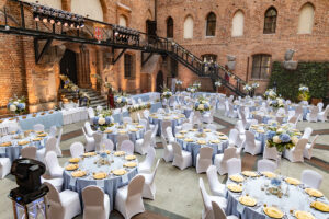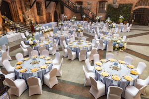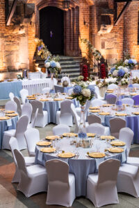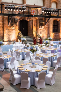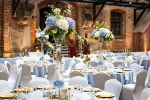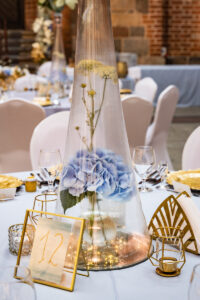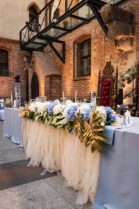 Dekoracja ślubna- Subtelność to projekt przygotowany dla Ani i Mateusza na dziedzińcu zamku w Gniewie. Jest to subtelna, ale bardzo elegancka i luksusowa dekoracja weselna, która urzekała nawet najmniejszymi elementami. Obrusy i serwetki w kolorze dusty blue, złote pod-talerze, złote świeczniki i serwetnik oraz ramki z numeracją stołów pięknie się uzupełniały. Wysokie, szklane wazony z bukietami z hortensji i delikatnym wypełnieniem kwiatowym dolnej części wazonu tworzyły luksusową całość kompozycji weselnej. Hortensje w bieli i błękicie tworzyły swego rodzaju chmurki nad stołami. Oświetlenie architektoniczne rzucone na mury Dziedzińca idealnie podkreślało wszystkie atuty całej scenografii ślubnej. Dodatkowo, na poręczy schodów prowadzących do kaplicy zamkowej upięliśmy girlandę z gipsówki, wisterii i złotych liści. Pod spód girlandy zamontowaliśmy oświetlenie ledowe. Podobnie zrobiliśmy z przestrzenią za Stołem Prezydialnym. Dwie przeciwległe poręcze przy wejściu do refektarza zamku również udekorowaliśmy kwiatami i oświetleniem ledowym. Ponad 15 stołów gości rozmieszczona w taki sposób, by każdy gość weselny miał swobodny dostęp do przeróżnych atrakcji weselnych. Bukiet ślubny panny młodej wykonany był na podstawie niebieskiej hortensji, niebieskiej ostróżki, mlecznej róży oraz białej eustomy.