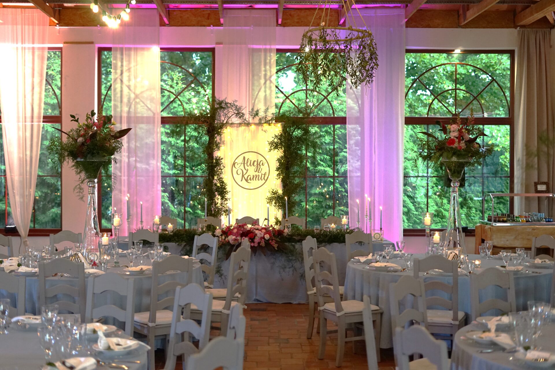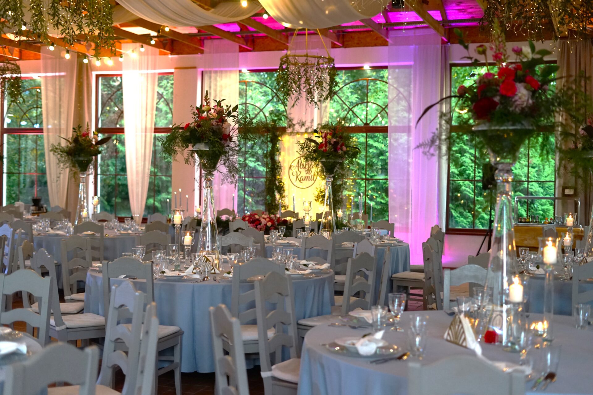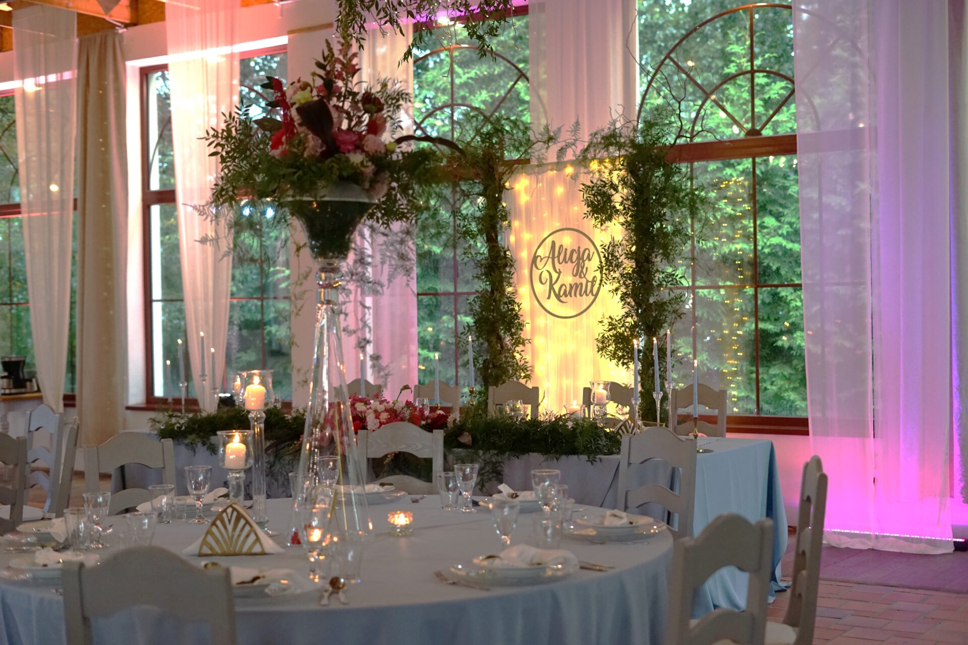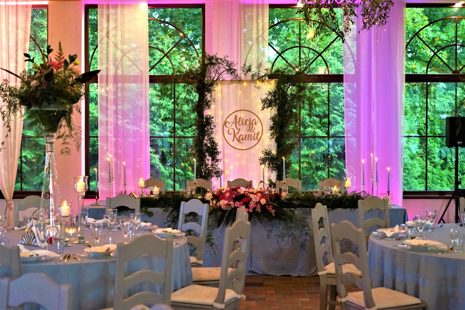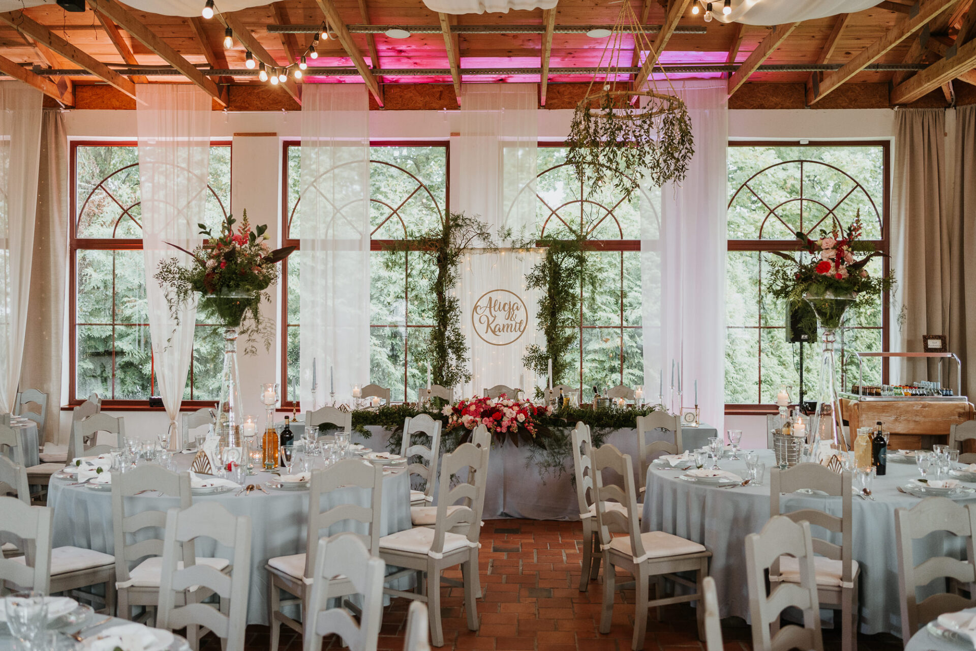 Stół Państwa młodych to nawiązanie do nazwy sali weselnej. Za Parą młodą utworzyliśmy zieloną bramę z roślin oraz delikatnych lejących materiałów z ledowym oświetleniem i drewnianym kołem z imionami naszej pary. Z przodu stołu prezydialnego ułożyliśmy obszerną kompozycję florystyczną w kolorystyce malinowo-różowej z bordowymi akcentami. Całość dekoracji weselnej podbija profesjonalne oświetlenie architektoniczne.