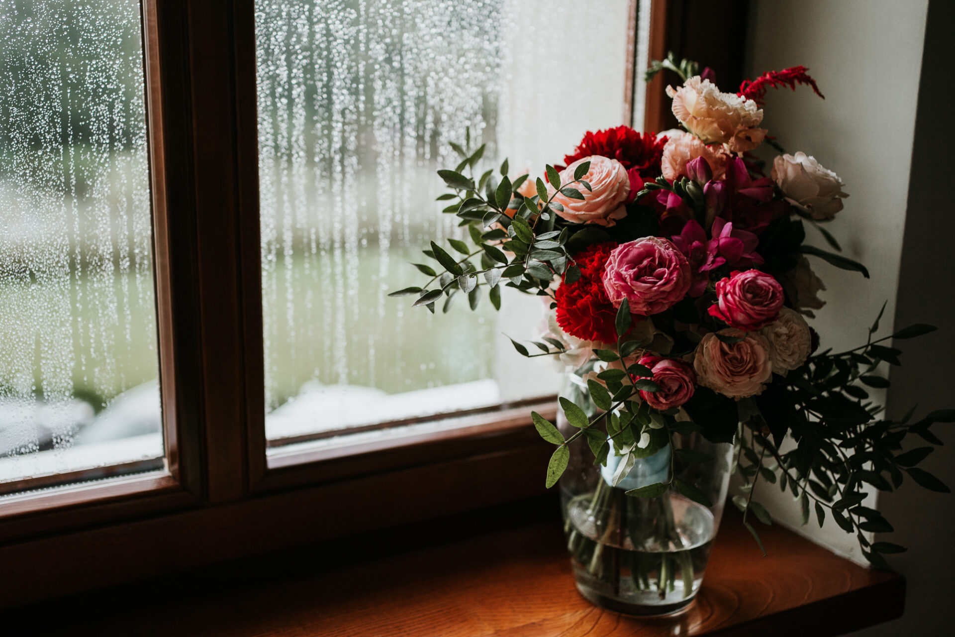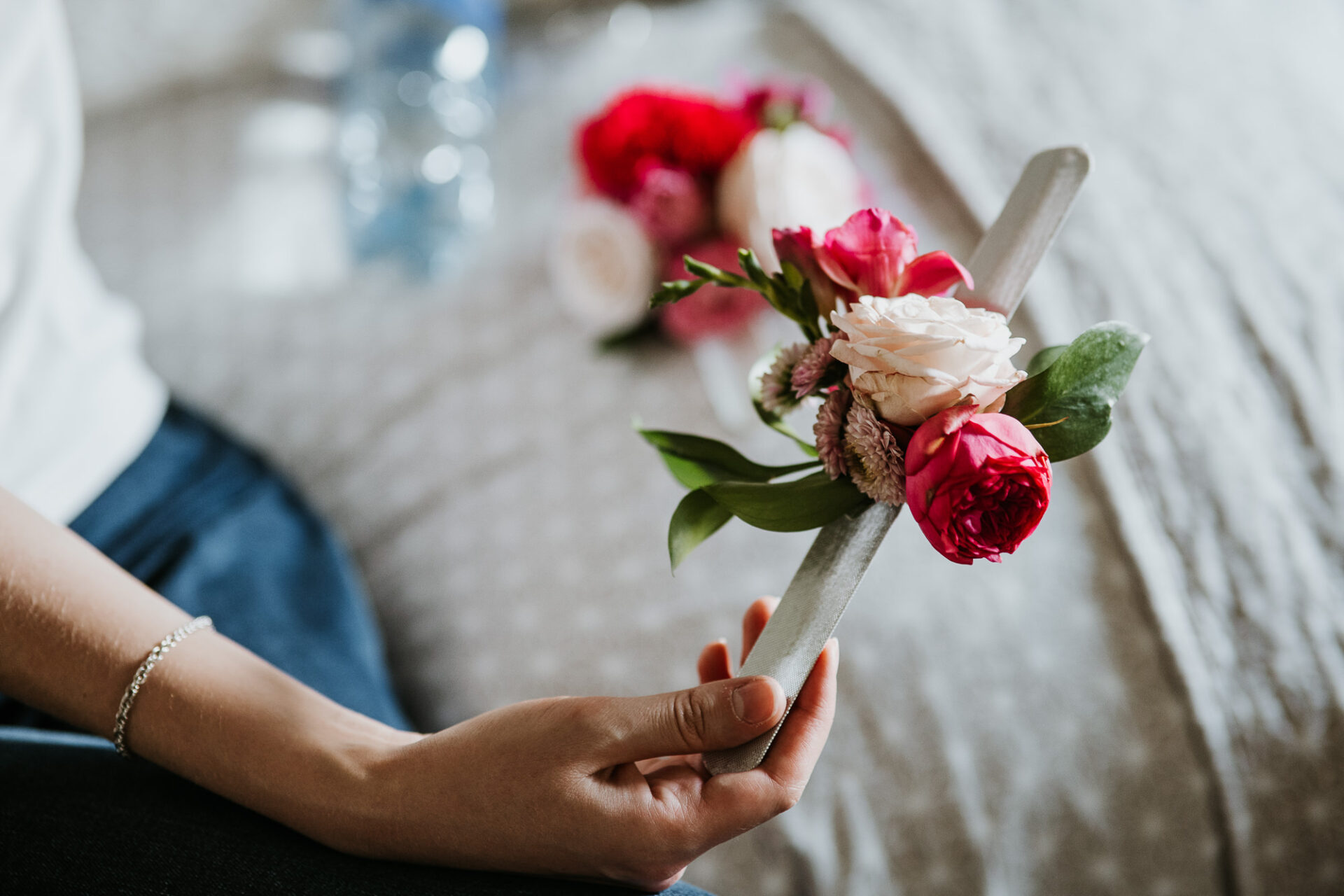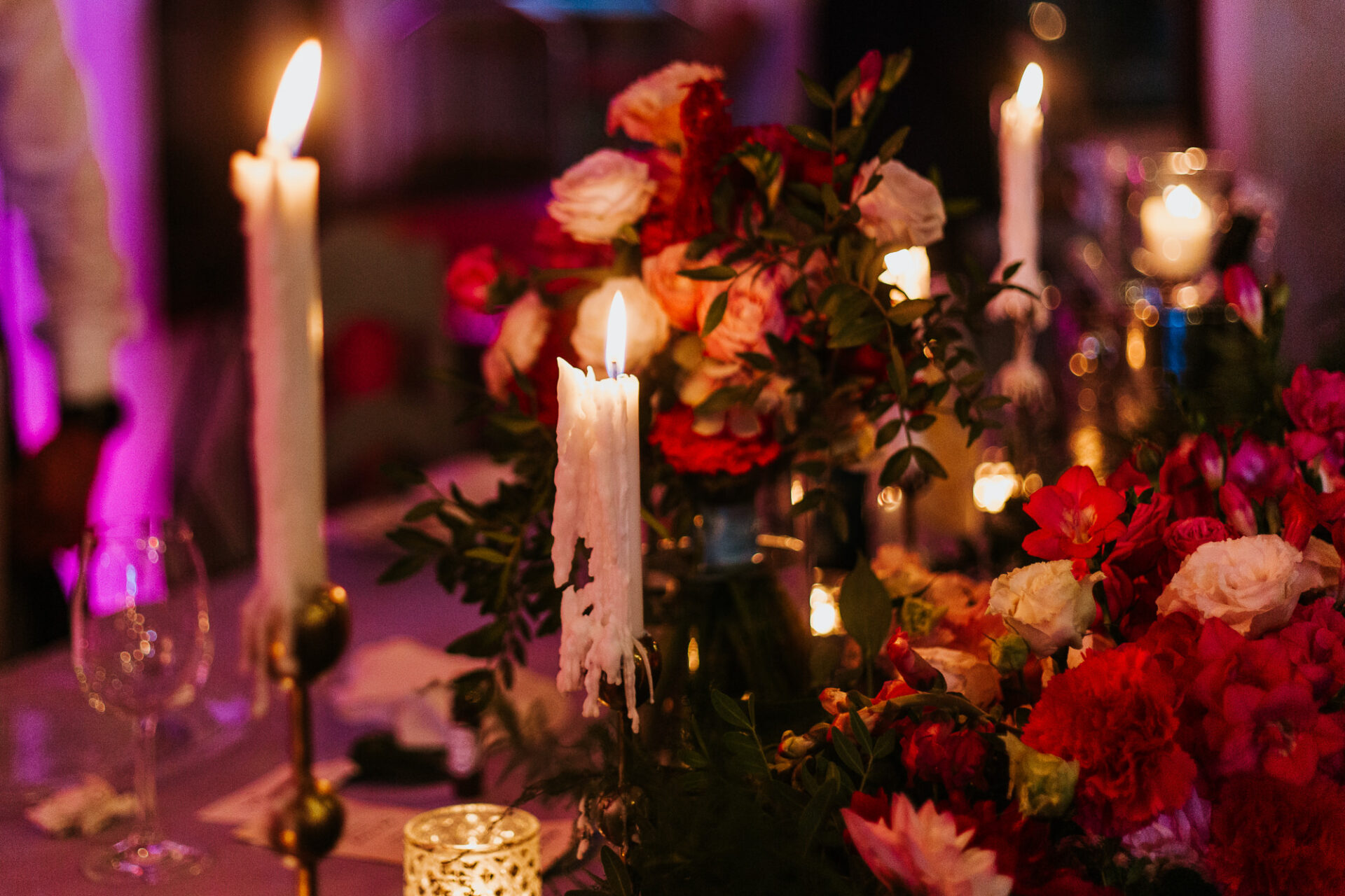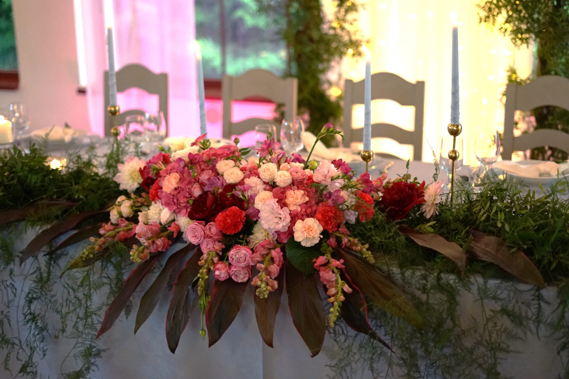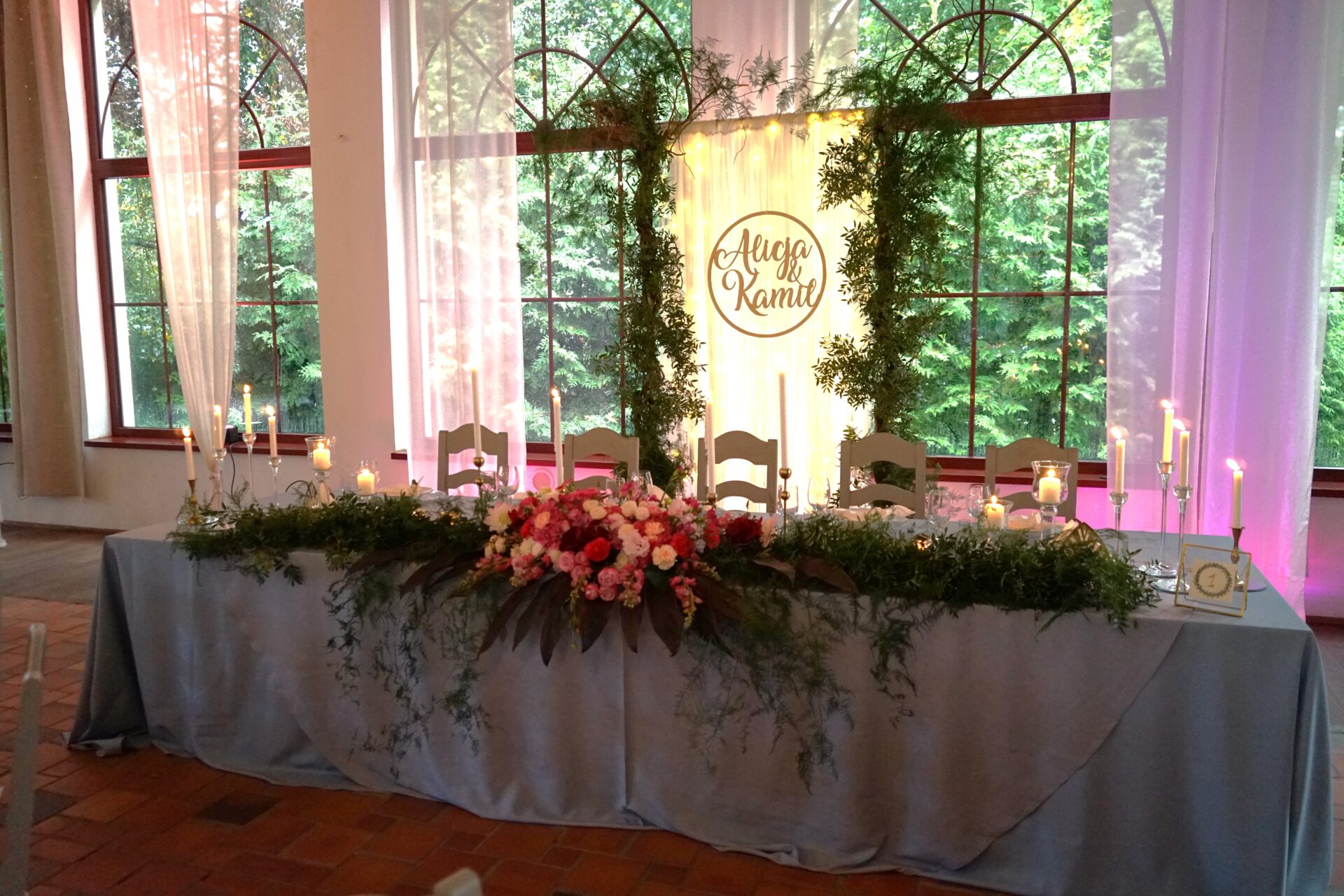 Stół Państwa młodych to nawiązanie do nazwy sali weselnej. Za Parą młodą utworzyliśmy zieloną bramę z roślin oraz delikatnych lejących materiałów z ledowym oświetleniem i drewnianym kołem z imionami naszej pary. Z przodu stołu prezydialnego ułożyliśmy obszerną kompozycję florystyczną w kolorystyce malinowo-różowej z bordowymi akcentami. Całość dekoracji weselnej podbija profesjonalne oświetlenie architektoniczne.