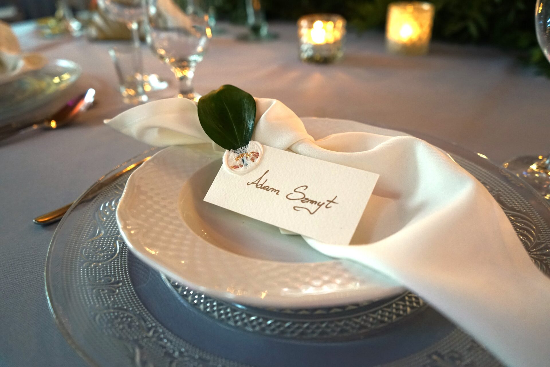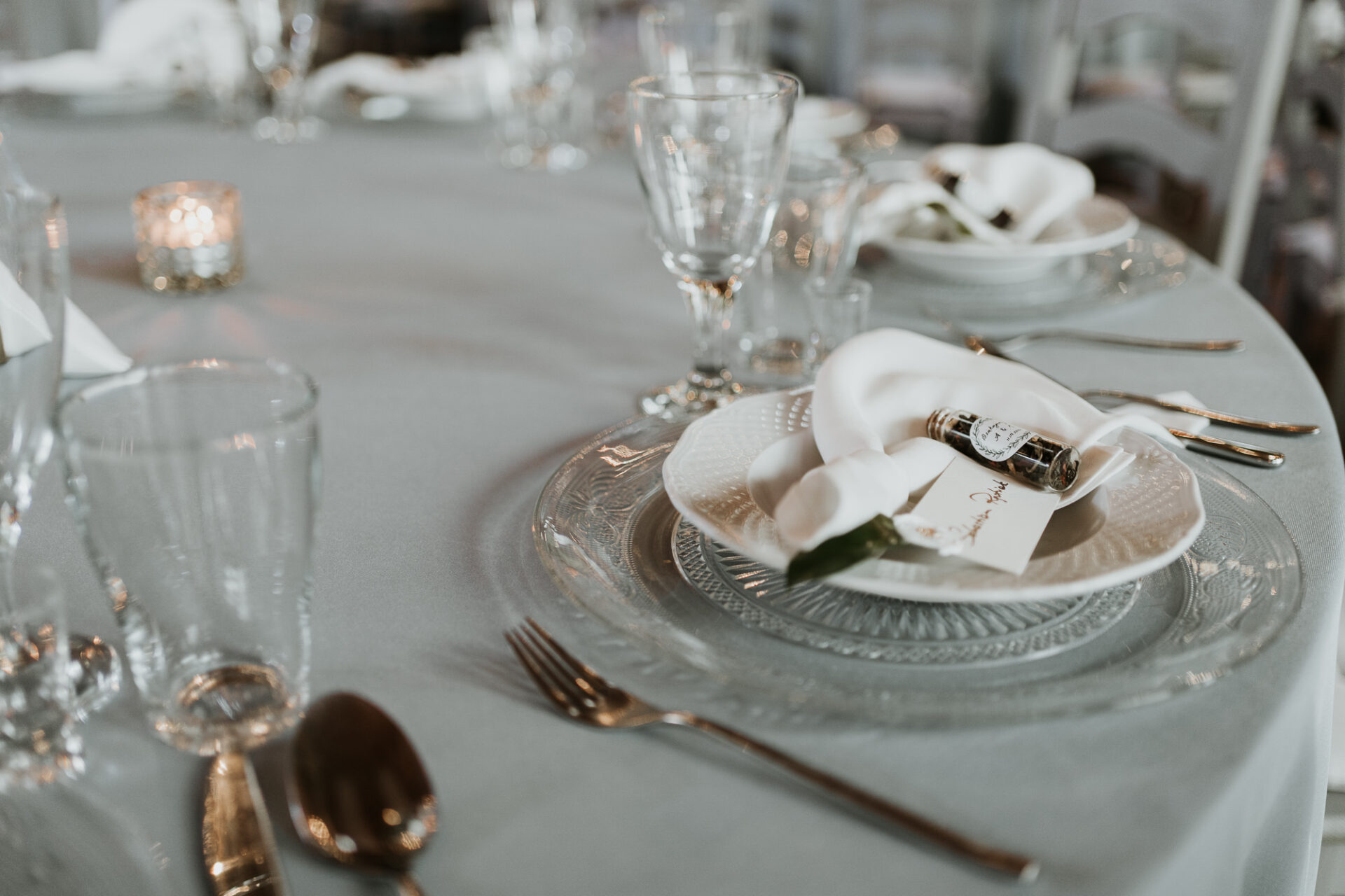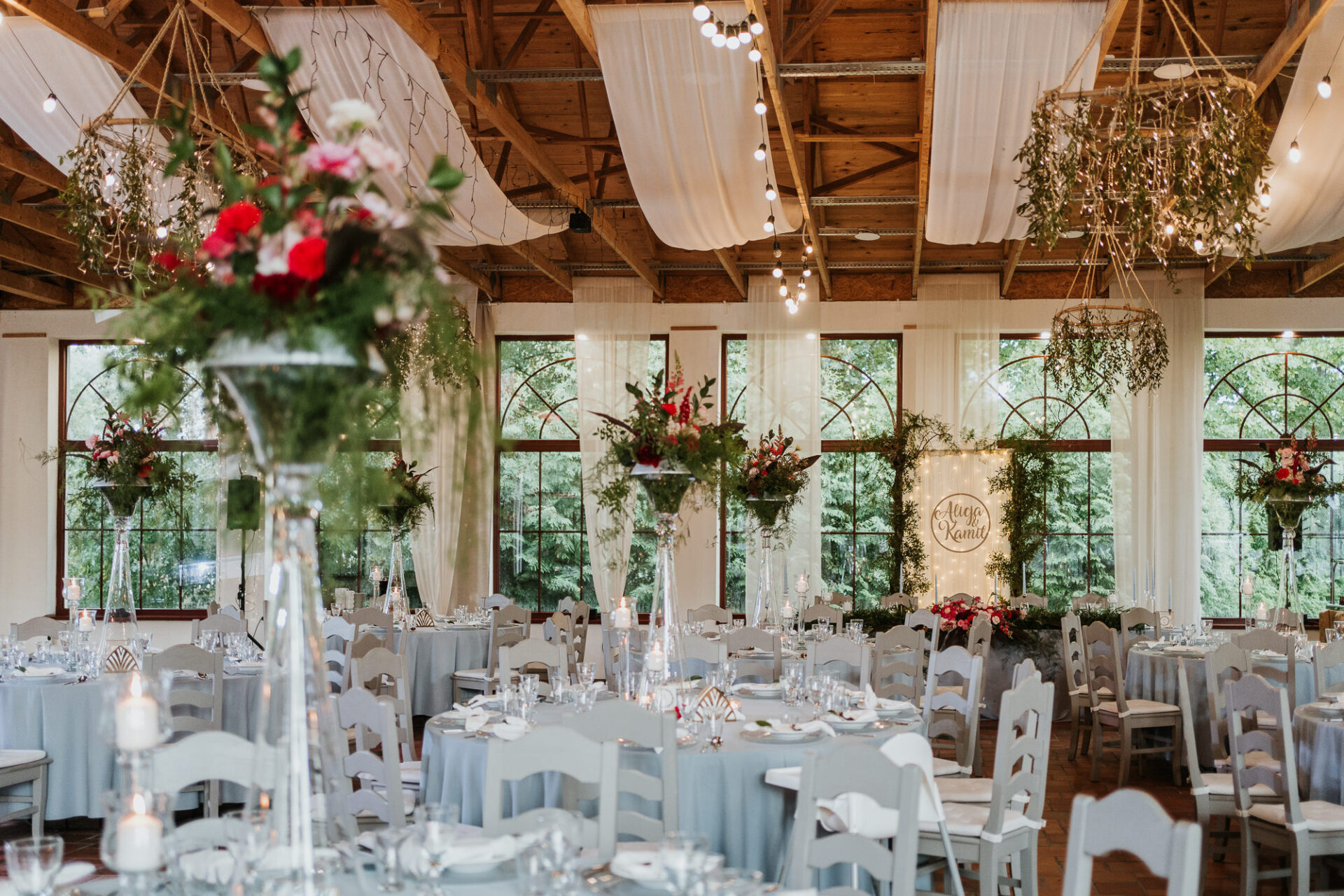 Sama sala weselna jest bardzo oranżeryjna, dlatego postanowiliśmy wykorzystać jej naturalne atuty, by podkreślić i wydobyć jej piękno. Szare krzesła z sali podkreśliliśmy obrusami w kolorze dusty blue, na stołach ustawiliśmy wysokie szklane wazony, na których szczycie umieściliśmy kompozycje florystyczne z dużą ilością zieleni i pachnących kwiatów. Dodatkowo, każde nakrycie miało piękny kryształowy pod-talerz z uroczym, eleganckim wzorem, białą serwetkę bankietową ułożoną w supełek, a na wierzchu położyliśmy winietkę z papieru czerpanego z listkiem i białym lakiem lekko pozłacanym. W koło wazonu postawiliśmy szklane świeczniki z grubymi świecami oraz złotą ramkę z numerem stołu i złoty serwetnik.
