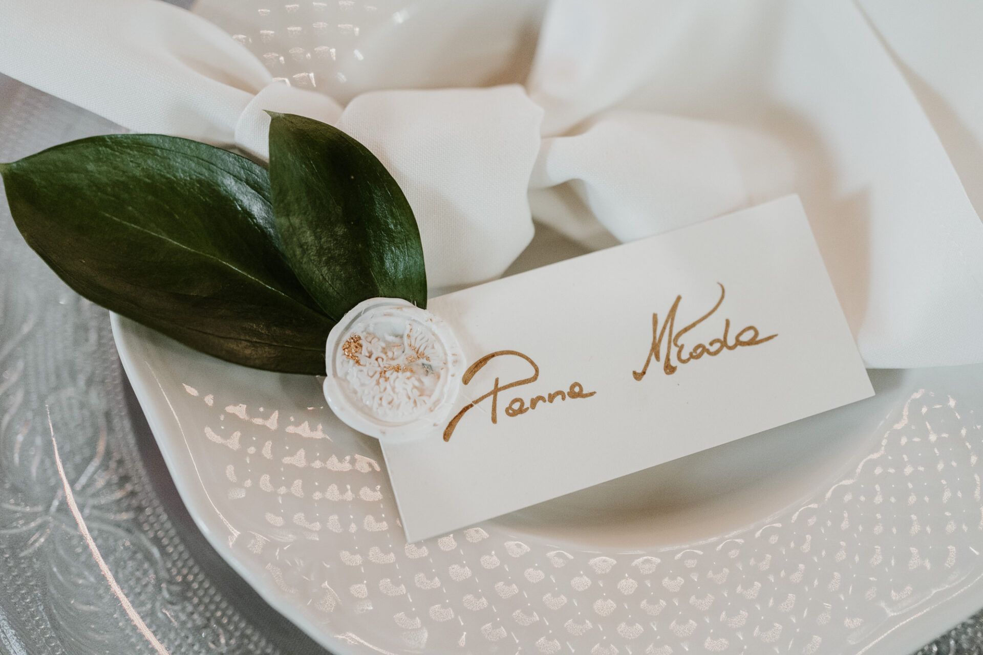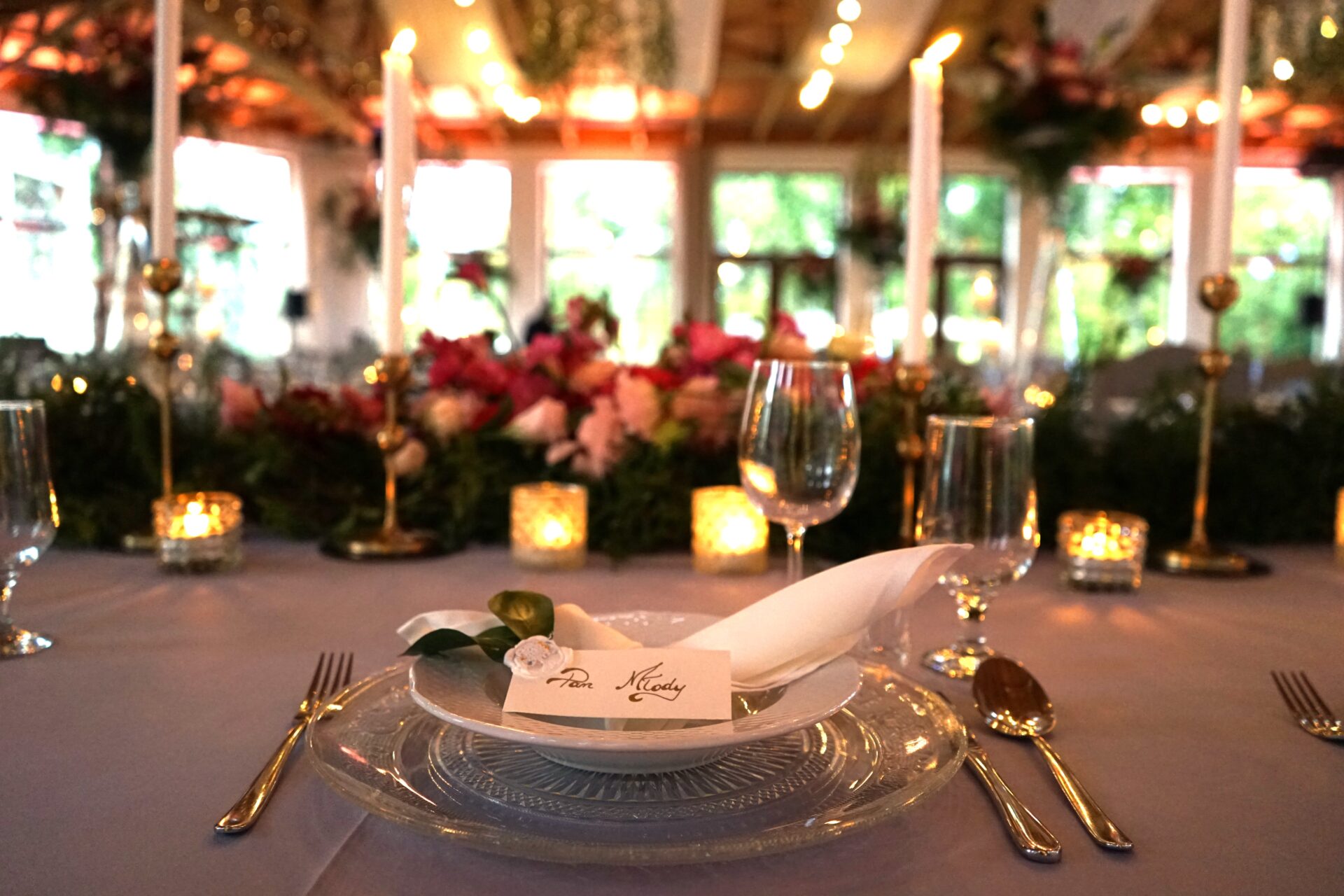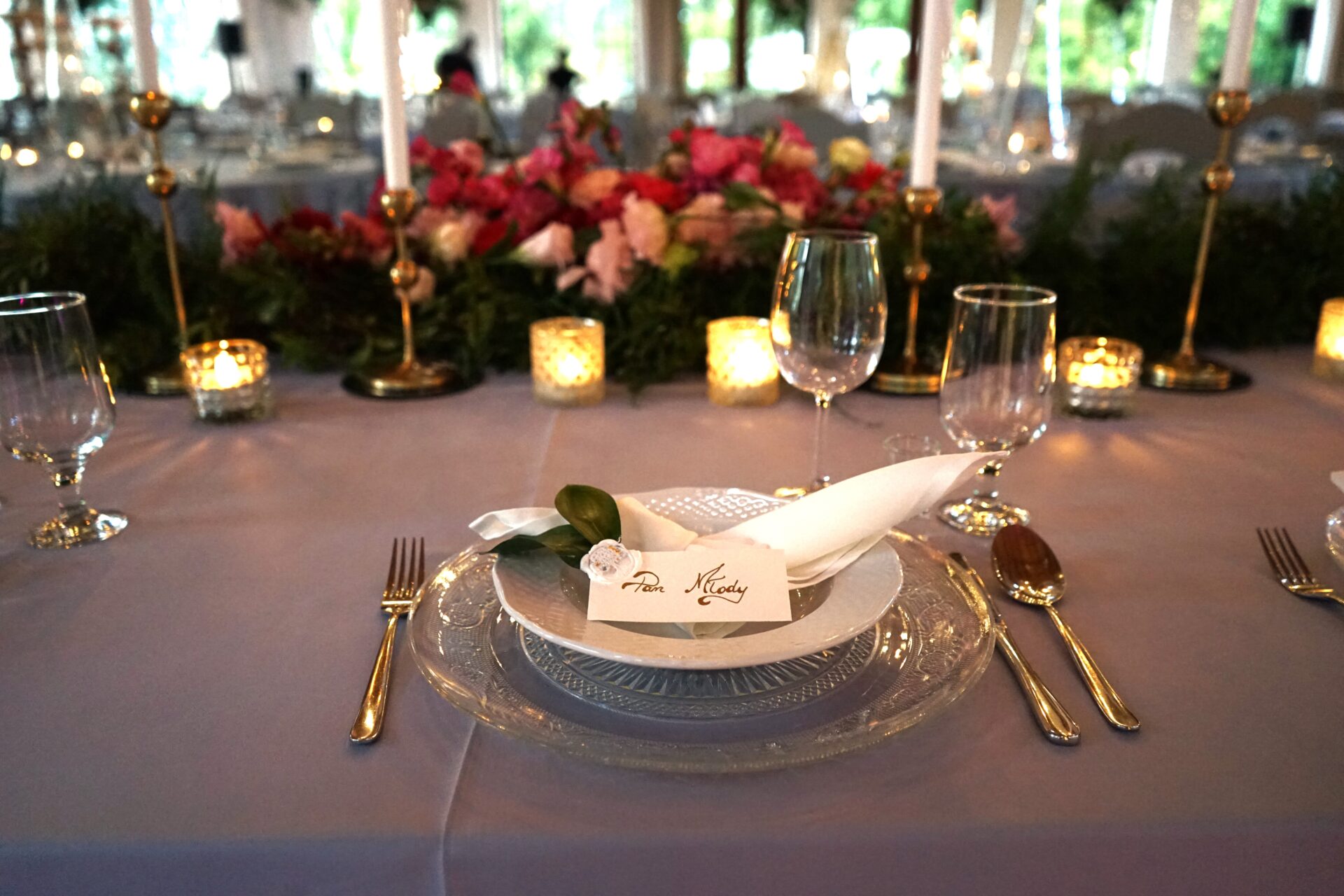 Sama sala weselna jest bardzo oranżeryjna, dlatego postanowiliśmy wykorzystać jej naturalne atuty, by podkreślić i wydobyć jej piękno. Szare krzesła z sali podkreśliliśmy obrusami w kolorze dusty blue, na stołach ustawiliśmy wysokie szklane wazony, na których szczycie umieściliśmy kompozycje florystyczne z dużą ilością zieleni i pachnących kwiatów. Dodatkowo, każde nakrycie miało piękny kryształowy pod-talerz z uroczym, eleganckim wzorem, białą serwetkę bankietową ułożoną w supełek, a na wierzchu położyliśmy winietkę z papieru czerpanego z listkiem i białym lakiem lekko pozłacanym. W koło wazonu postawiliśmy szklane świeczniki z grubymi świecami oraz złotą ramkę z numerem stołu i złoty serwetnik.