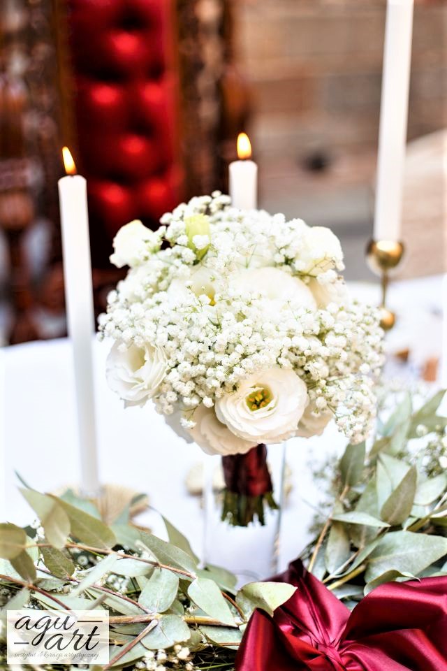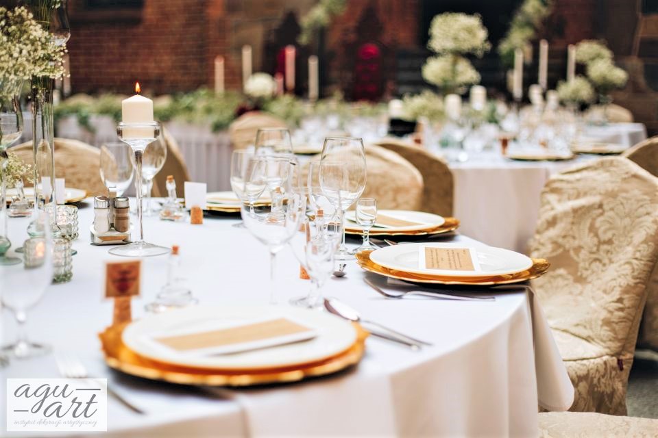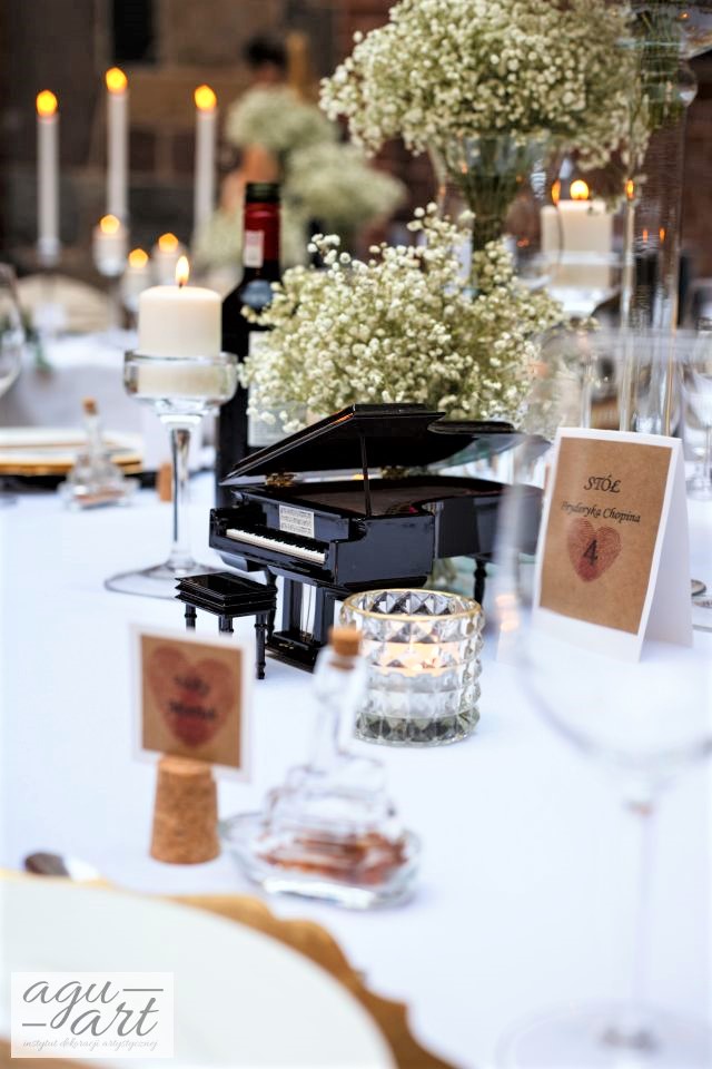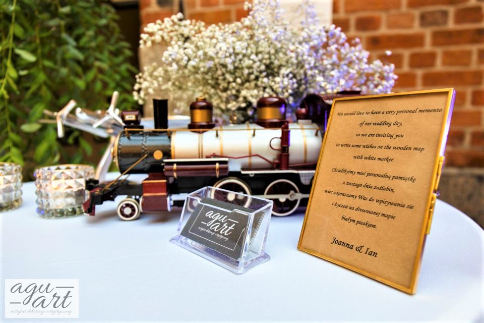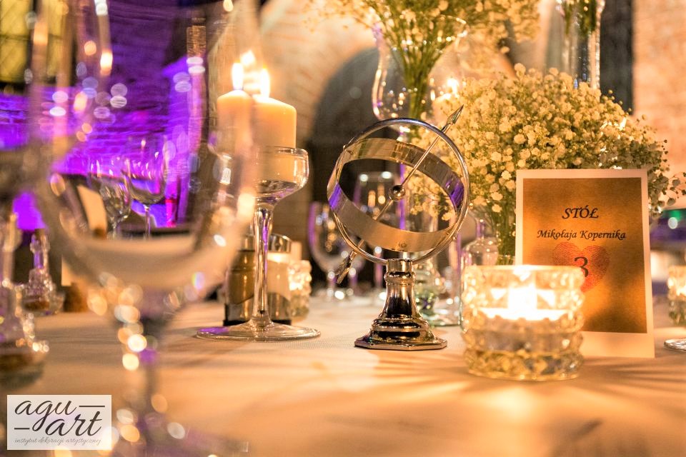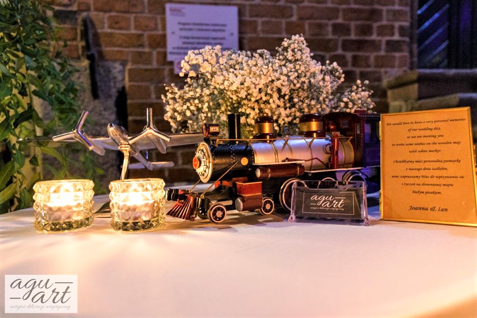 Złote pod-talerze, blask świec migocący poprzez szkło, szklane statki napełnione bursztynem jako upominki dla gości oraz elementy dekoracji związane z tematyką podróży tworzyły niepowtarzalny klimat. Do dekoracji wykorzystaliśmy stare walizki, globus, model lokomotywy czy choćby oryginalna księga gości w postaci dużej drewnianej tablicy z wyrysowanymi konturami kontynentów. Nawiązującą do królewskich foteli klamrą, była bordowa taśma użyta do bukietu Panny Młodej i dekoracji stołu prezydialnego.