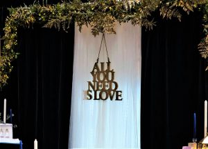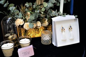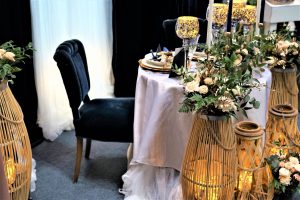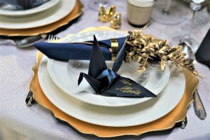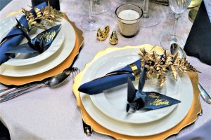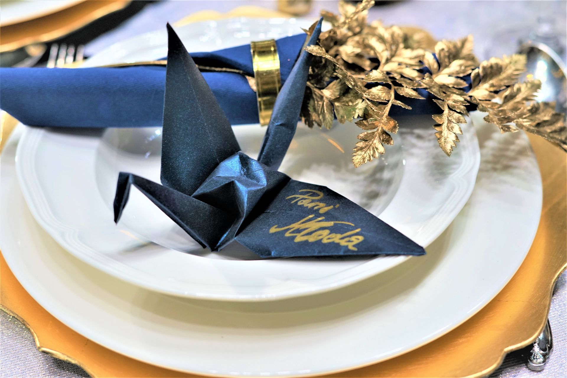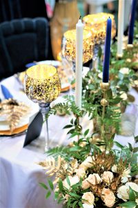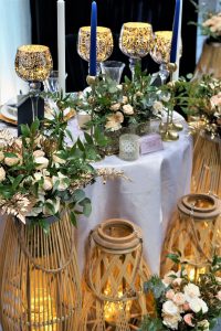 To dekoracja Ślubna dla odważnych. Dekoracja Ślubna, która zdecydowanie pokazuje temperament Pary Młodej. Ciemny granat połączyliśmy ze złotem. Na złotych pod-talerzach ustawiliśmy eleganckie porcelanowe talerze, na których ułożyliśmy winietkę w formie żurawia orgiami wypisanej złotym tuszem oraz granatową serwetkę ze złotą obrączką i farbowanym liściem paproci. Za Parą Młodą ustawiliśmy ściankę z aksamitno- tiulowym materiałem oraz piękną roślinną girlandą przetkana oświetleniem LED. Na Jej środku zawiesiliśmy złoty napis „All you need is love”, jako hasło naszej Pary. Bambusowe lampiony na przedzie stołu prezydialnego, w które włożyliśmy bukiety kwiatów, przełamują nam styl dekoracji, wprowadzając trochę luzu i wakacyjnego powiewu. Nie brakło również świeczników i świec, które wprowadzały tutaj nastrój intymności. Dla Naszej Panny Młodej zaprojektowaliśmy również, piękne kolczyki z kryształkami Svarowskiego.