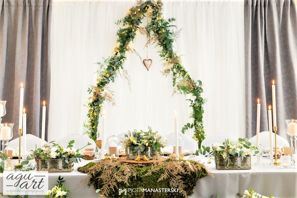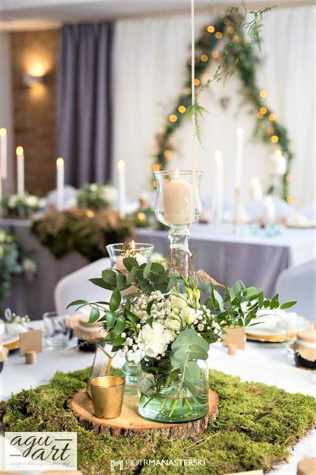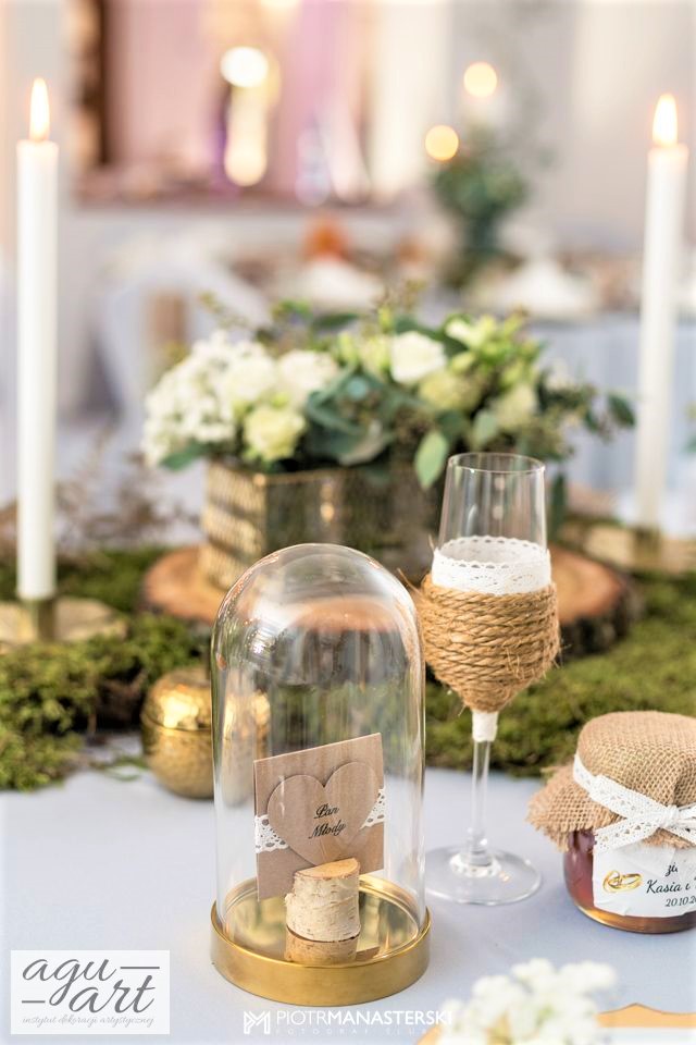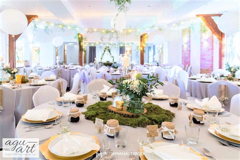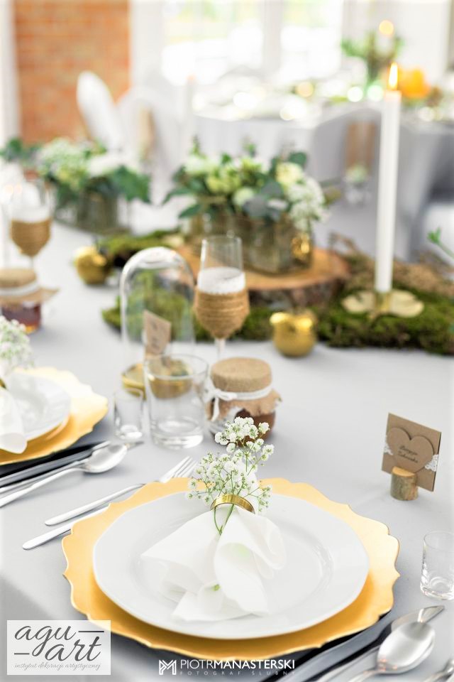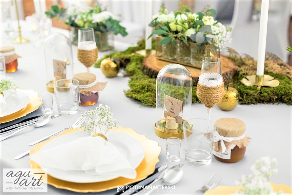 Złote Runo to dekoracja ślubna sali weselnej w Restauracji "nad Jeziorem Jeleń" w Bytowie przygotowana dla Kasi i Witka. Do jej przygotowania wykorzystaliśmy zarówno elementy rustykalne jak i glamour, co pozwoliło nam na nietuzinkowe odzwierciedlenie natury nowożeńców. Te elementy to Drewno, mech, juta, koronki przeplatane złotem w postaci eleganckich pod-talerzy, złotych ramek, świeczników, i farbowanych roślin. Bogactwo natury. Połączenie to powoduje, że znajdując się w eleganckiej restauracji jednocześnie odczuwamy naturę lasu. Ten nietuzinkowy wystrój wnętrza doceniła nie tylko para młoda, ale też goście i właściciele Restauracji ” Nad Jeziorem Jeleń”.