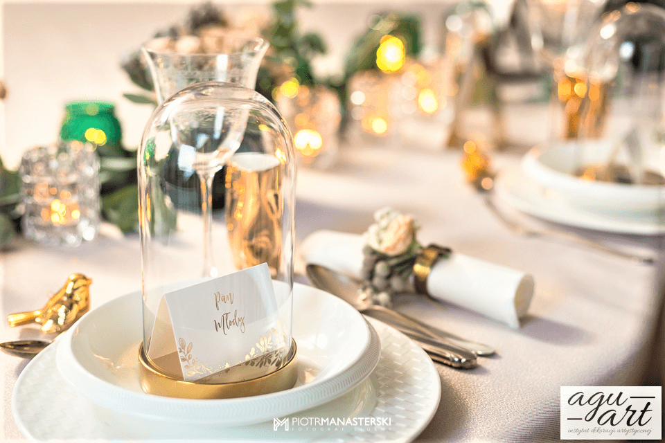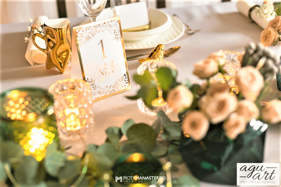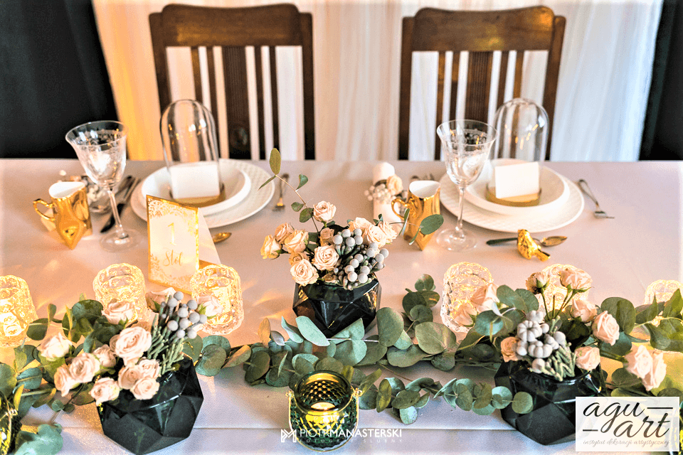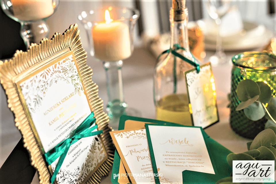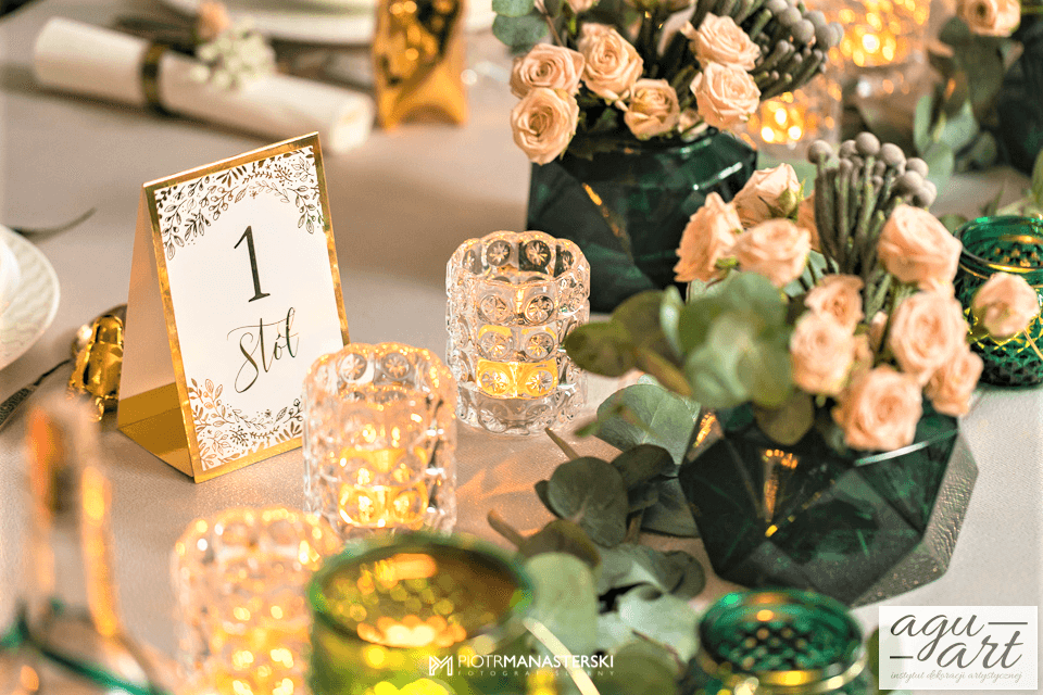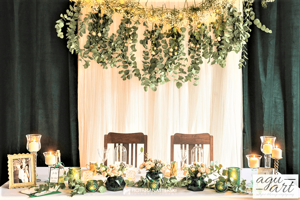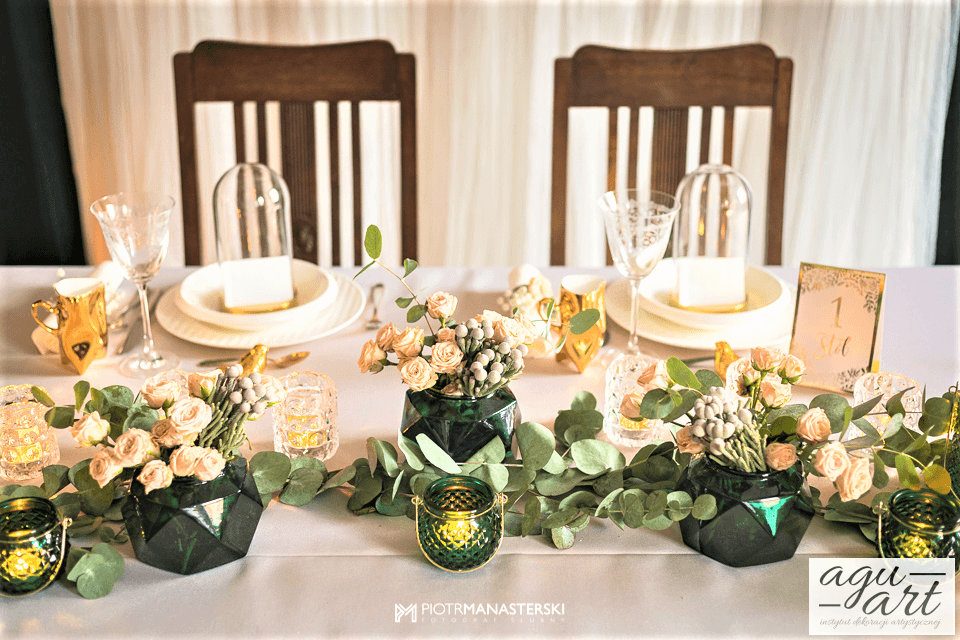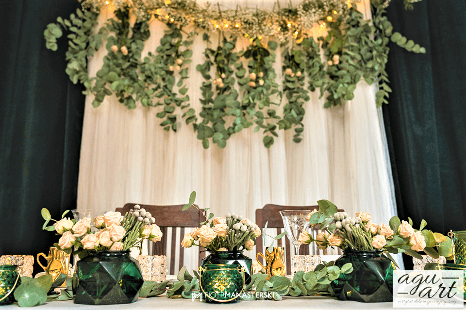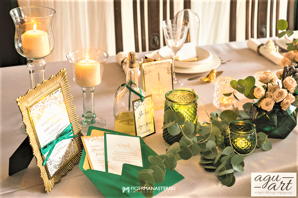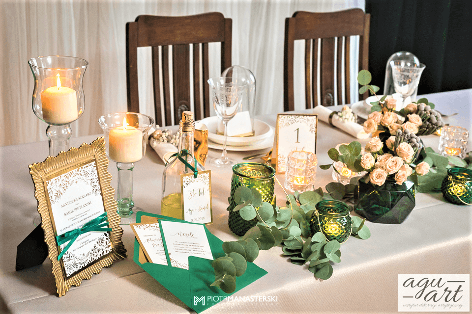 Złoto i głęboka zieleń to kolory tej dekoracji ślubnej. Prostota i elegancja w jednym. Wystrój doskonale podkreślający podniosłość chwili sprawiający, że Para Młoda oraz ich goście czuli się wyjątkowo. Butelkowa zieleń to kolor niezwykle elegancki, a zarazem tajemniczy. Złoto nadaje mu nonszalancji i wyjątkowości. To dekoracja ślubna, która odzwierciedla Pary z niezwykłym poczuciem estetyki piękna oraz temperamentne charaktery.