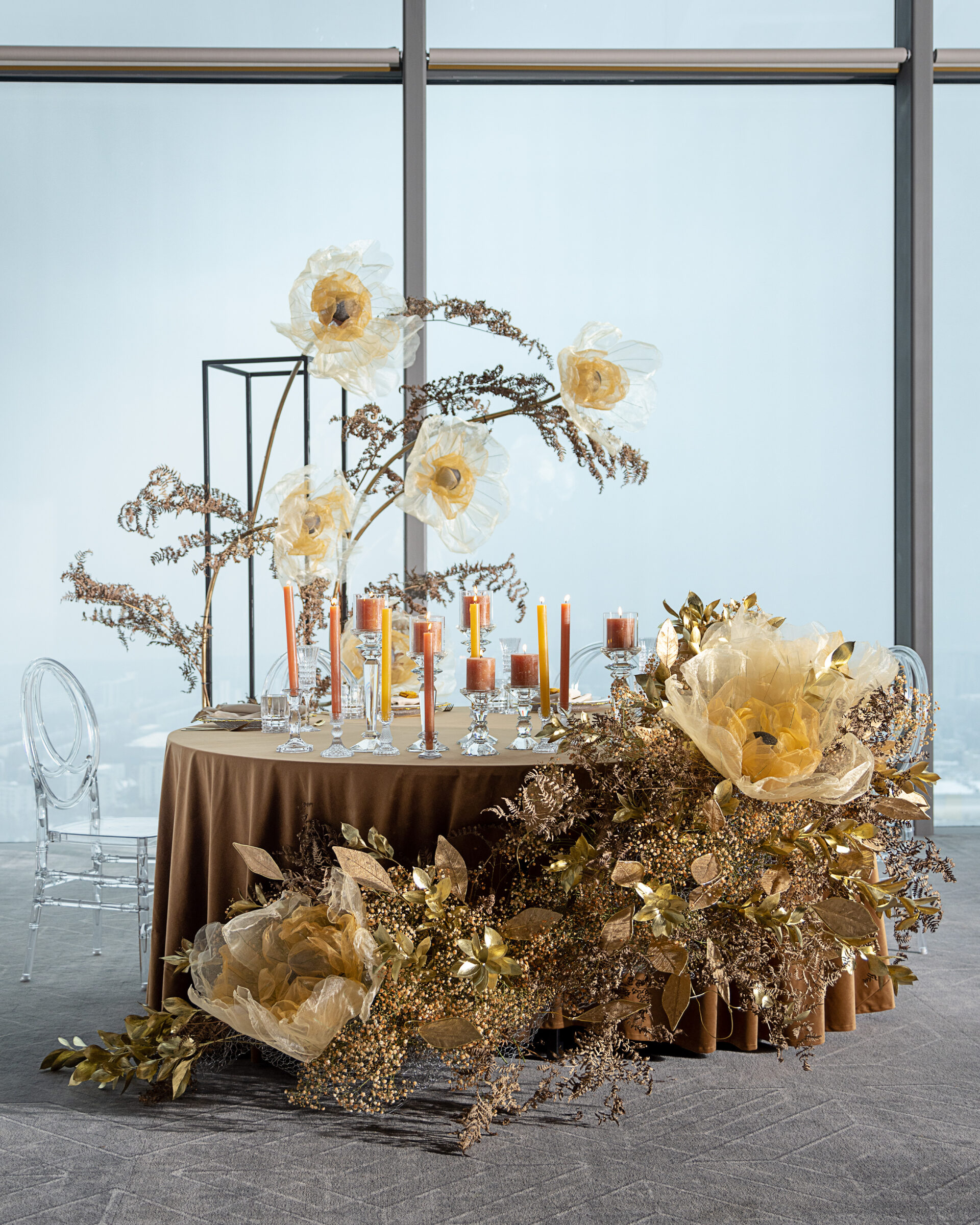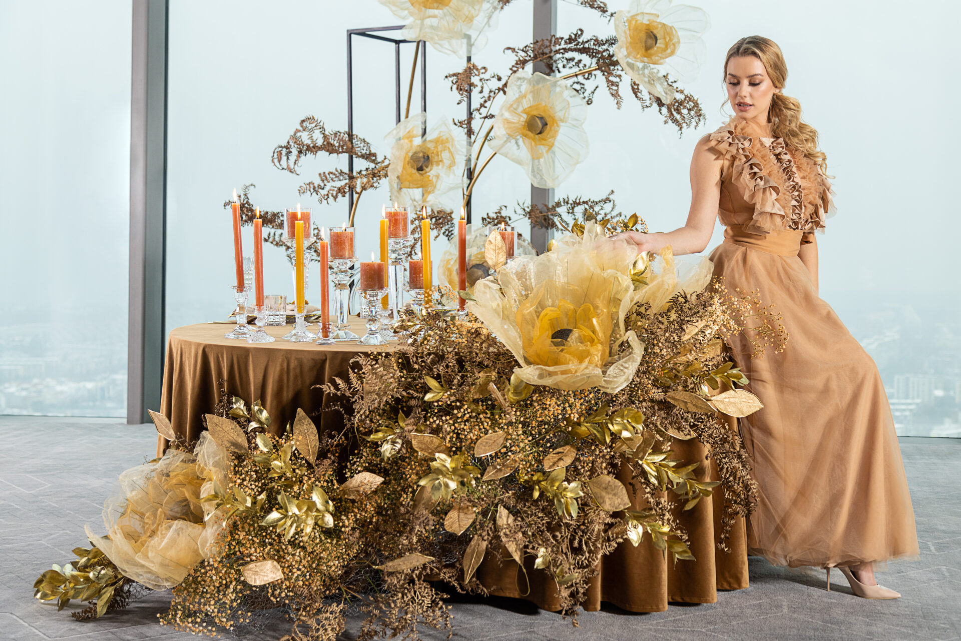 Miodowe kwiaty giganty to projekt scenografii ślubnej łączący w sobie wiele luksusowych elementów aranżacyjnych w przestrzeniach Olivia Star. Kolorystyka zawarta w tym projekcie ślubnym poczynając od jaśniutkiego beżu, przechodząc przez złoto, aż do rudości pokazuje gradient bardzo ciepłej palety koloru. Kryształowe świeczki na uroczystości weselnej dodają blasku i światła. Faktura welurowego obrusu nadaje przytulności.. Detale w postaci świeczek z wosku pszczelego w kształcie różyczek i złote obrączki na serwety dodają eleganckiego charakteru uroczystości ślubnej. Jest to idealna scenografia do wysokich wnętrz jakim jest sala na 34 piętrze Olivii Star w Gdańsku. Sala weselna może zachwycić poprzez odpowiedni dobór dekoracji ślubnych. Scenografia, na którą patrzycie to aranżacja przygotowana pod kampanię promująca pierwszą edycje targów ślubnych Olivia Star Bridal Fashion Show organizowanych przez Gdańską Orchideę i Dorotę Janicką- Kurlendę. Nasze Miodowe kwiaty giganty podbiły Wasze serca podczas styczniowej edycji. Doskonale podkreślają charakter i rangę wydarzenia nadając jej luksusowy wyraz i designerski styl. Suknia widniejąca na zdjęciach pochodzi z kolekcji Ismeny Warszawskiej, fantastycznej trójmiejskiej projektantki. W ostatnich latach widnieje wyraźny trend na wyjątkowe, gabarytowe dekoracje ślubne. Fotografie wykonał Ivo Ledwożyw.