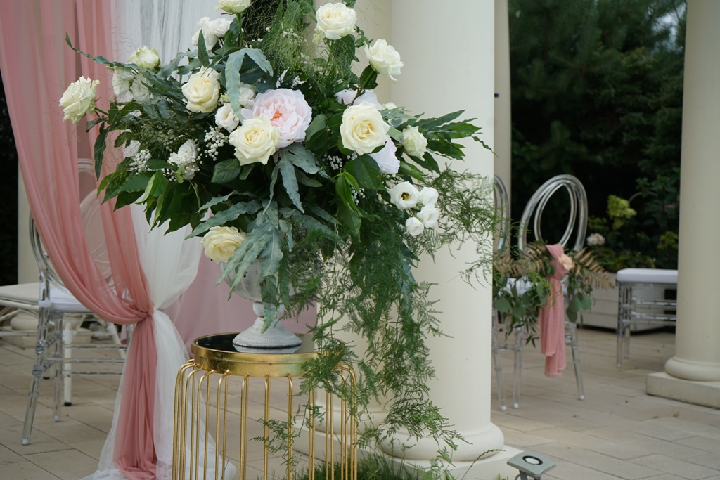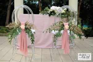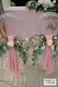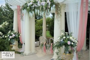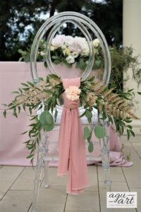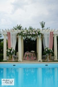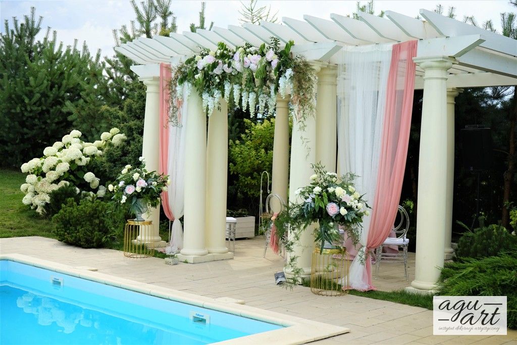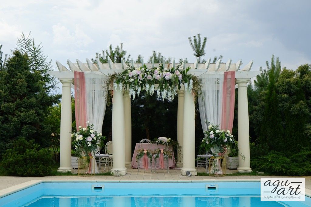 Dekoracja ślubna w plenerze - Francuska riviera to projekt który stworzyliśmy dla Magdaleny i Gildasa w Rezydencji Miętowe Wzgórza. Jest to dekoracja ślubu w plenerze, w altanie nad basenem w urokliwym ogrodzie Rezydencji. Nawiązując do dekoracji sali weselnej postawiliśmy na kolorystykę pudrowo różową, co pięknie podkreślało lazur wody.