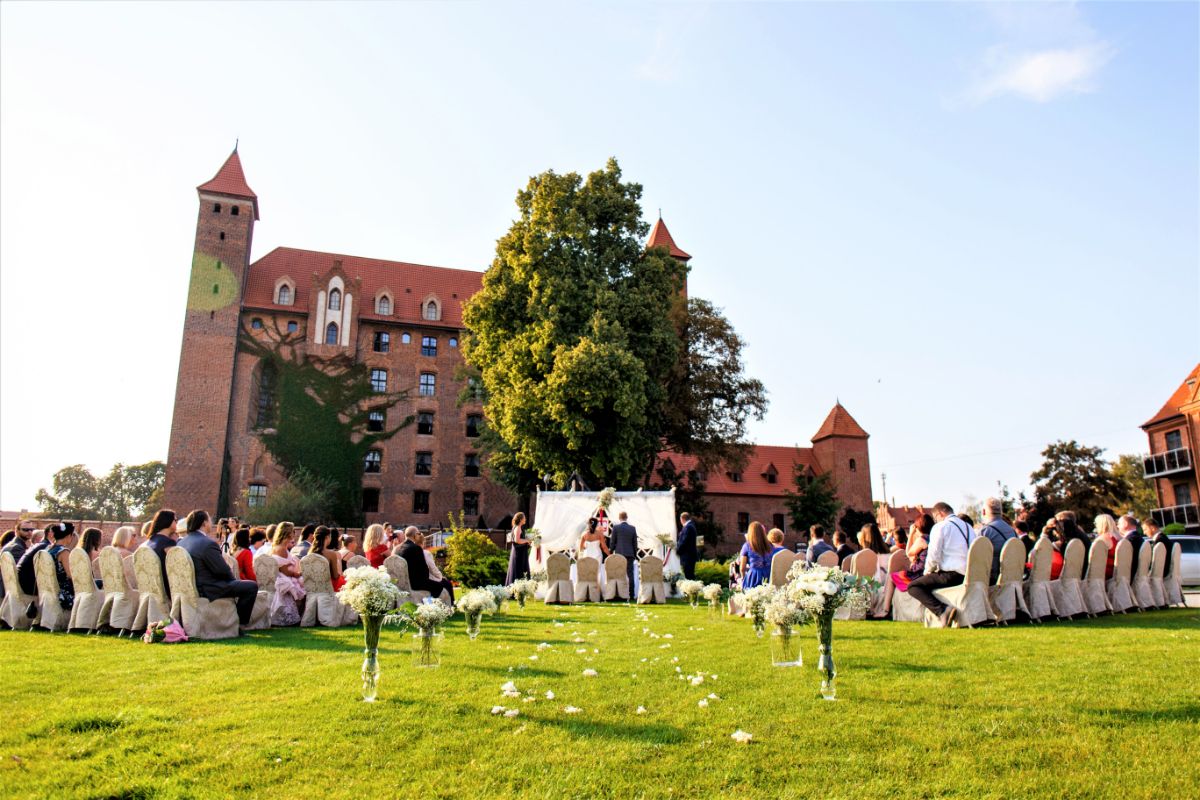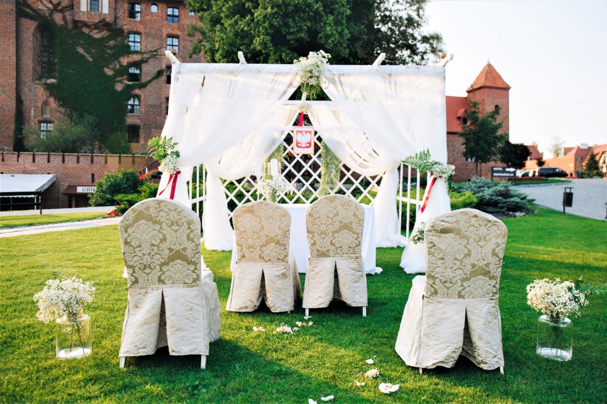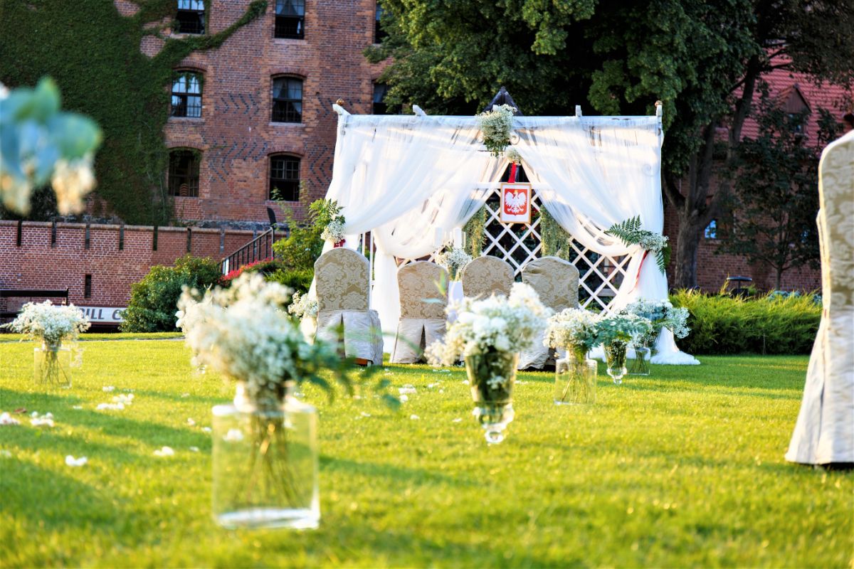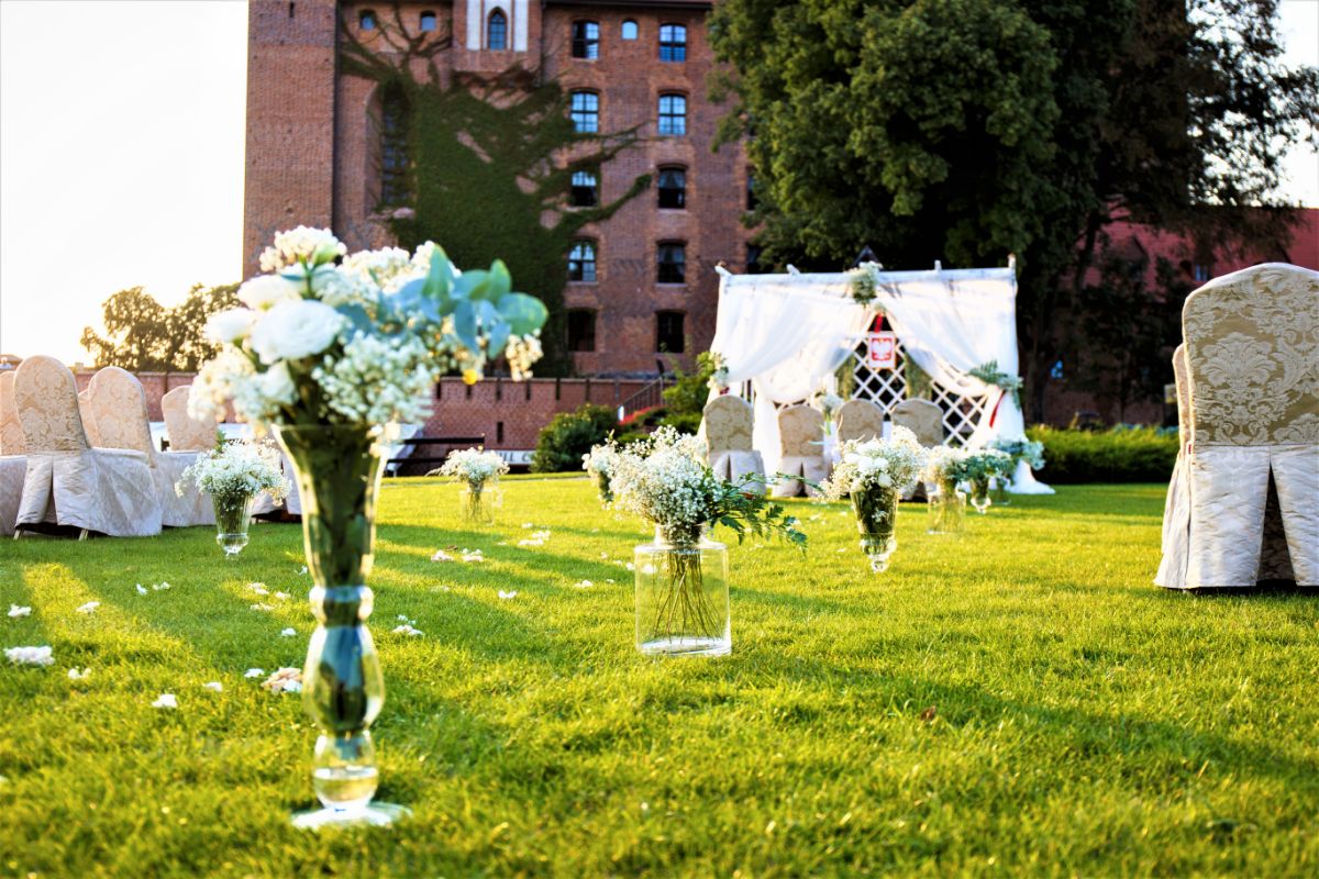 Ślub w plenerze "Z Zamkiem w tle" to uroczystość Joanny i Iana zrealizowana w ogrodzie Zamku w Gniewie. Piękna przestrzeń z Zamkiem w tle, była idealną podstawą do tego projektu ślubnego. Delikatne tiulowe materiały zebraliśmy po bokach altanki, przyozdobiliśmy gipsówką i liśćmi paproci, tworząc elegancką, zwiewną kompozycje dekoracyjną.