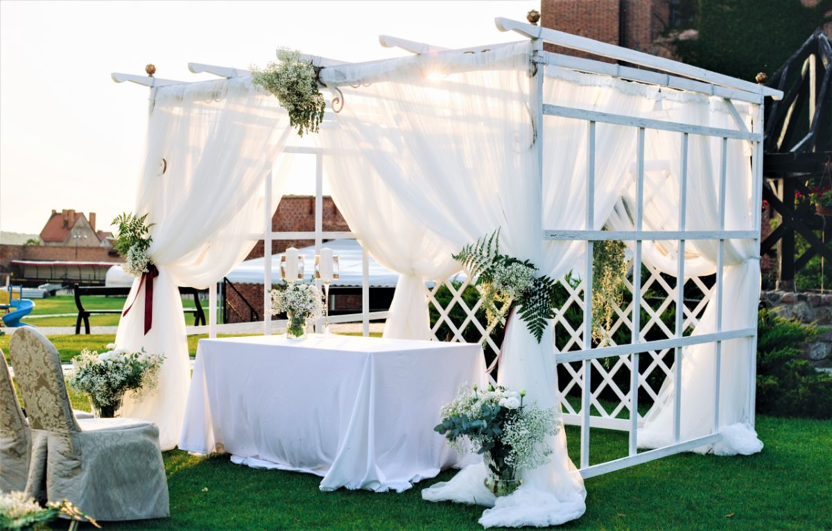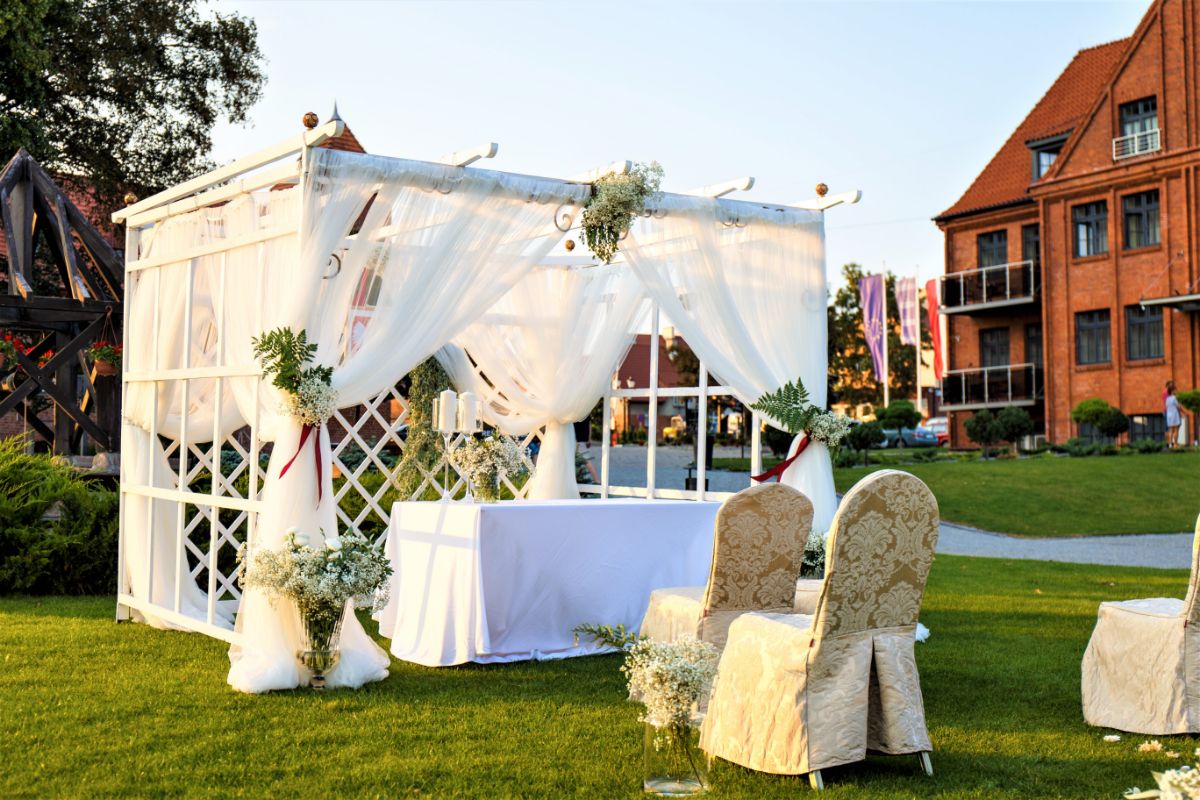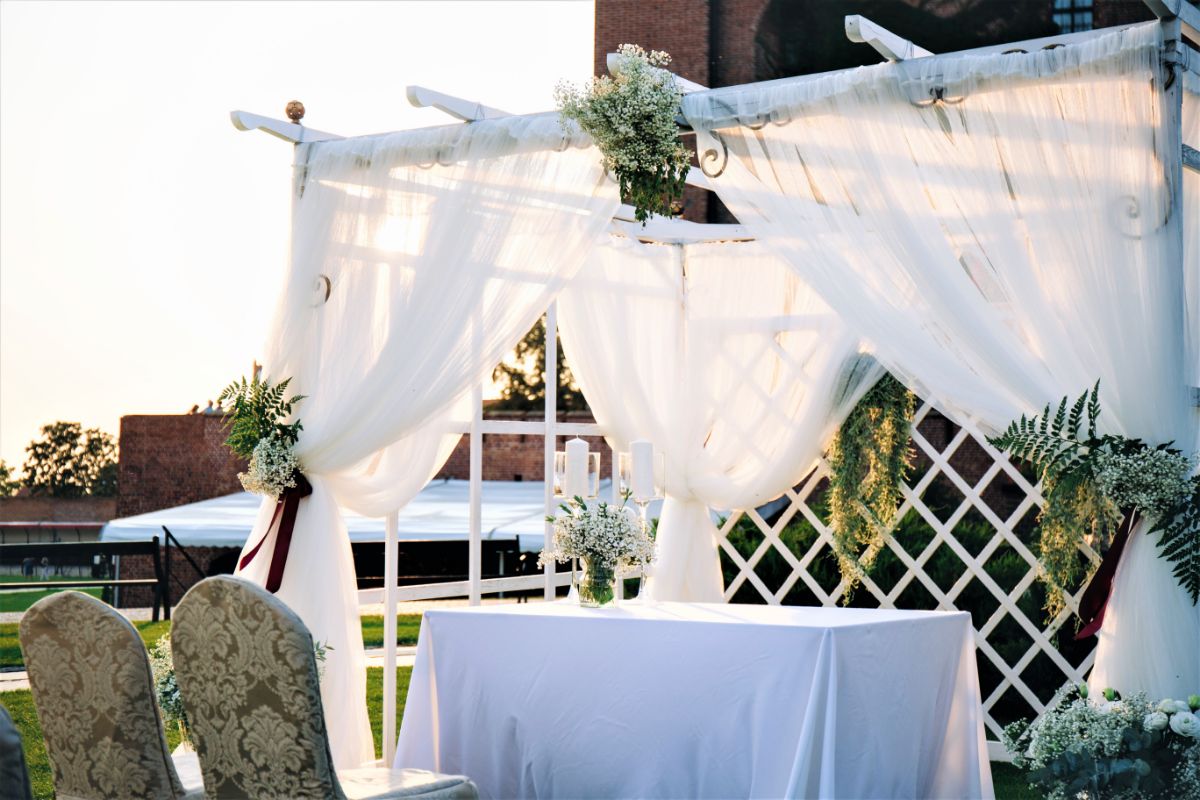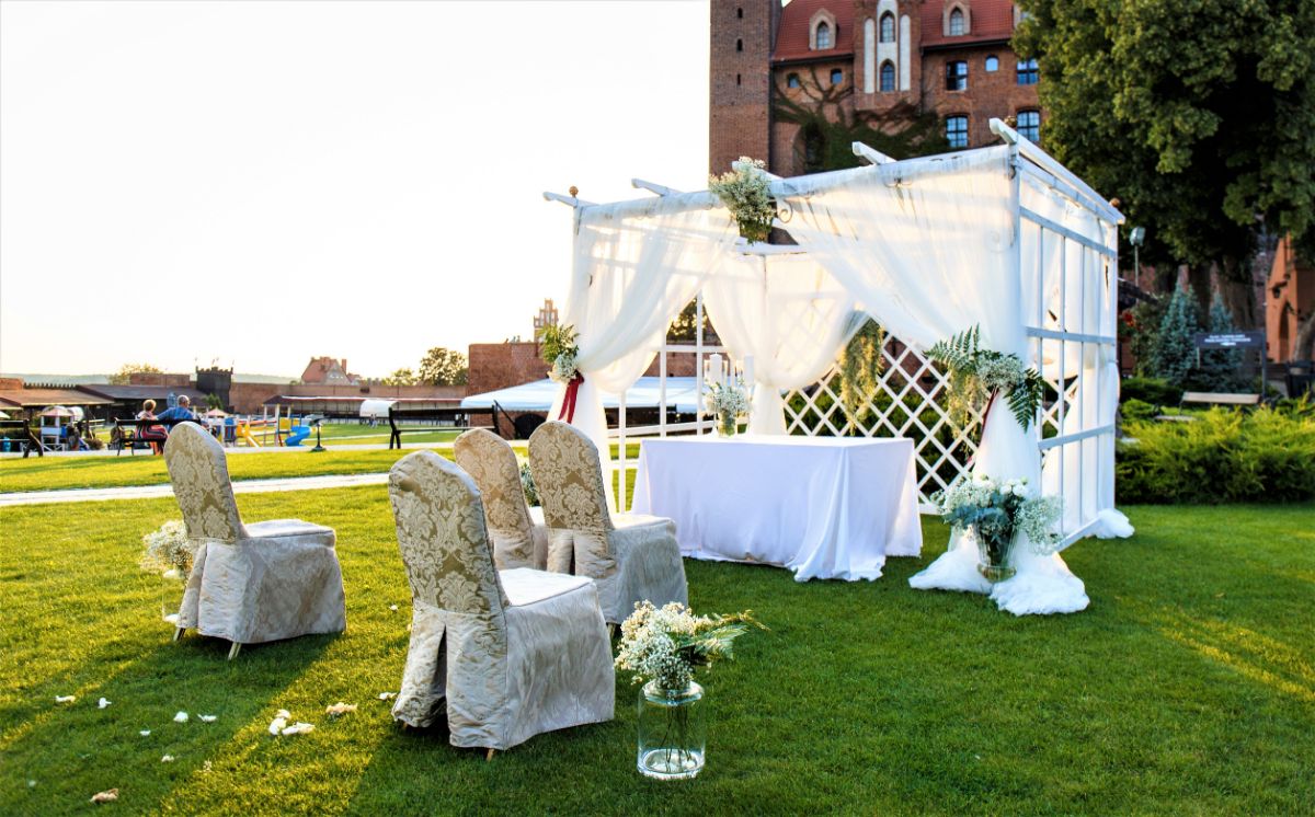 Ślub w plenerze "Z Zamkiem w tle" to uroczystość Joanny i Iana zrealizowana w ogrodzie Zamku w Gniewie. Piękna przestrzeń z Zamkiem w tle, była idealną podstawą do tego projektu ślubnego. Delikatne tiulowe materiały zebraliśmy po bokach altanki, przyozdobiliśmy gipsówką i liśćmi paproci, tworząc elegancką, zwiewną kompozycje dekoracyjną.